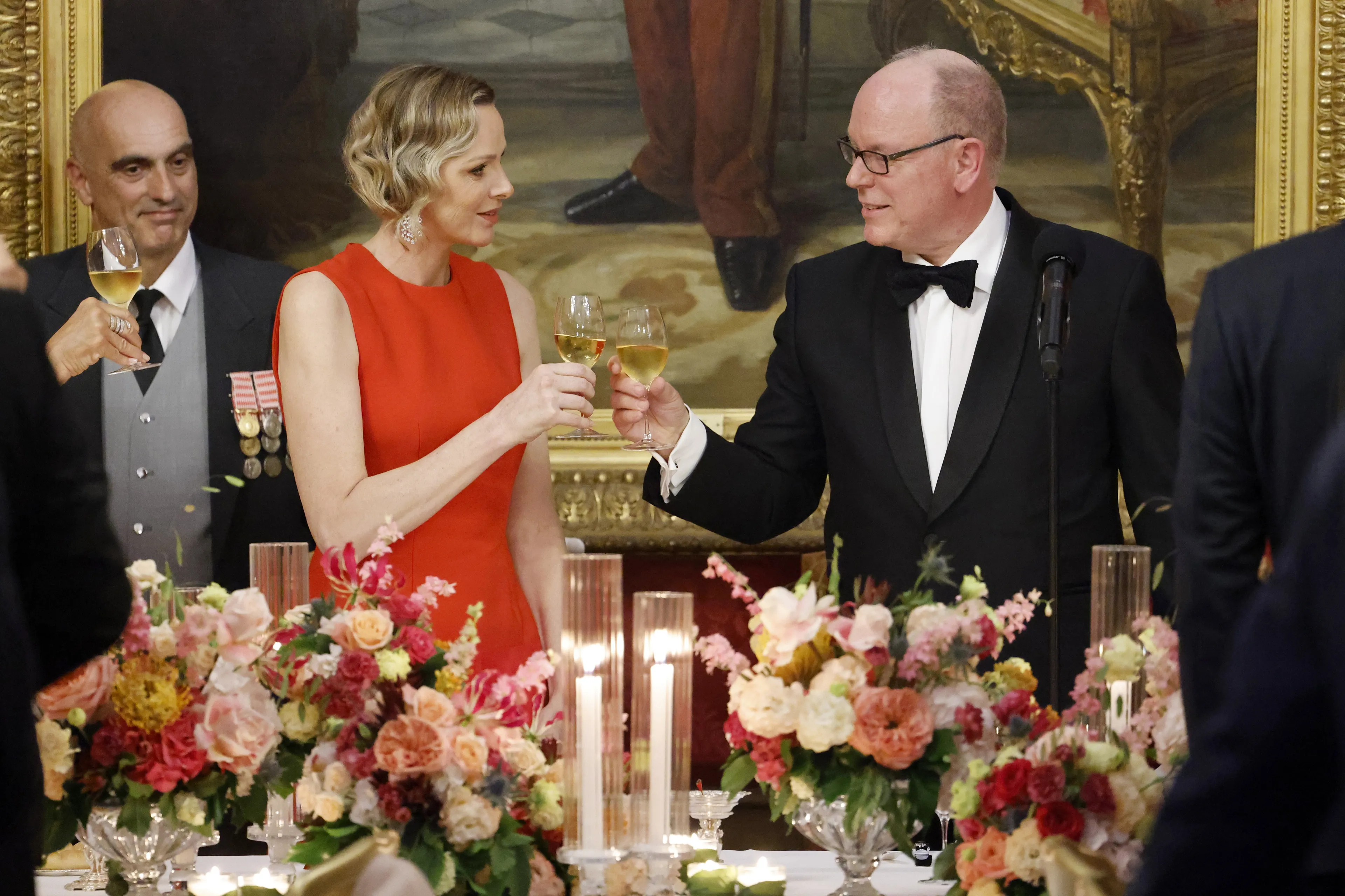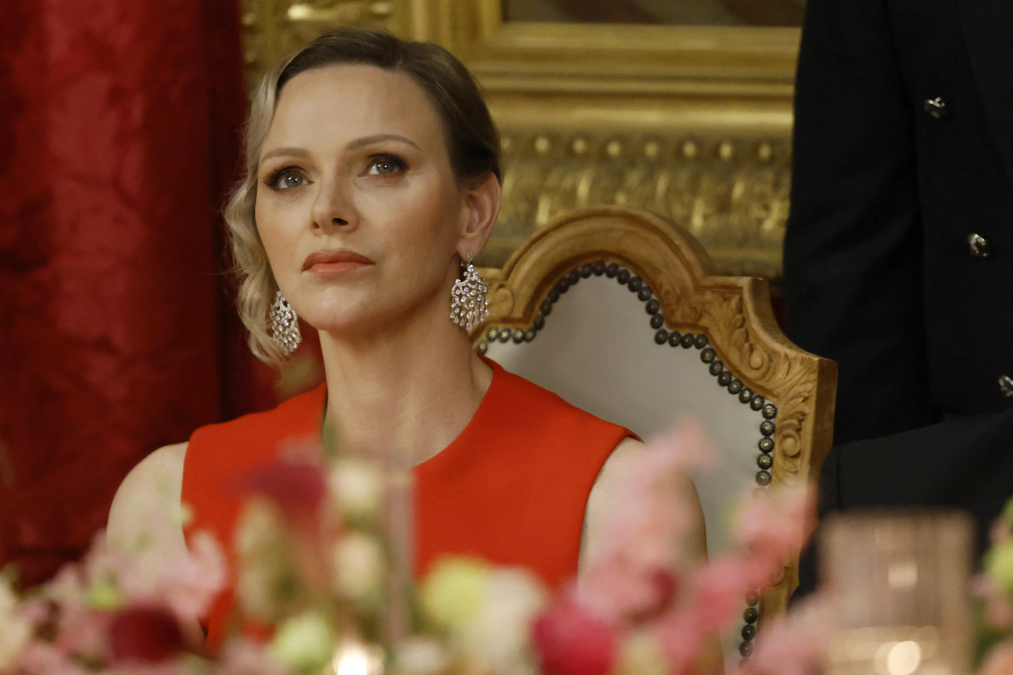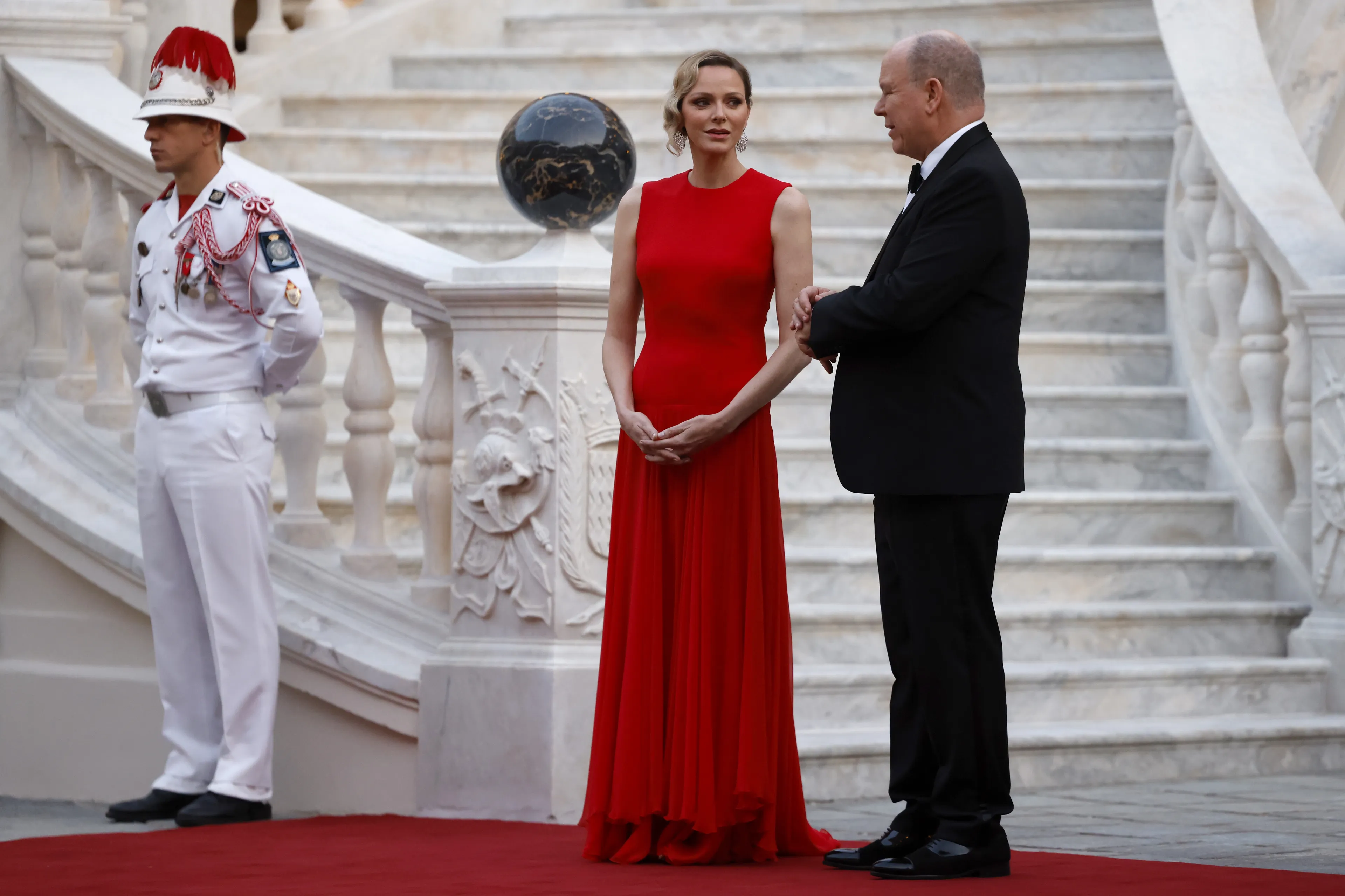 Prinses Charlène droeg gisterenavond een vuurrode japon met een asymmetrische zoom. Zondag 8 juni gaat het staatsbezoek van Frankrijk aan Monaco verder.