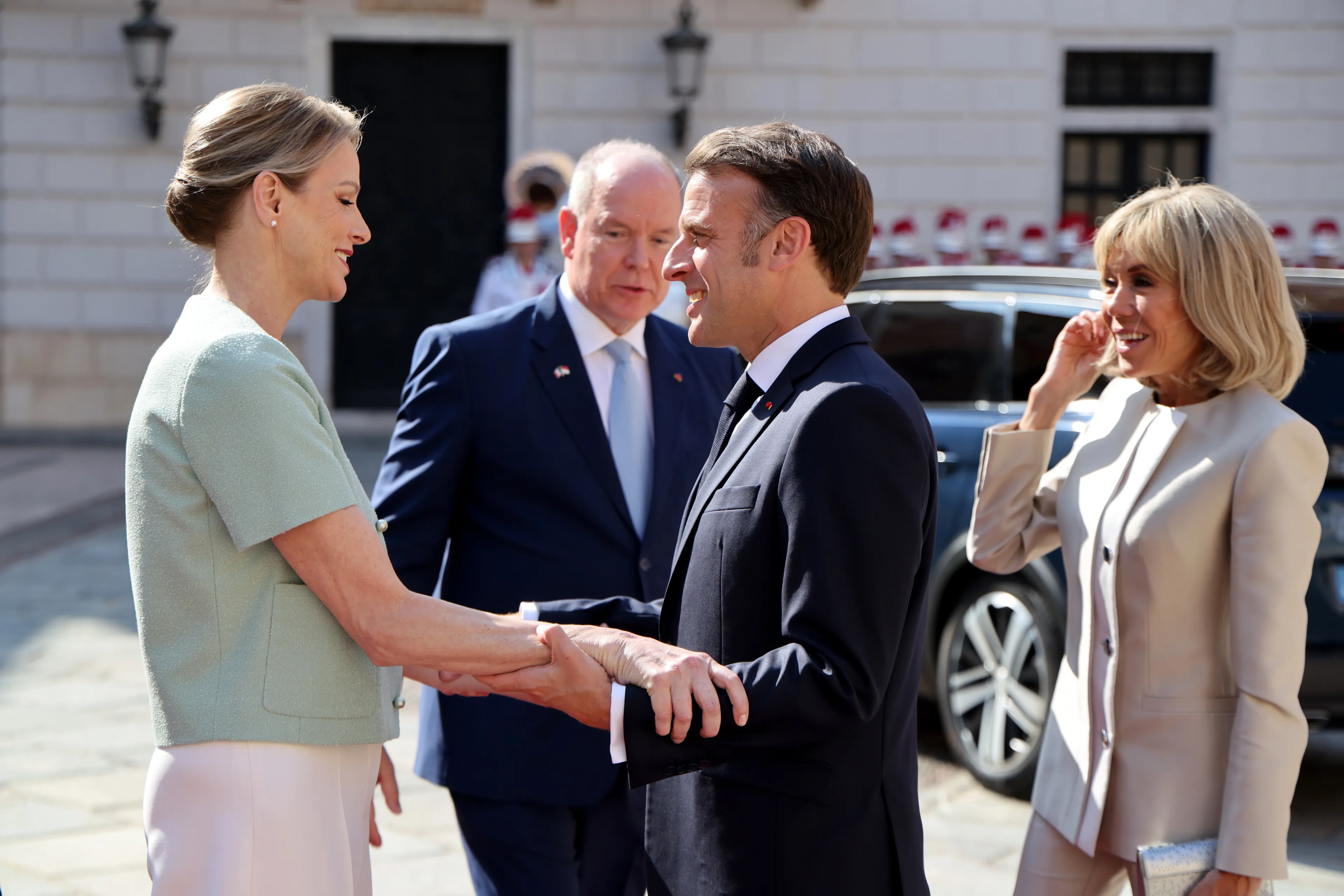 Het Franse echtpaar werd zaterdag warm welkom geheten door het prinselijk gezin. Er werden kussen uitgewisseld voordat de volksliederen klonken. Daarna inspecteerden Macron en Albert de erewacht. Het is voor het eerst in decennia dat Monaco officieel bezoek krijgt uit Frankrijk. François Mitterrand legde in 1984 voor het laatst een staatsbezoek af aan het vorstendom.