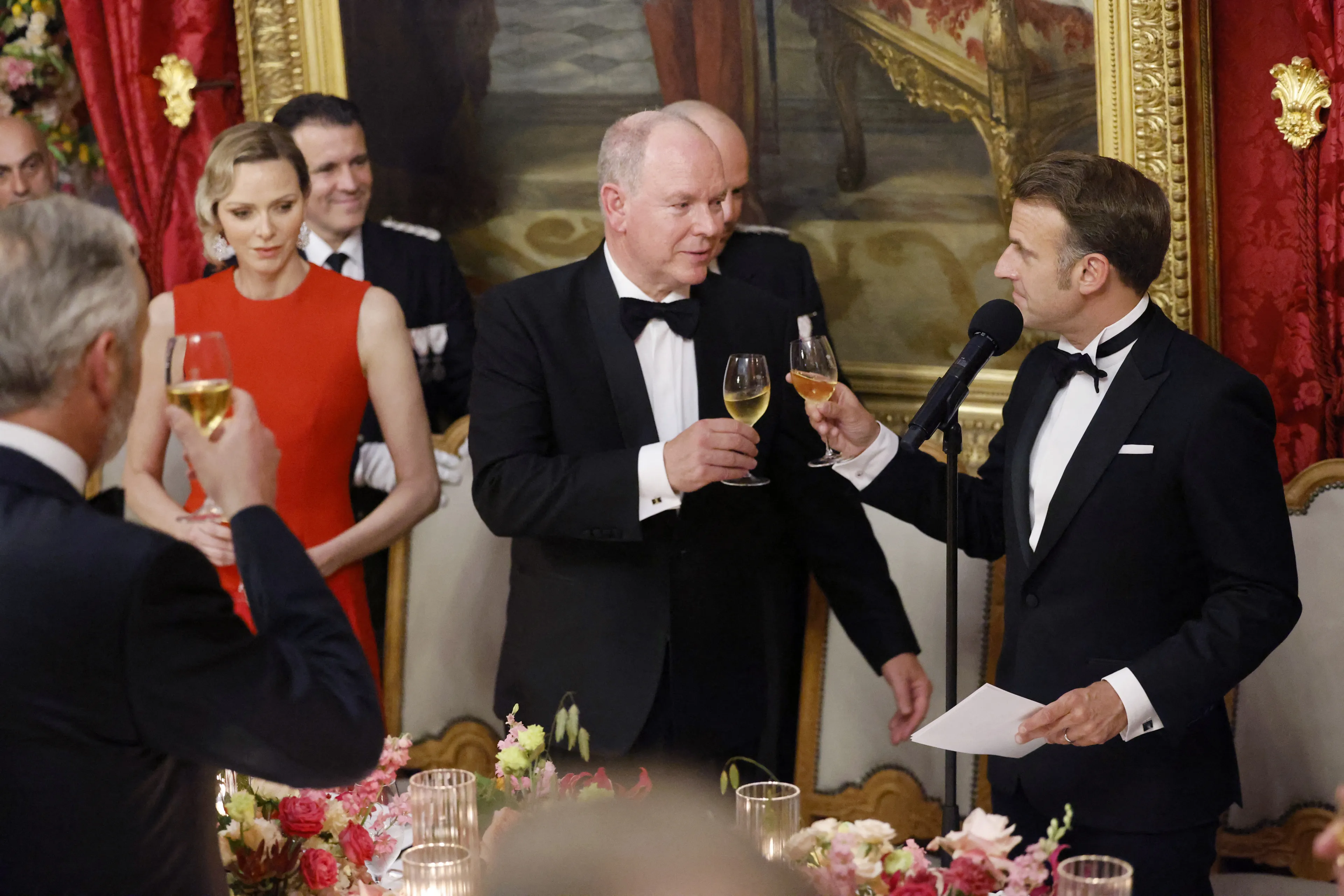 Prins Albert en prinses Charlène ontvangen samen met hun tweeling president Macron