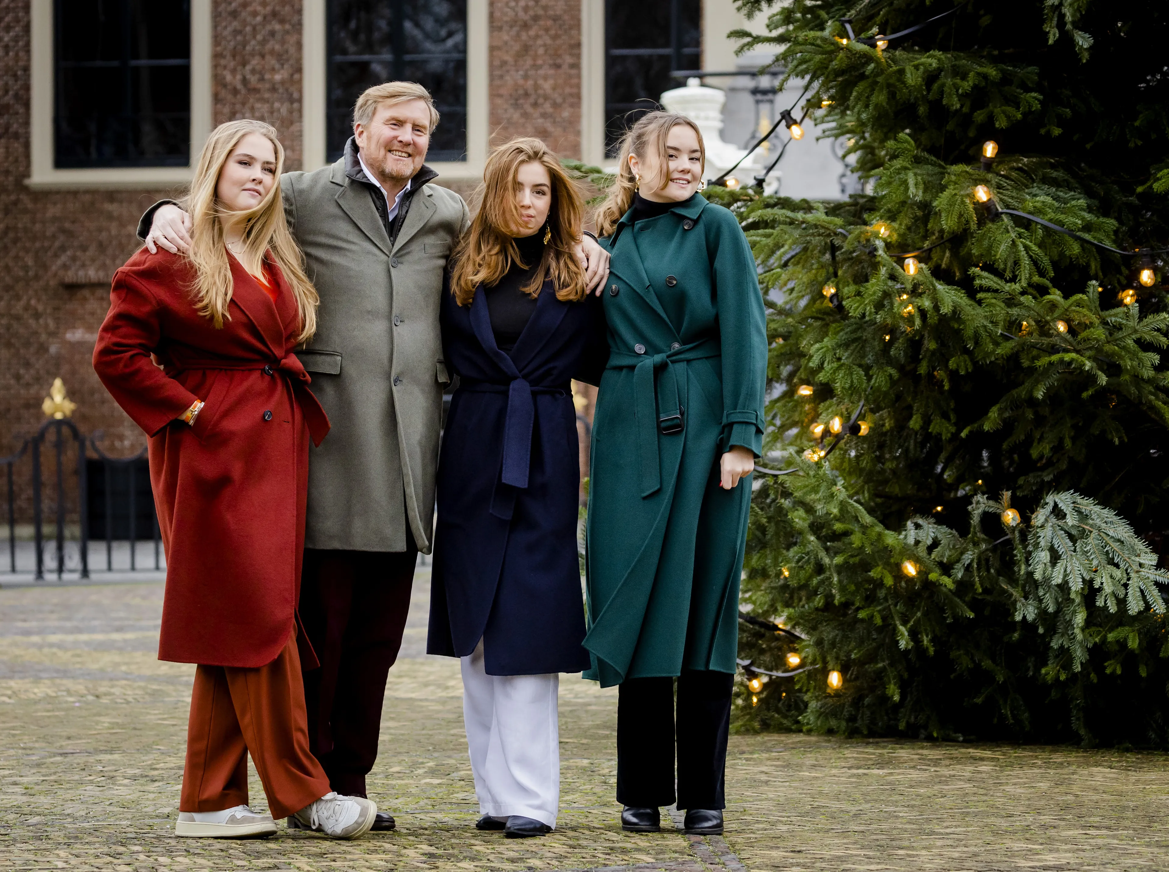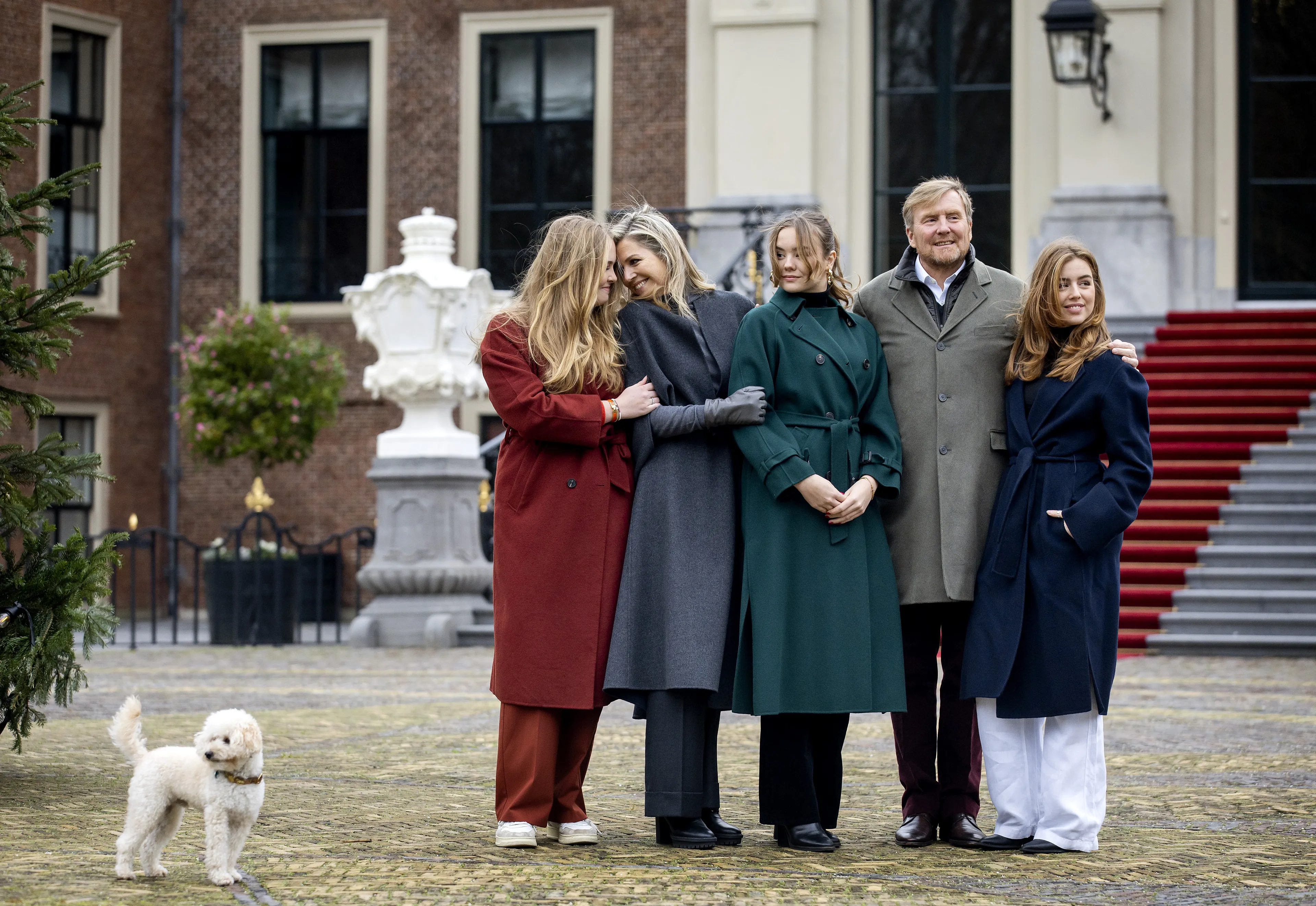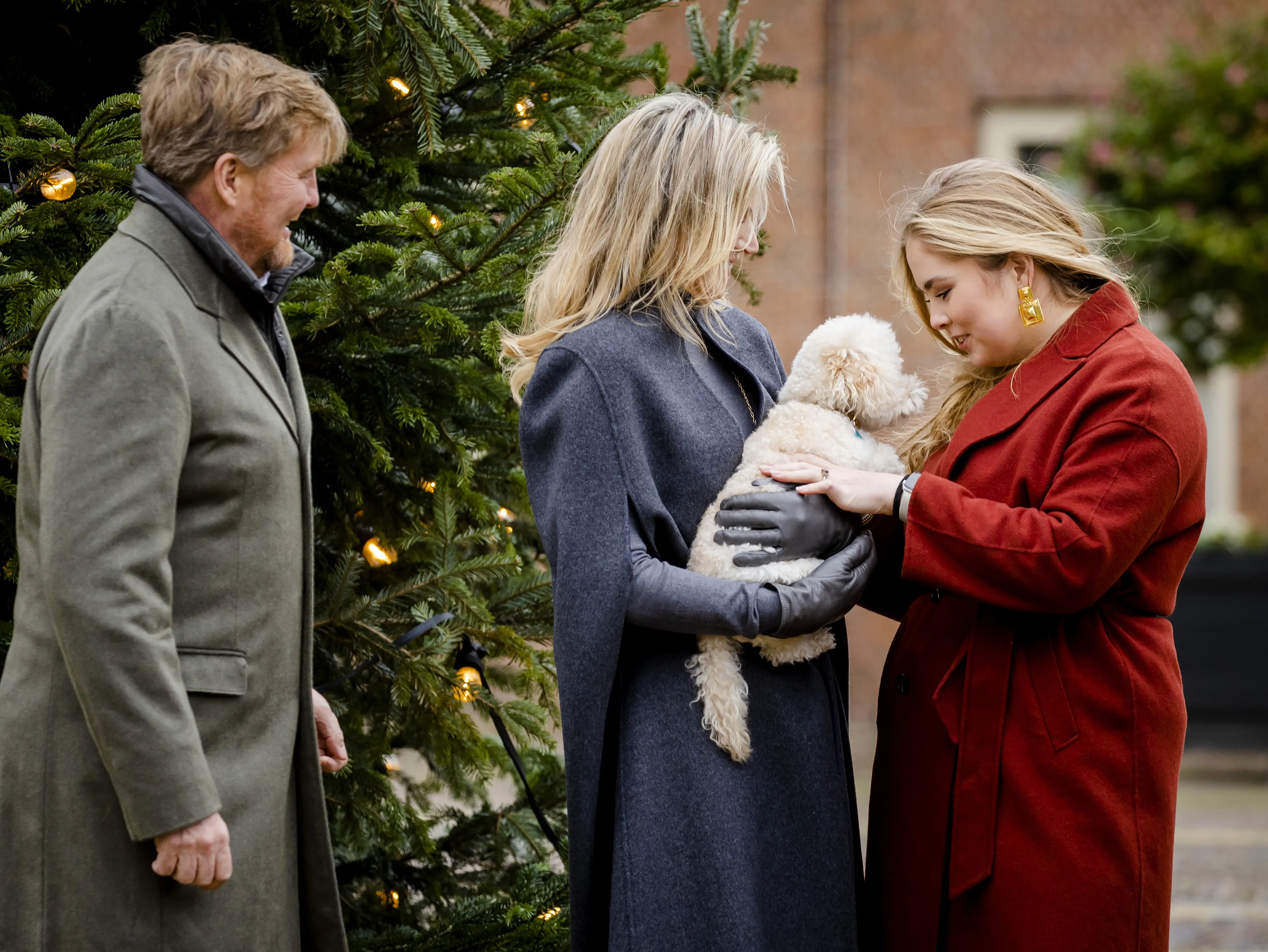 Koning Willem-Alexander en koningin Máxima poseerden vandaag samen met hun drie dochters prinses Amalia, prinses Alexia en prinses Ariane voor Paleis Huis ten Bosch. Dat deden ze gezellig samen voor de kerstboom. Ook hondje Mambo was van de partij.