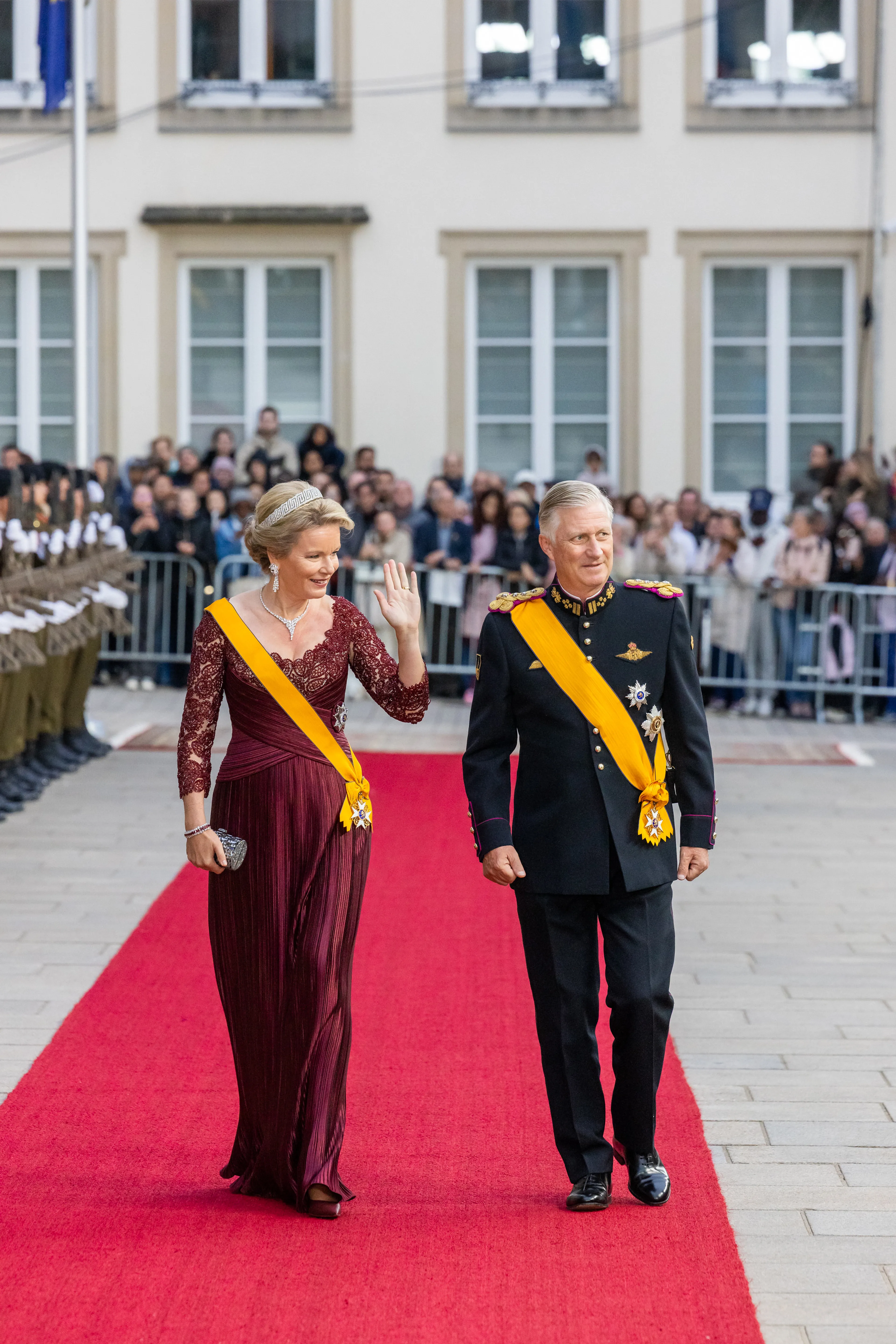 Koning Filip en koningin Mathilde ontvingen in 2024 groothertog Henri en groothertogin Maria Teresa op staatsbezoek. De koningin koos voor een glinsterende aansluitende jurk met steentjes. Wederom een ontwerp van Armani Privé.