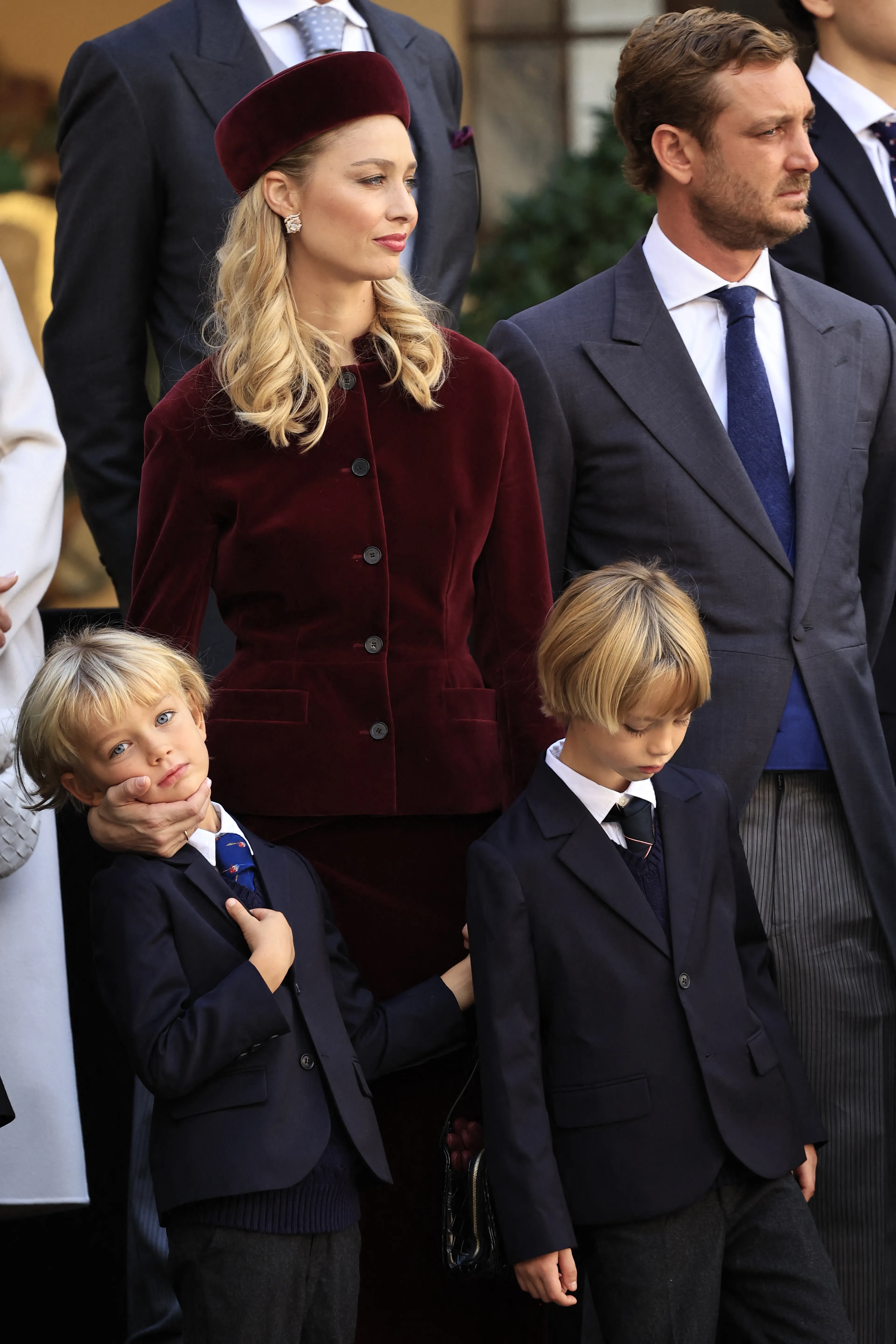 Ook Beatrice Borromeo, de vrouw van Pierre Casiraghi, is vandaag van de partij. Zij draagt een prachtig bordeauxrode outfit met een bijpassende hoed, beiden vervaardigd van velours.