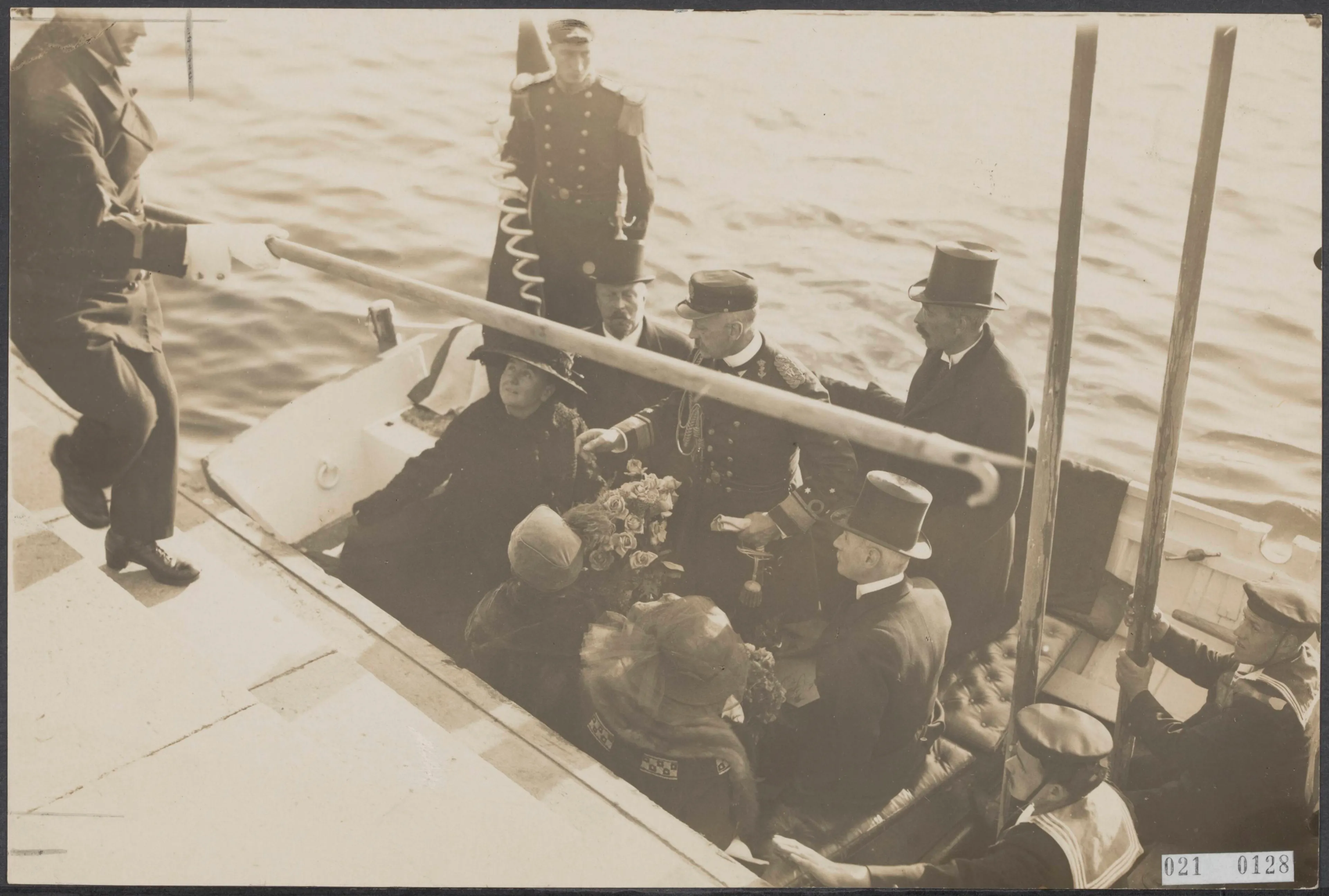 Wilhelmina gaat van boord na een rondvaart door de Zweedse wateren. Op de boot is prins Hendrik naast de koningin te zien en koning Gustaf V (de man die staat met de hoge hoed).