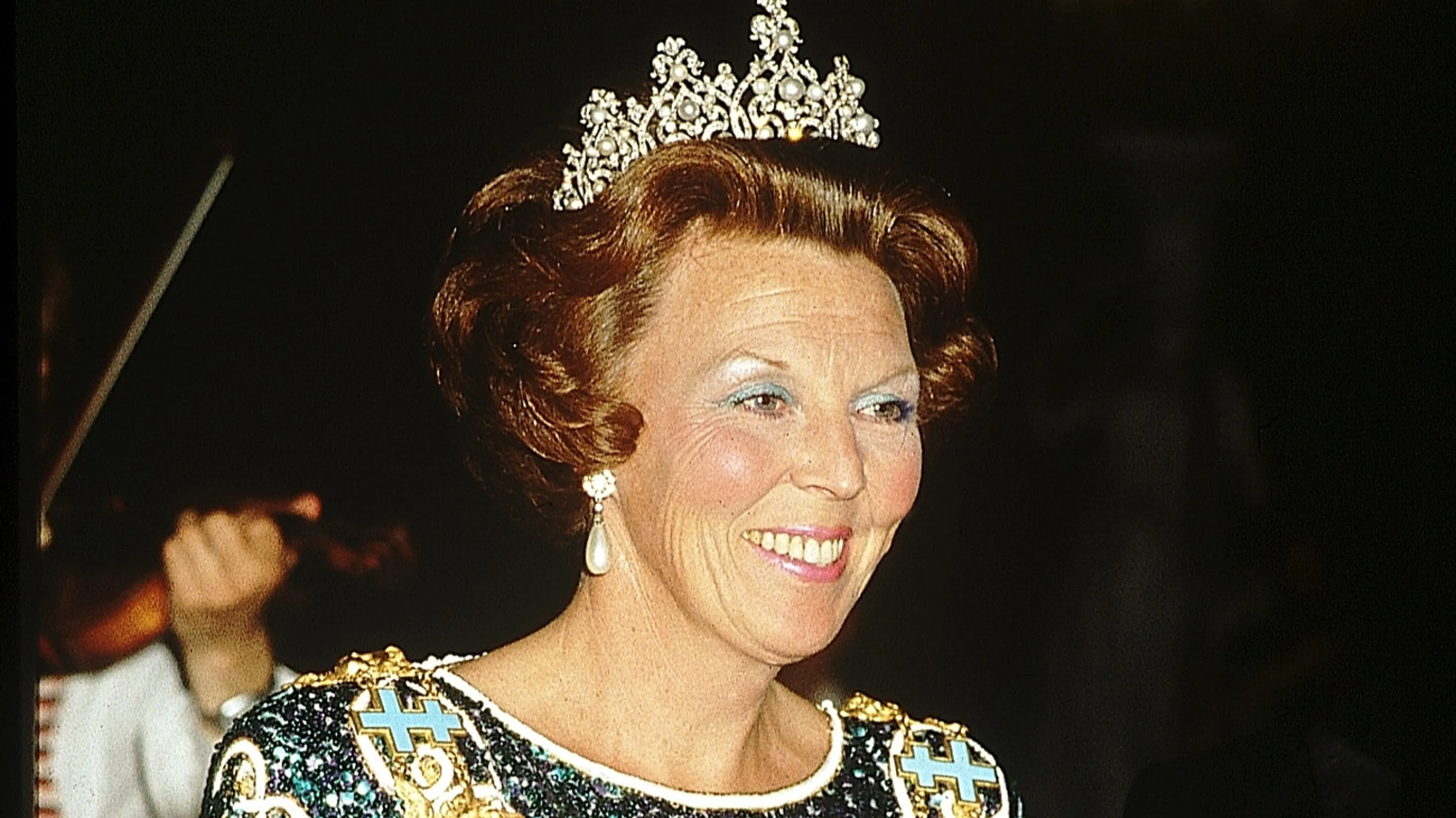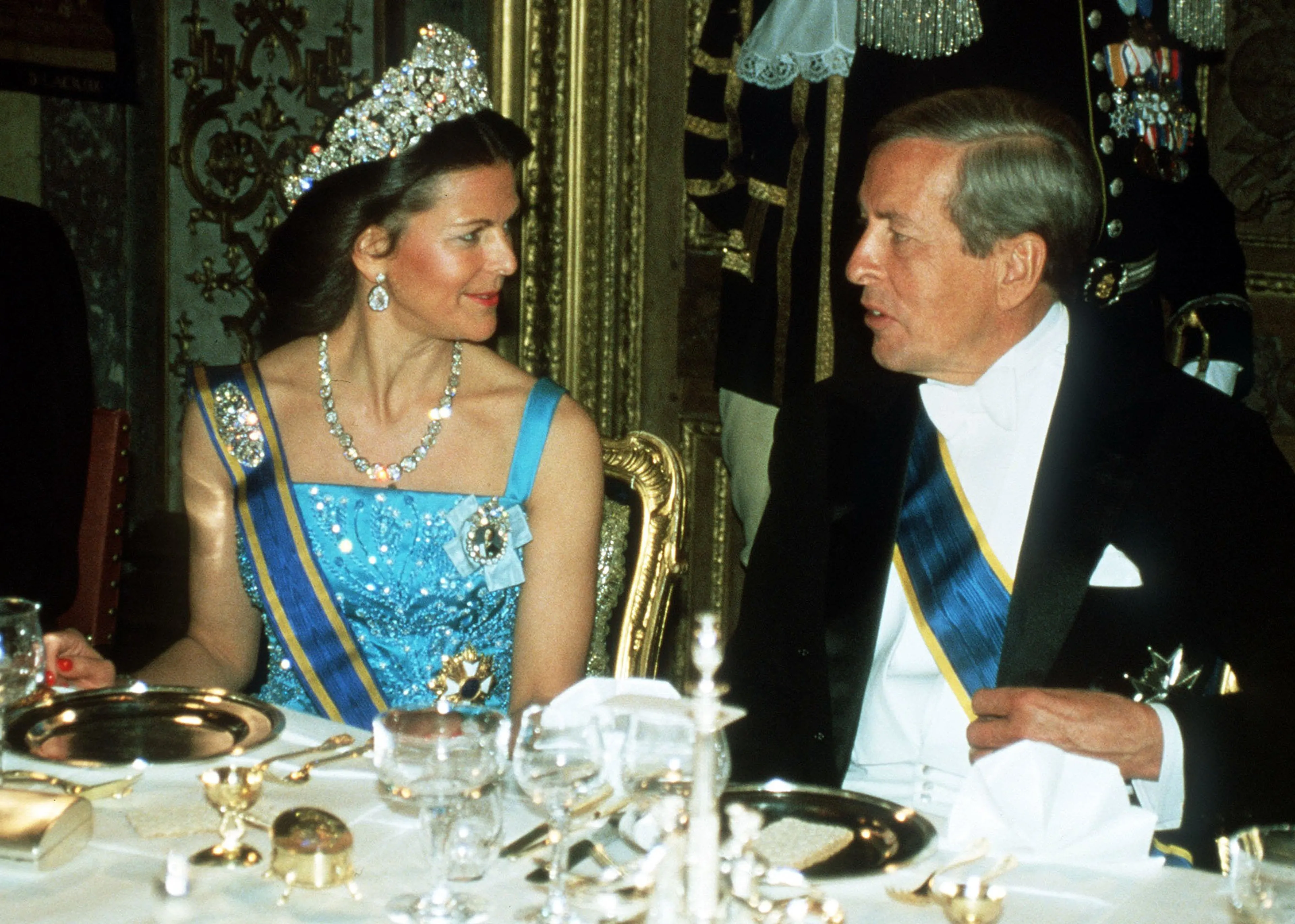 De Zweedse royals trakteren Beatrix en Claus ook op een galadiner. Met haar tiara schittert Beatrix op en top tijdens het feestelijke diner. Prins Claus draagt een kostuum. Hij zit naast koningin Silvia, wat een mooie verschijning!
