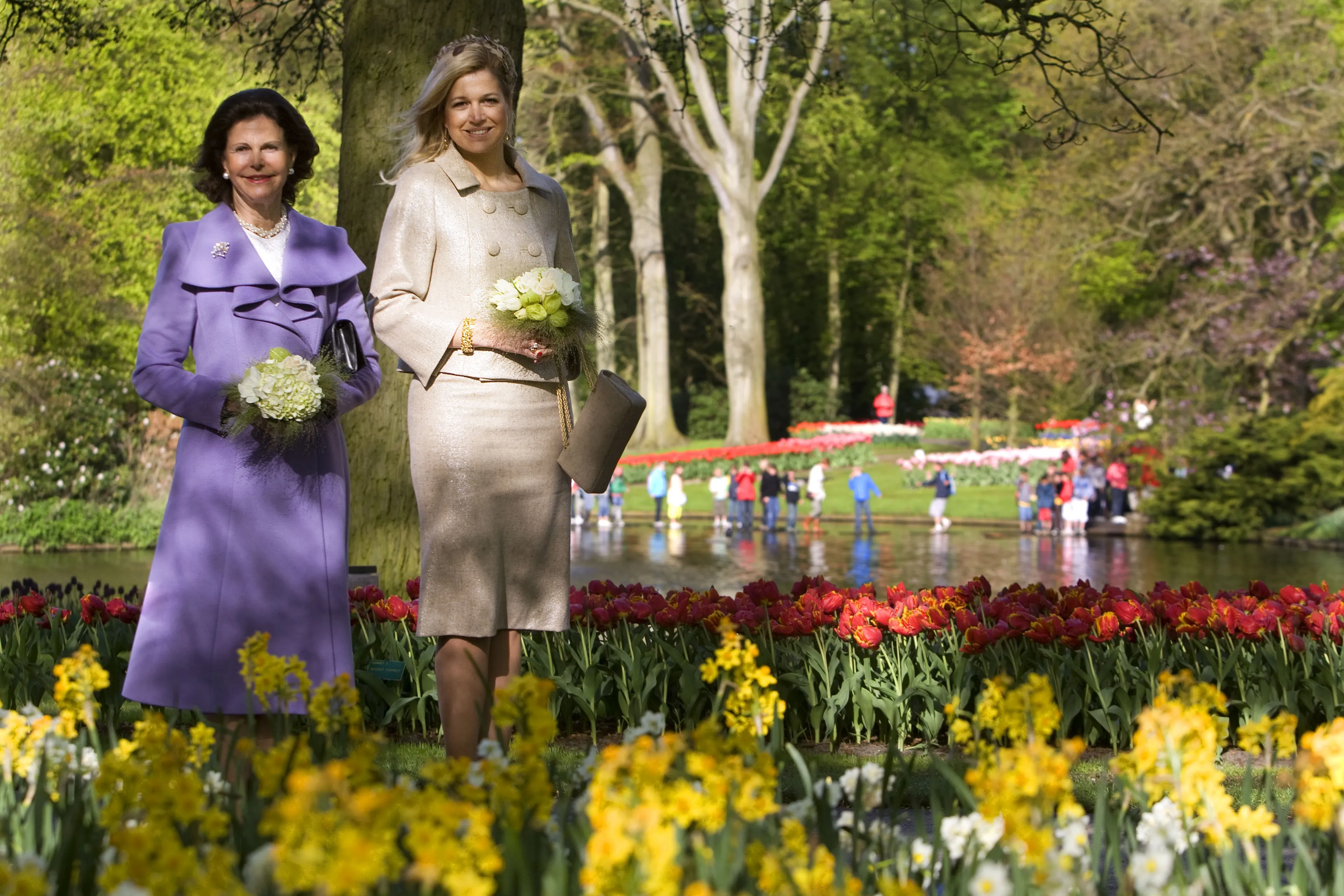 Koningin Silvia en prinses Máxima brengen samen een bezoek aan een bloemenveld in het Keukenhof. Wie weet heeft Máxima wel wat koninklijke tips gehad van een ruim ervaren vorstin.