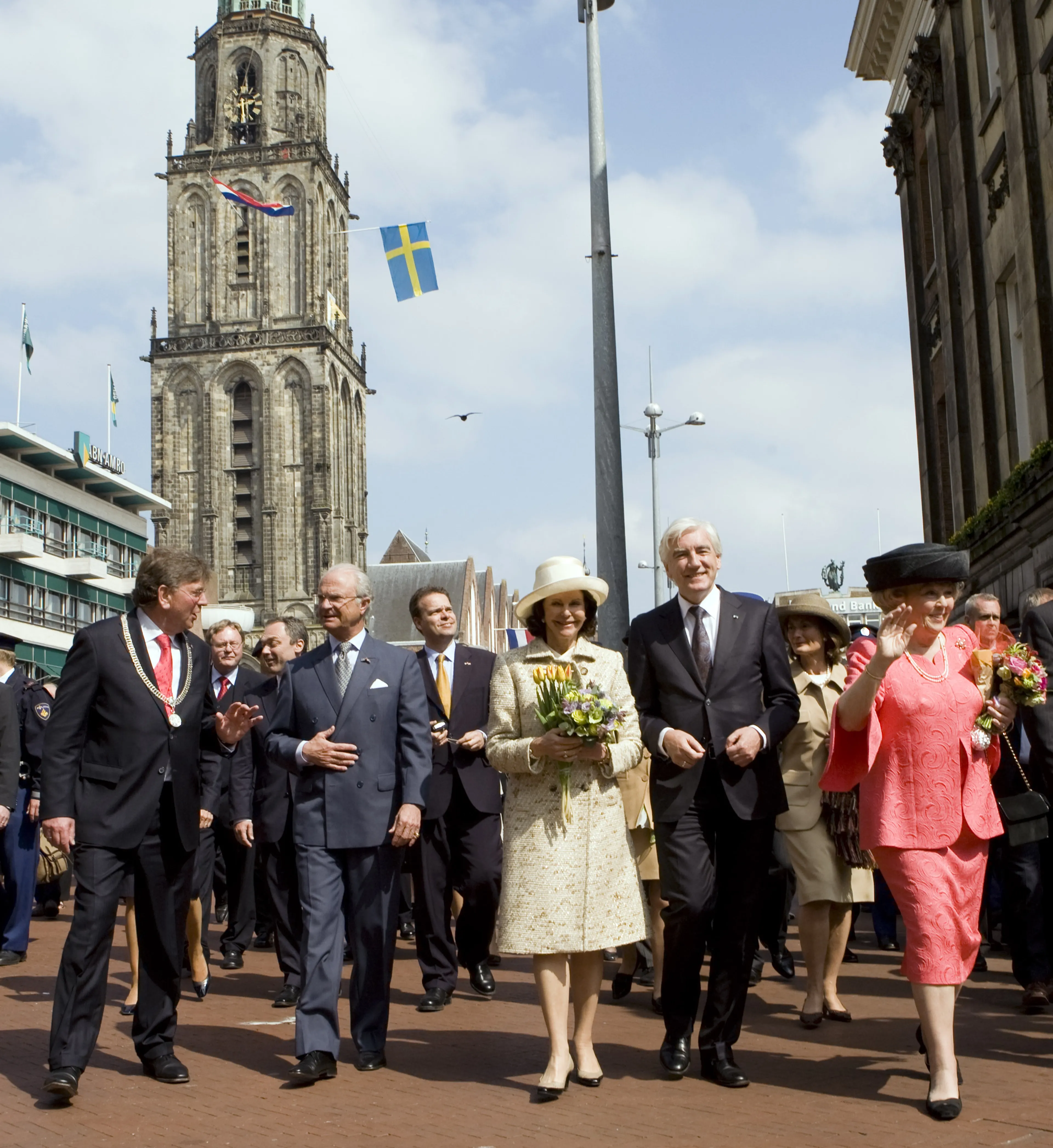Tijdens het staatsbezoek neemt Beatrix de Zweedse royals mee door Groningen. Op de Martinitoren wappert de Zweedse vlag.
