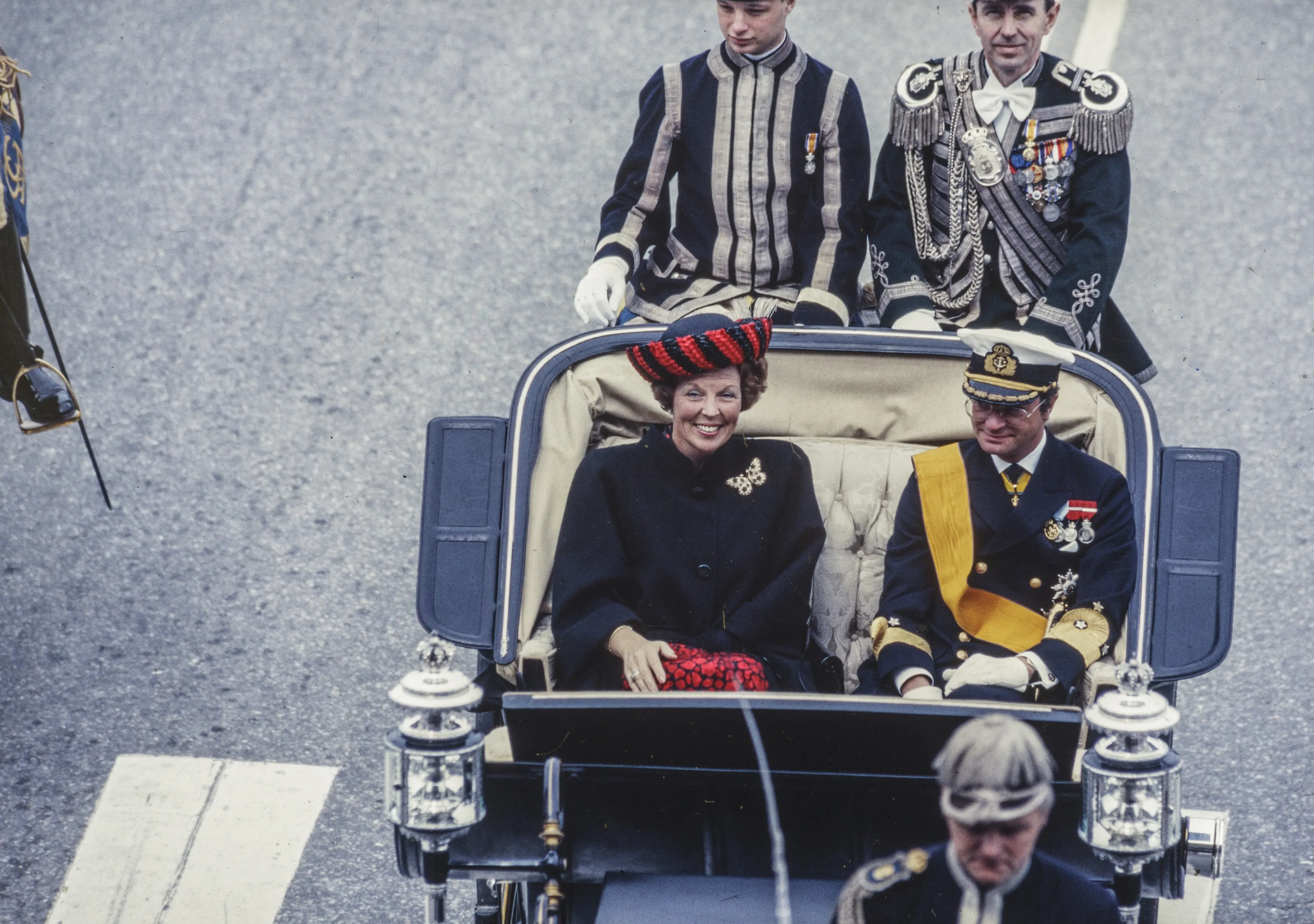 In 1980 neemt prinses Beatrix het koninginnenstokje over van haar moeder Juliana. In Zweden zit inmiddels de kleinzoon van Gustaf VI Adolf op de troon: koning Carl Gustaf. In 1987 brengen Beatrix en Claus een staatsbezoek, in kleur, aan het Noord-Europese land.