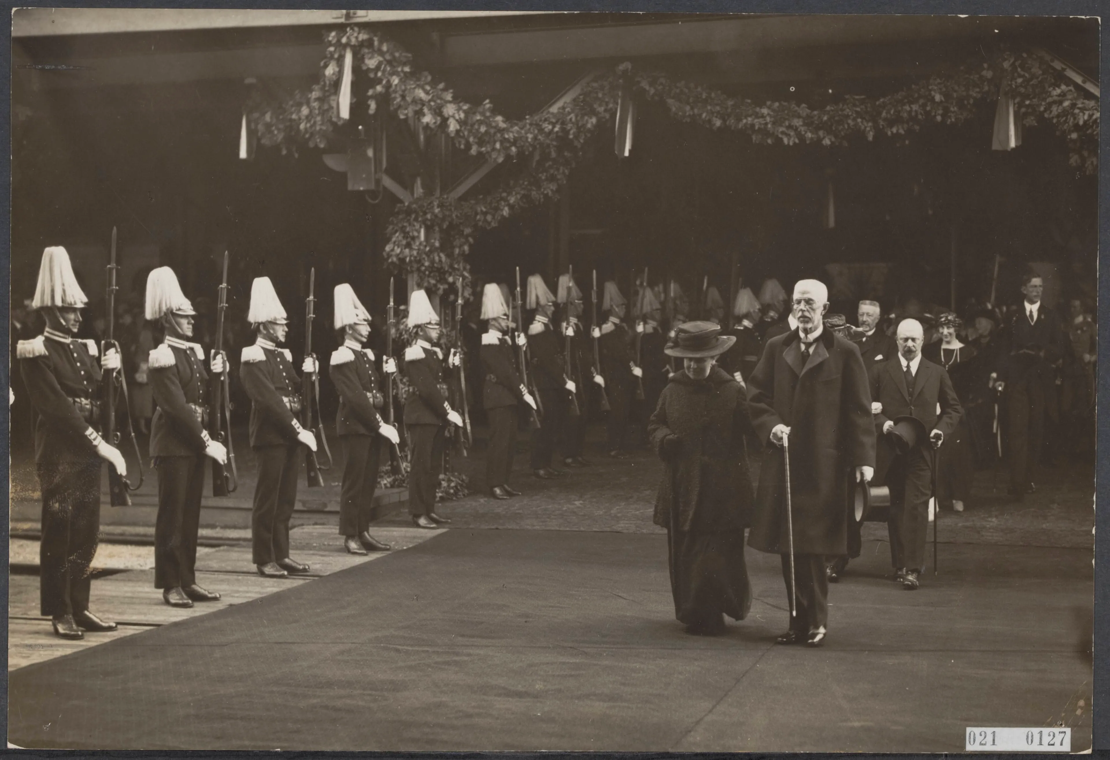 De inspectie van de erewacht: een traditie die eeuwenoud is en nog steeds in stand wordt gehouden. Wilhelmina inspecteert de troepen samen met Gustaf V. Achter de Zweedse koning loopt de echtgenoot van de Nederlandse koningin, prins Hendrik. Op zijn plaats achter de vorsten. In die tijd speelt protocol nog een veel grotere rol dan vandaag de dag. De regel is dat er niemand voor de regerende monarchen mag lopen.