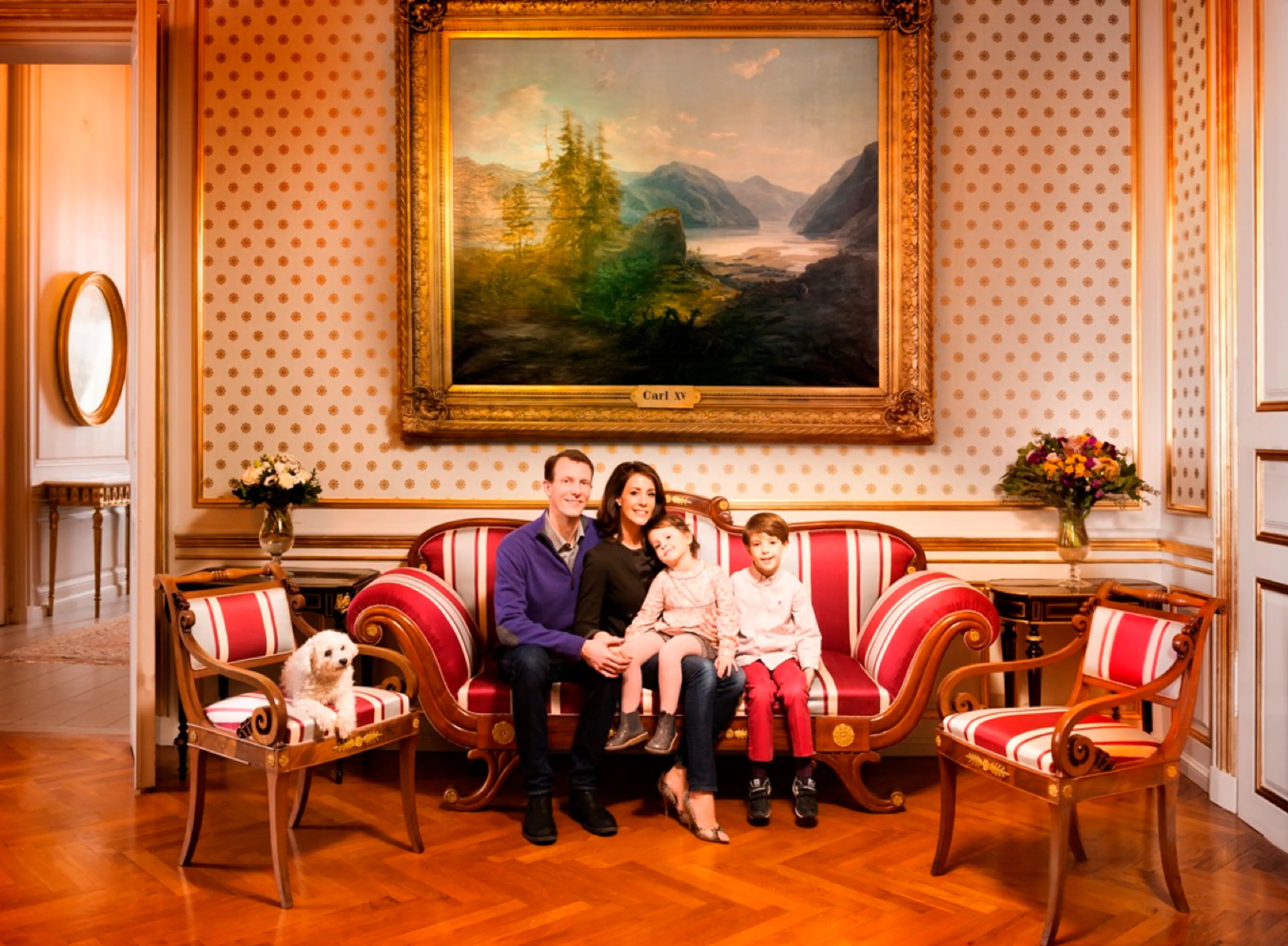 Op de foto's, gemaakt door fotograaf Lars Krabbe, poseert de prinses met haar man prins Joachim en kinderen prins Henrik en prinses Athena. Op de foto's is ook de hond te zien genaamd Apple.