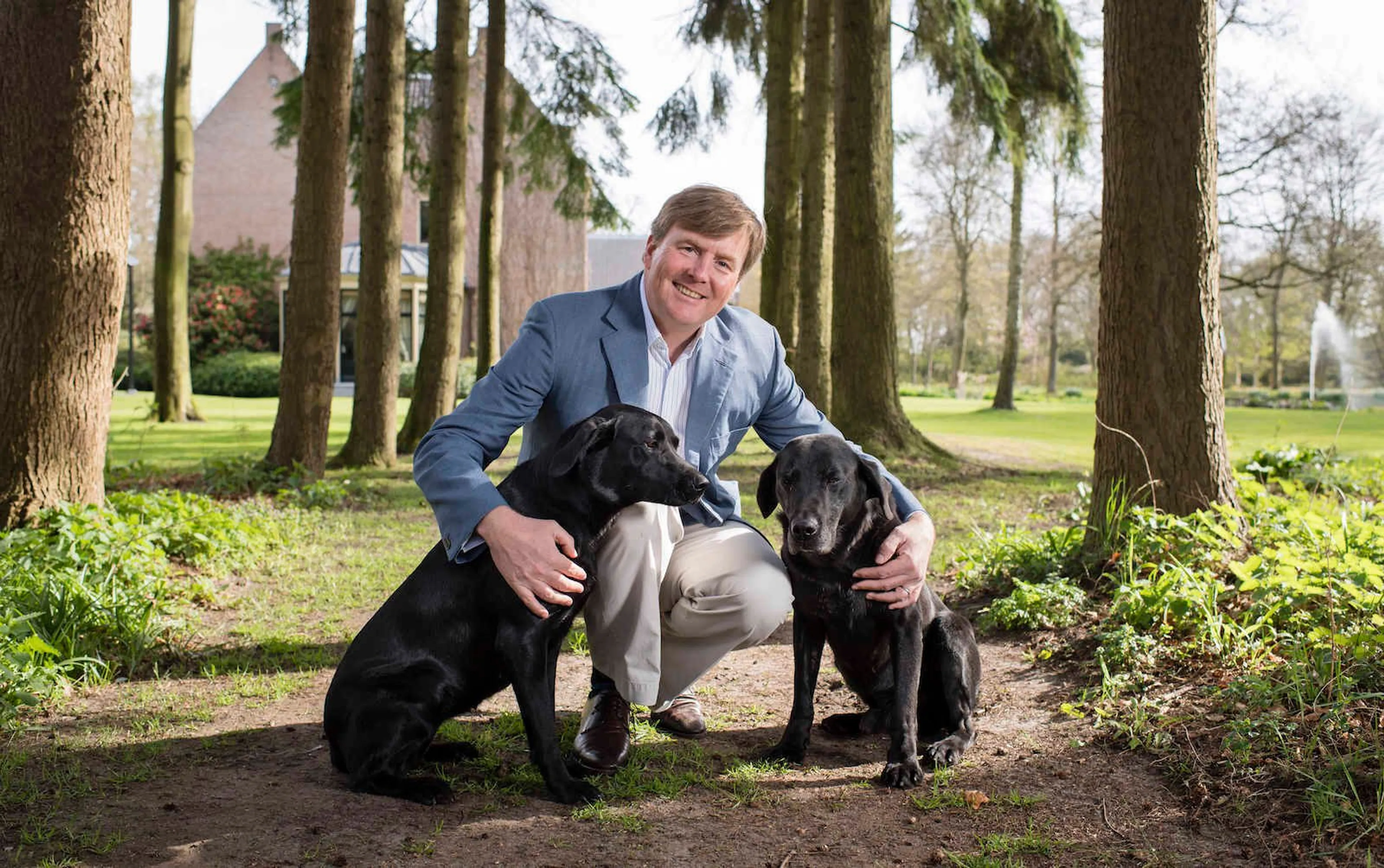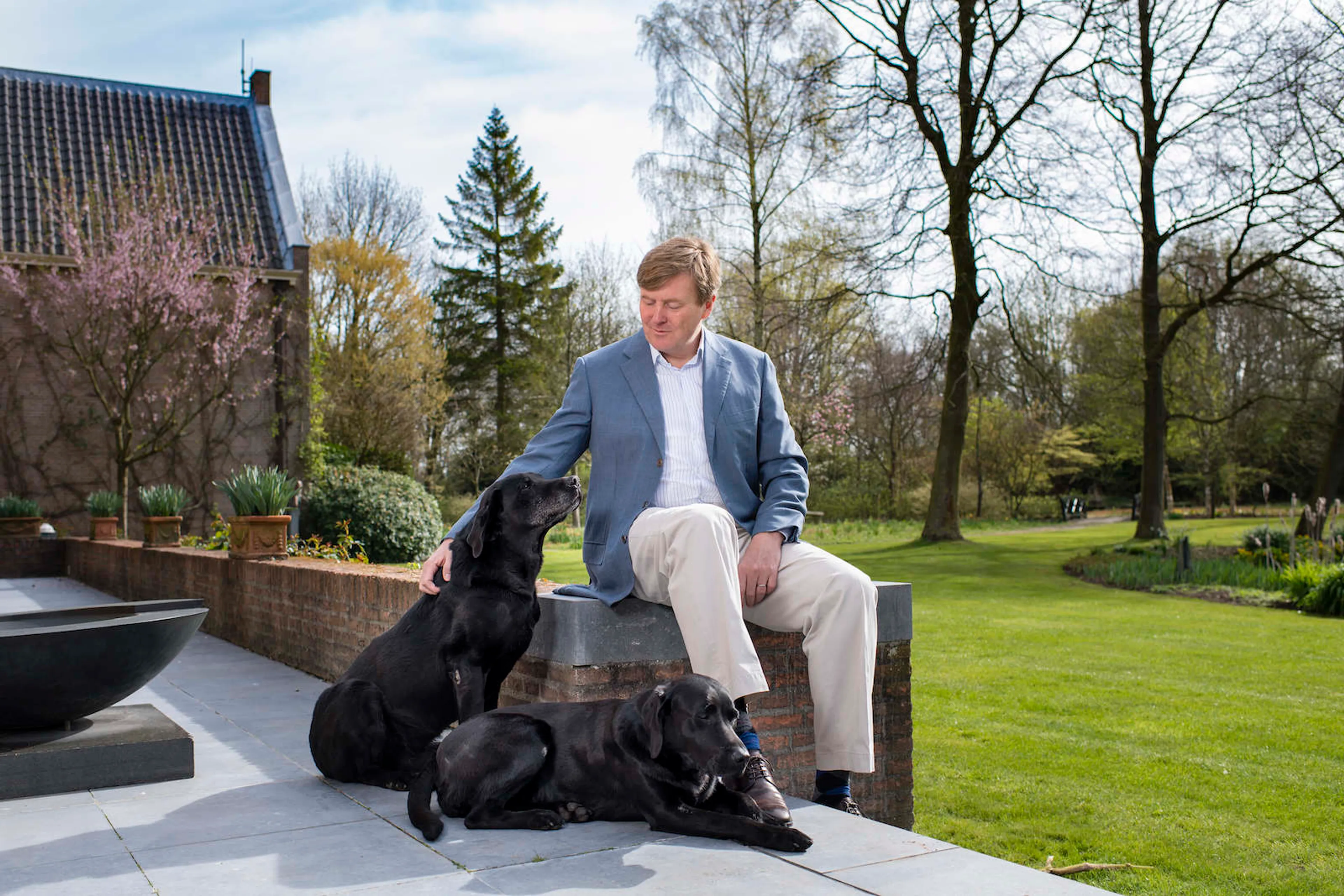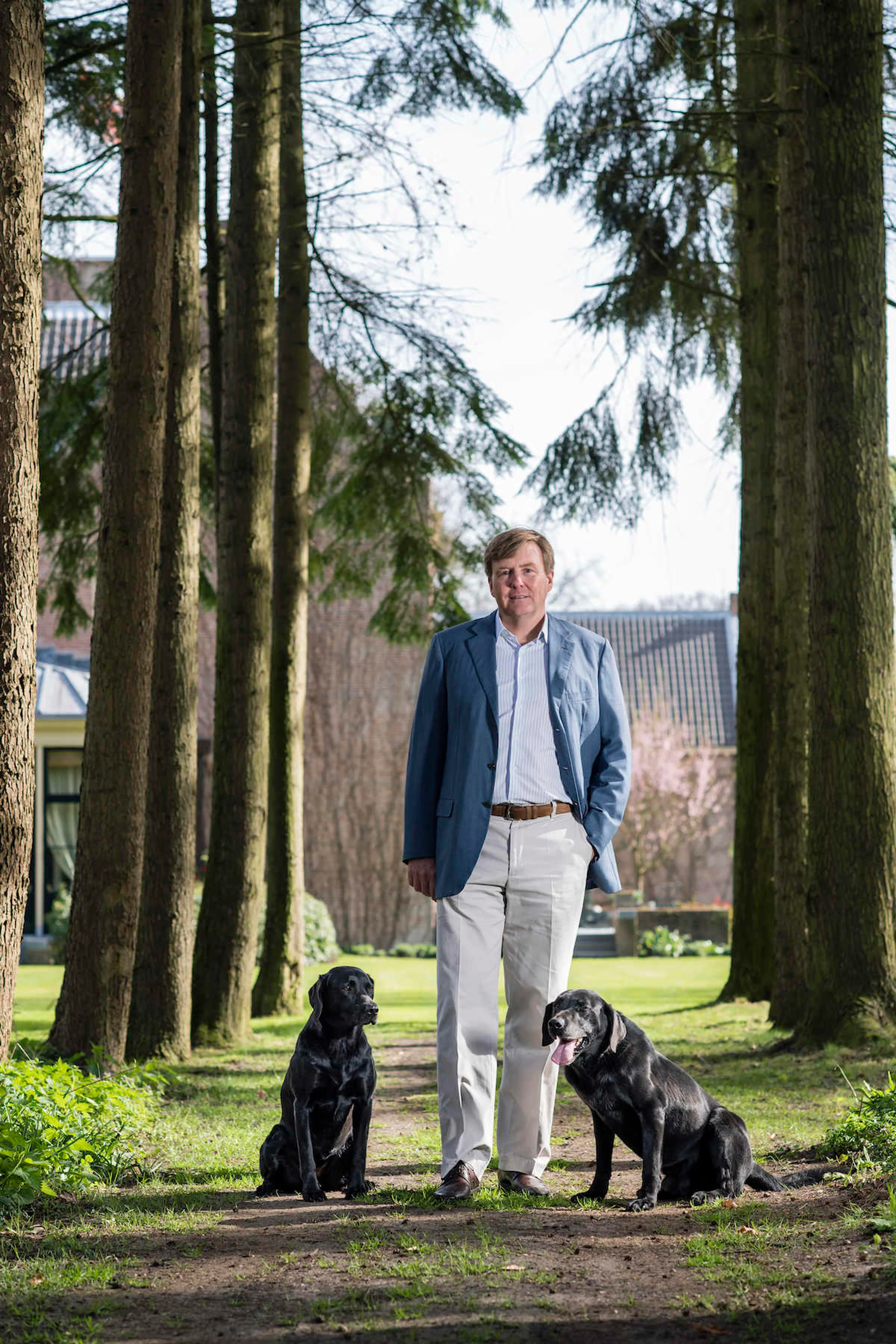 De beelden zijn gemaakt door Frank van Beek bij de Eikenhorst in Wassenaar. Op de foto's poseert Willem-Alexander ontspannen in de tuin van zijn woning. Hij heeft gezelschap van de twee zwarte labradors van het koninklijk gezin: Skipper en Nala.