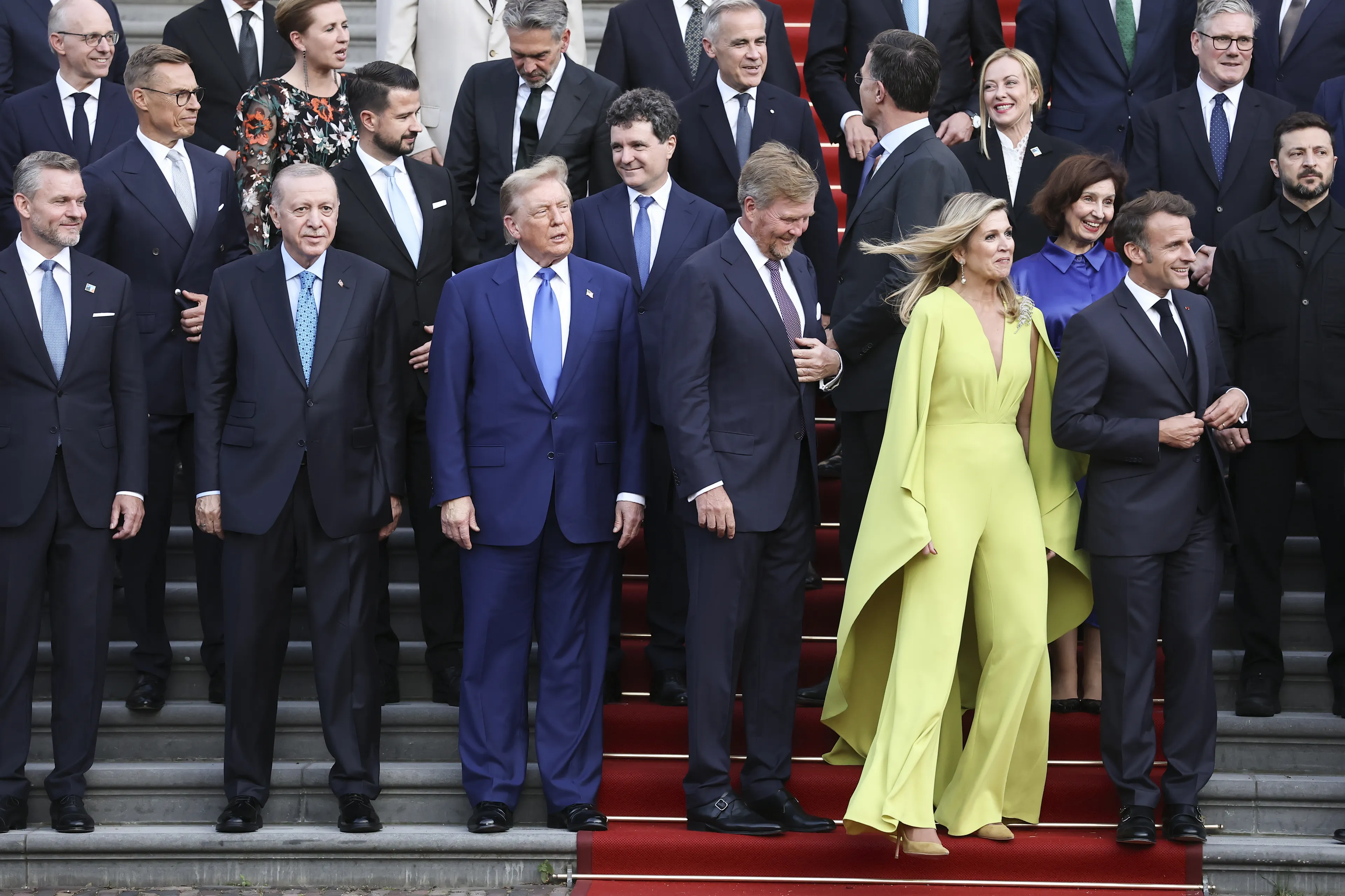 We maken een uitzondering voor deze opvallende limoengroene jumpsuit van modehuis Natan. De jumpsuit heeft een diepe V-hals en vleermuismouwen. Gedragen bij het NAVO-top diner op Paleis Huis ten Bosch. Tussen alle regeringsleiders was de koningin het stralende middelpunt.