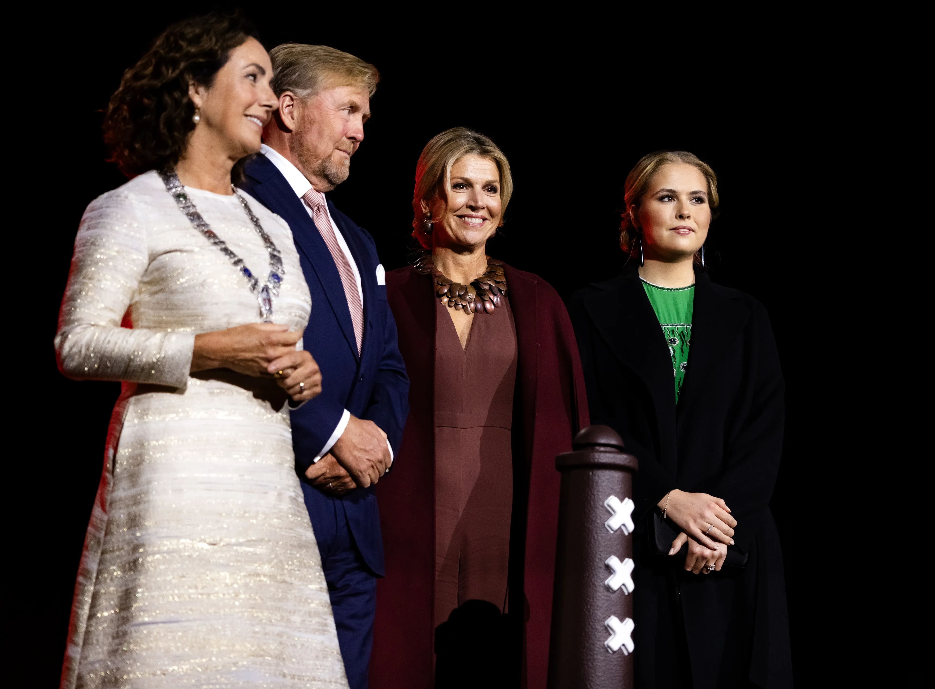 De koningin heeft ook een roestbruin exemplaar van deze jumpsuit van Natan, die ze heeft gedragen bij de viering van 750 jaar Amsterdam. Ze combineerde 'm vanwege de kou met een warme capemantel.