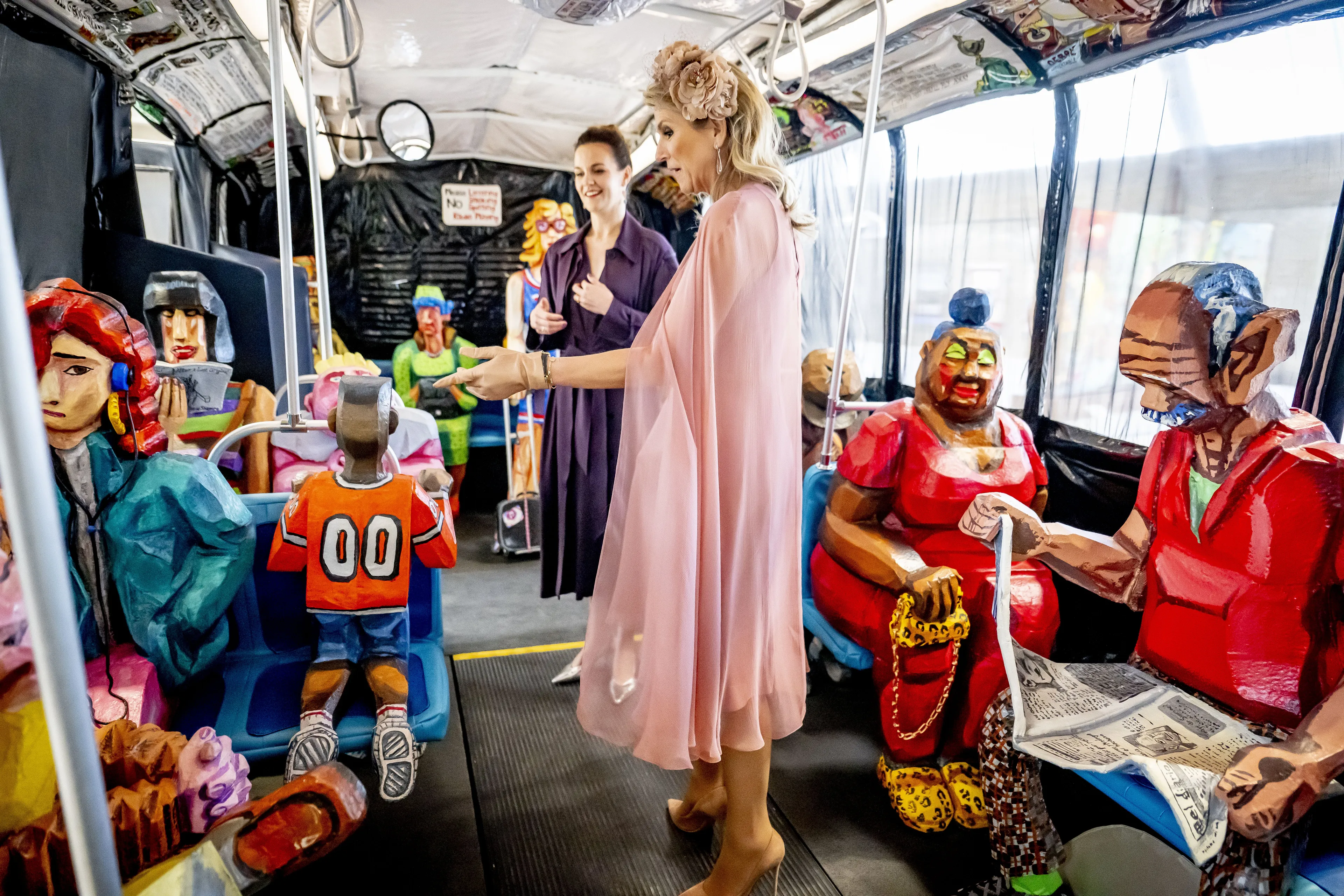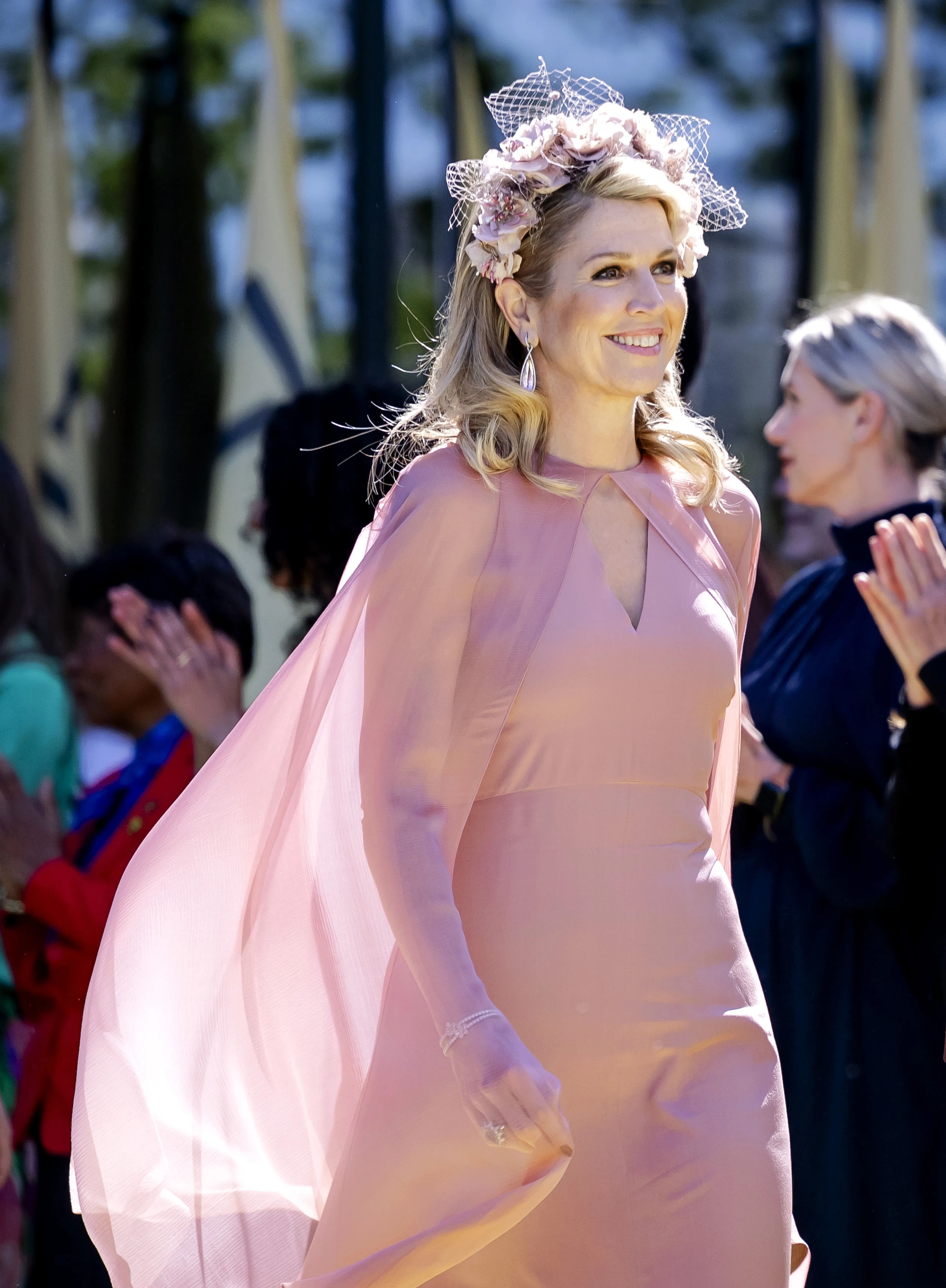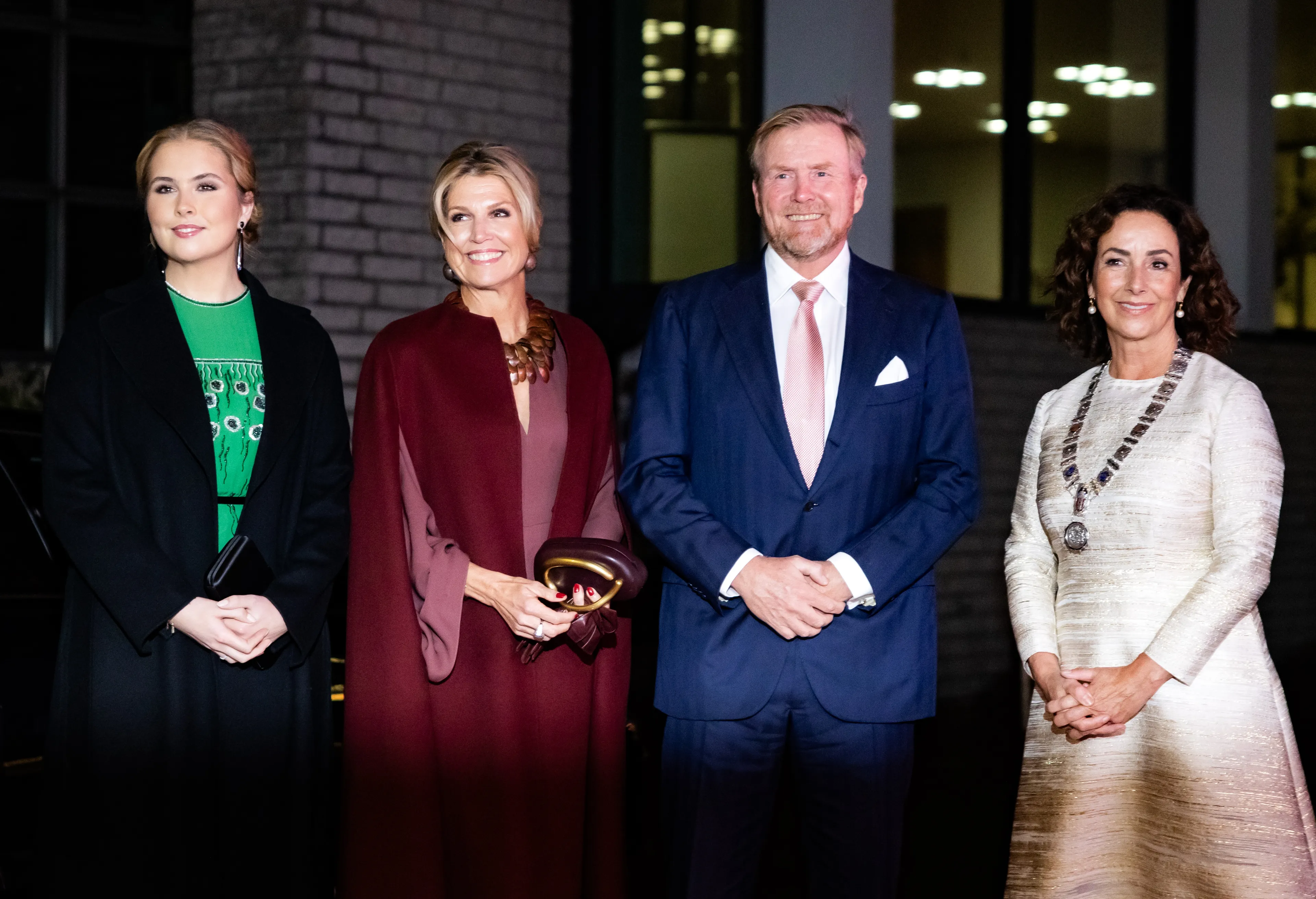 De koningin heeft dit jaar duidelijk een voorkeur voor jurken met capes, want tijdens de opening van het kunstmuseum Fenix droeg ze nog zo'n nieuw exemplaar. Dit keer in de kleur oudroze met een transparante cape van modehuis Natan.