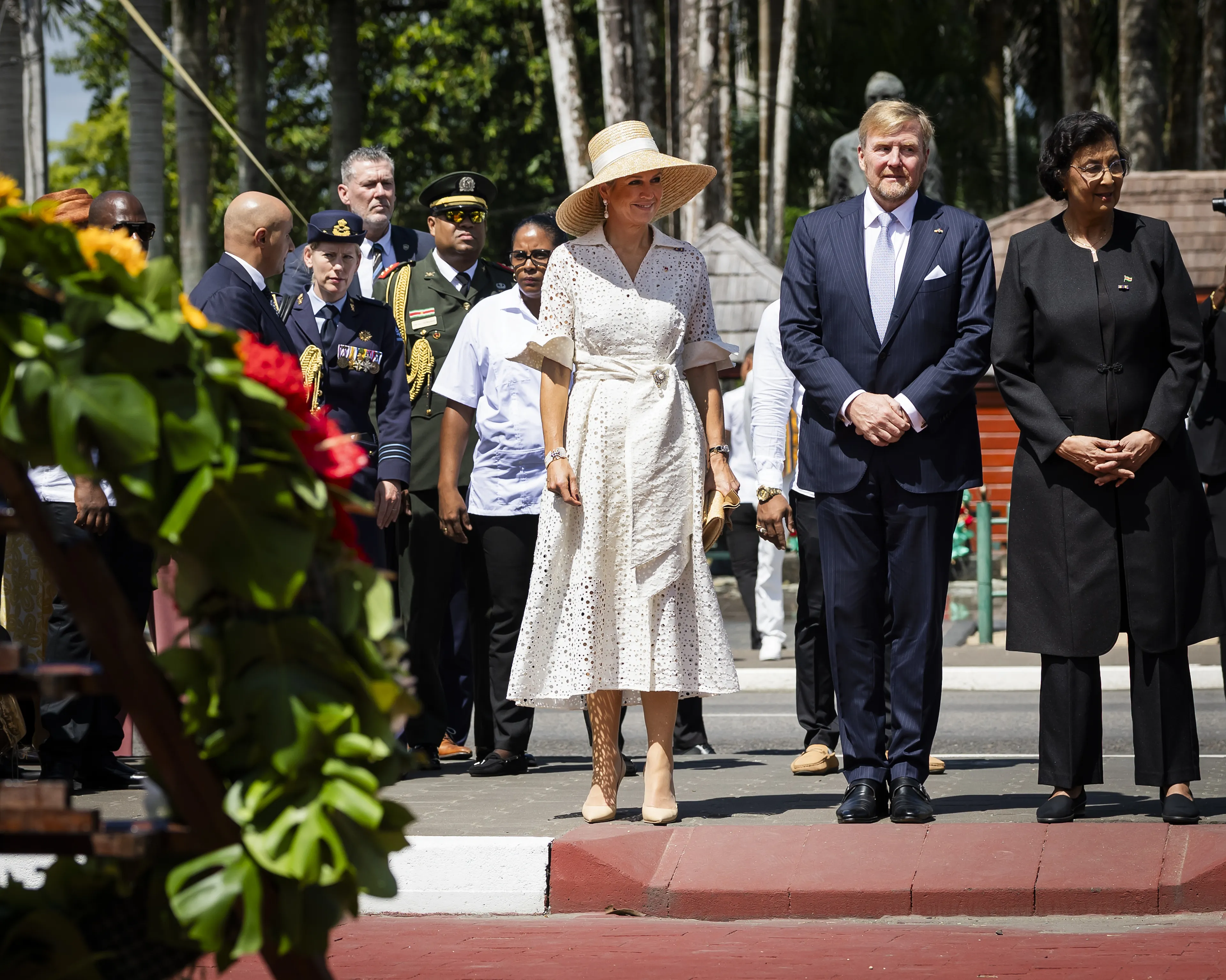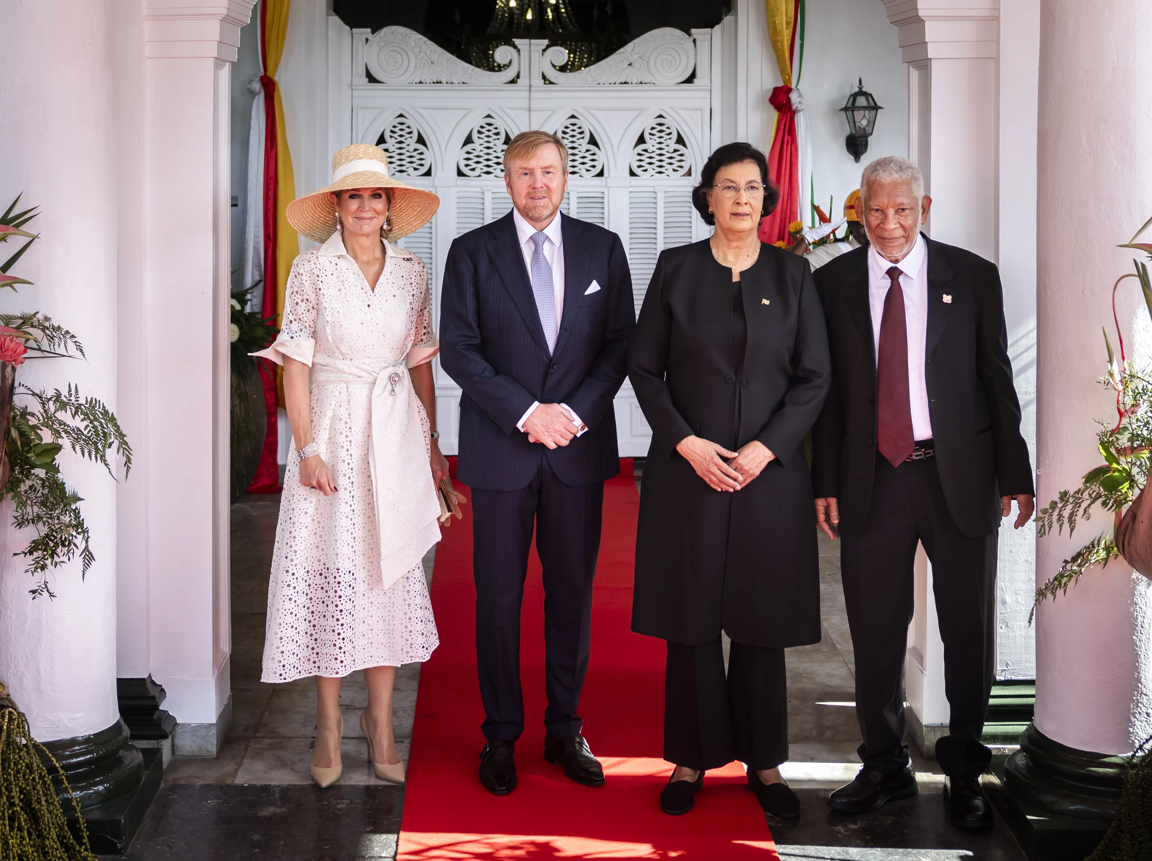 Deze luchtige witte jurk van koningin Máxima hing volgens modekenner Josine Droogendijk al een paar jaar ongedragen in haar garderobe. Voor dit staatsbezoek aan Suriname haalde de koningin de kaartjes eraf en mocht hij ten tonele verschijnen. De jurk met opengewerkte details is van Natan.