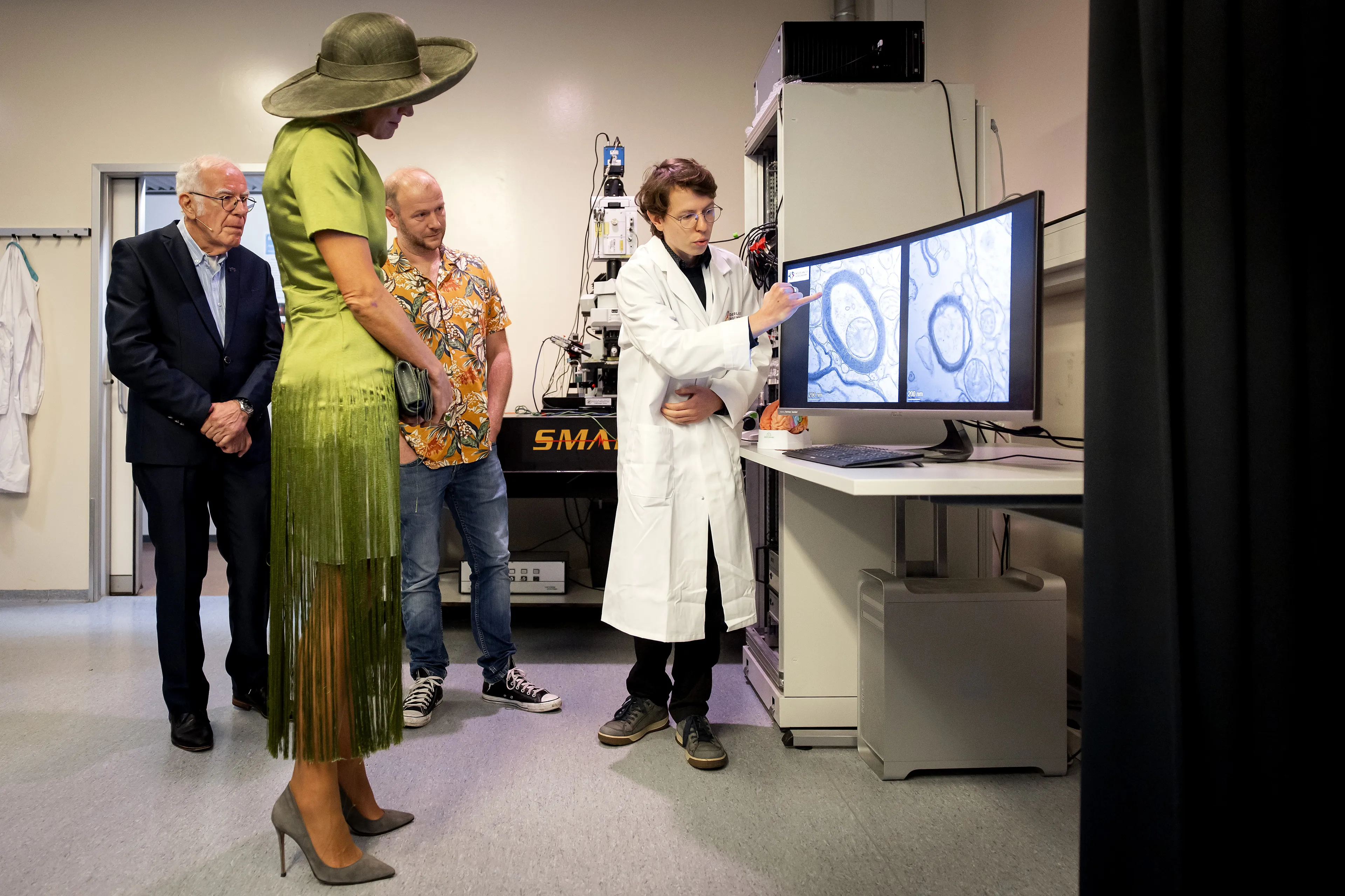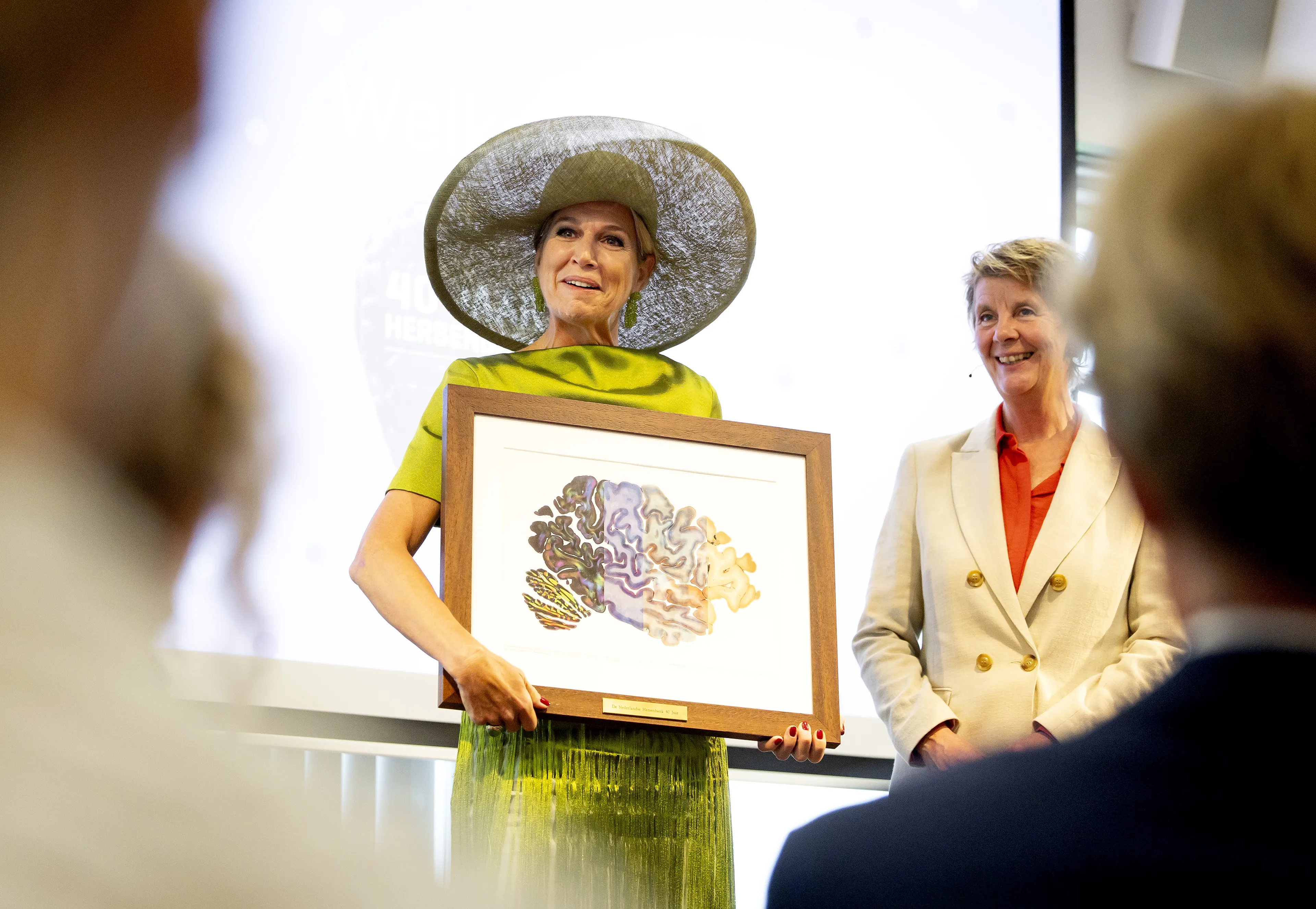 Een van de grote modetrends dit jaar was kleding met franjes en dat heeft koningin Máxima ook begrepen. Tijdens de viering van het veertigjarig jubileum van de Hersenbank droeg de koningin een nieuwe limoengroene japon mét franjes. De jurk komt uit het atelier van Edouard Vermeulen voor Natan.