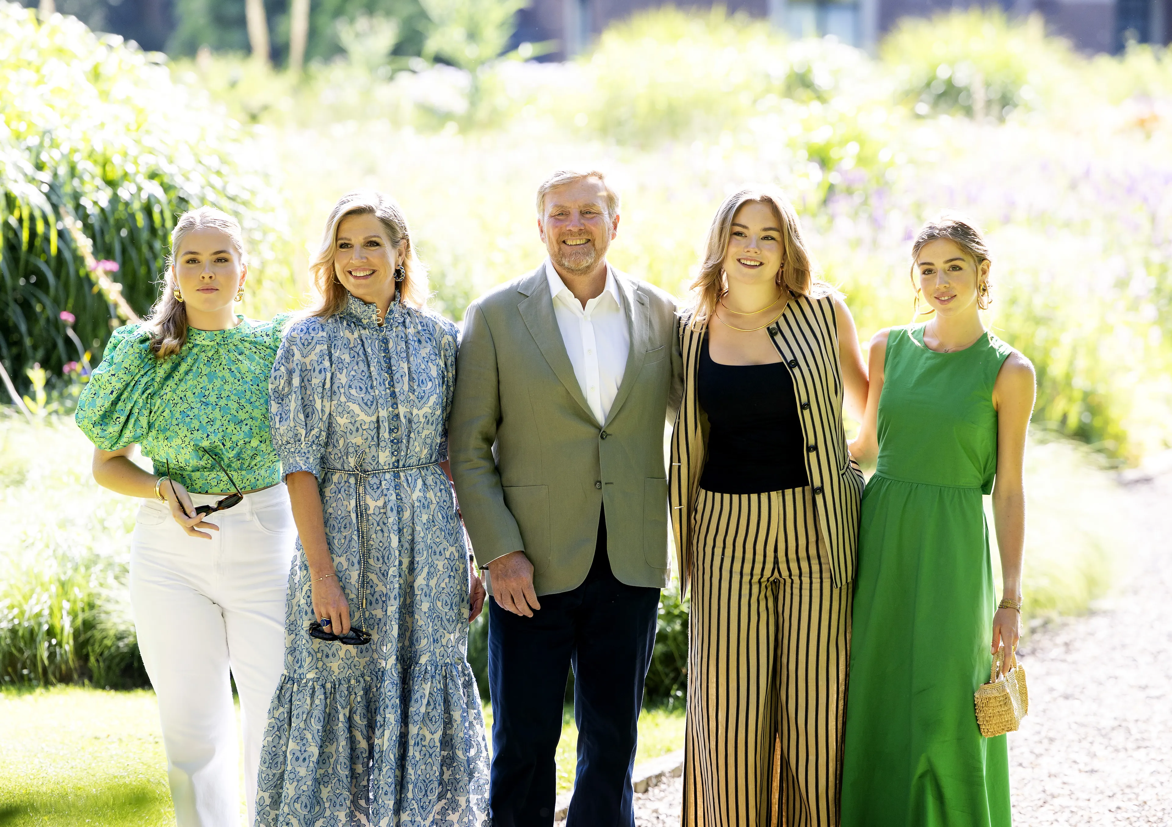 Bij een zomerse fotosessie hoort een zomerse jurk. Het was die dag ook tropisch warm, dus een zwierige jurk was geen overbodige luxe. De koningin liet haar oog vallen op een blauw-witte jurk met pofmouwen van Zimmerman. De jurk heeft knoopjes aan de voorkant en een strik om de taille.