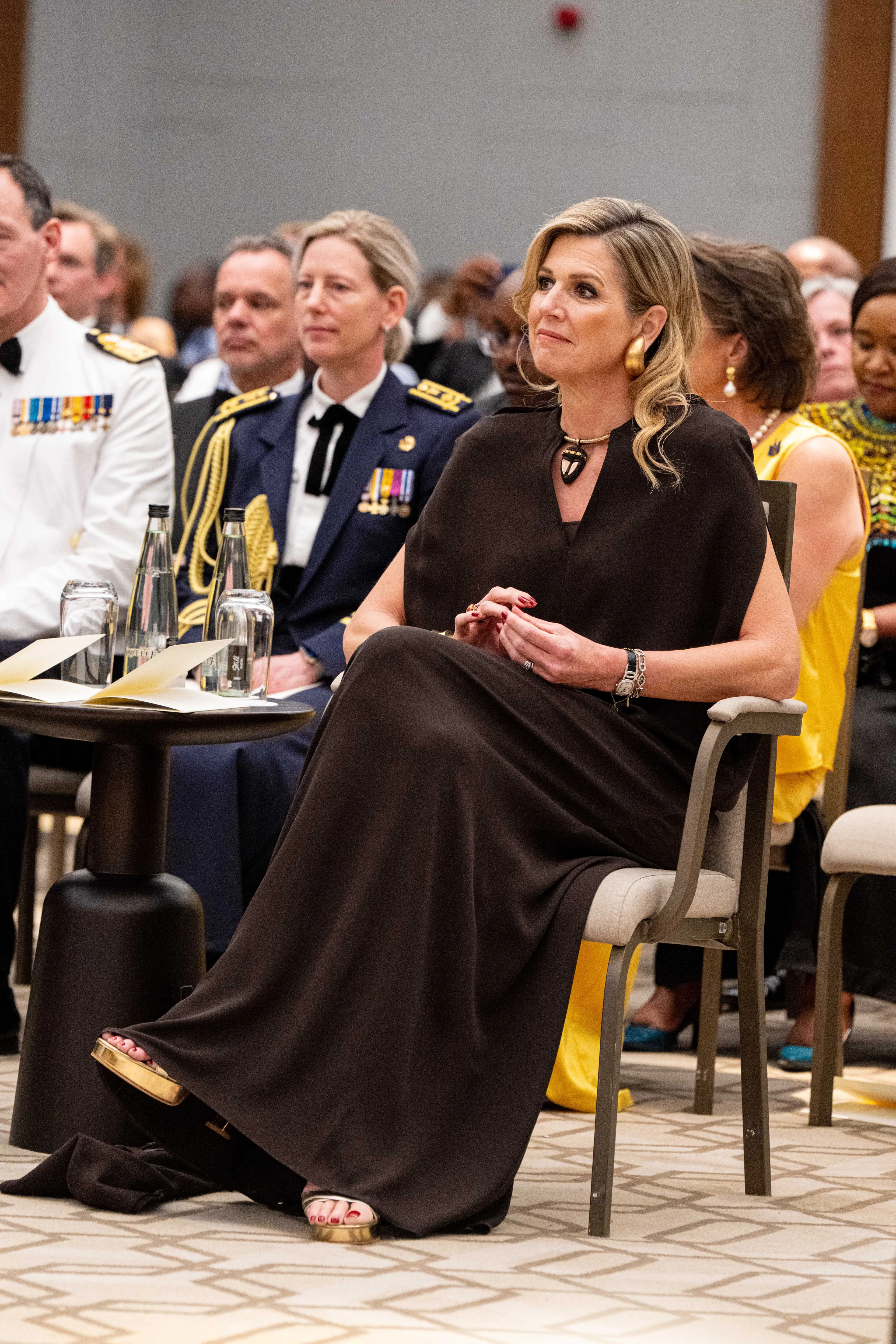 Tijdens het staatsbanket in Suriname verscheen koningin Máxima in een nieuwe galajurk van Natan met een diepe V-hals en open rug. Door de transparante tule bleef het decolleté van de koningin bedekt. Tijdens het diner droeg de koningin een sjaal om haar rug heen. Onduidelijk is waarom.