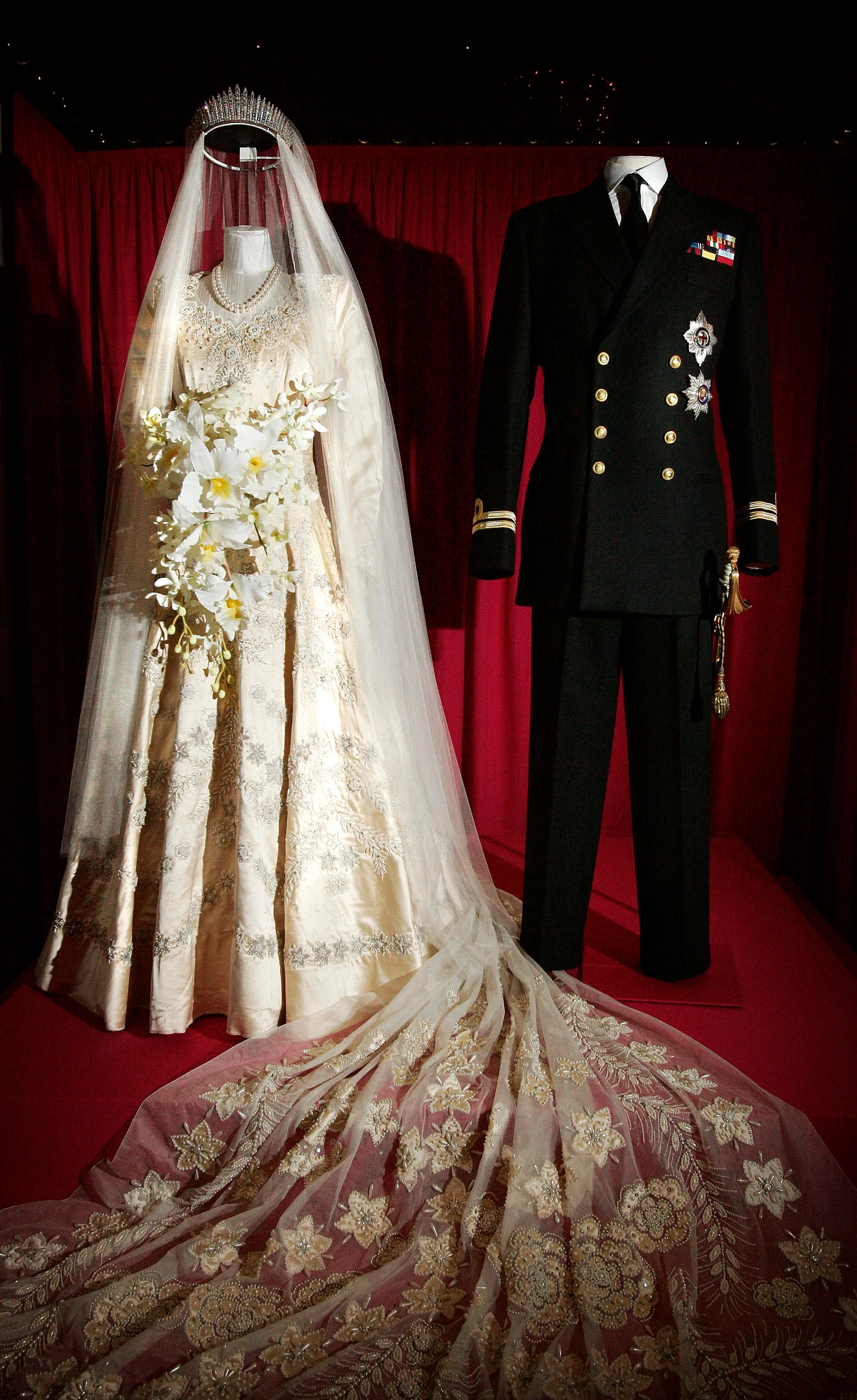 Op de foto van de trouwjurk van koningin Elizabeth kun je ook het diadeem zien dat The Queen die dag droeg, en dus uitleende aan haar kleindochter. Het glanzende diadeem heet het 'Queen Mary's Diamond Fringe Tiara', en werd in 1919 gemaakt door Gerrard en Co. Het bevat 47 diamanten 'repen' met daartussen 46 dunne staafjes van diamant.