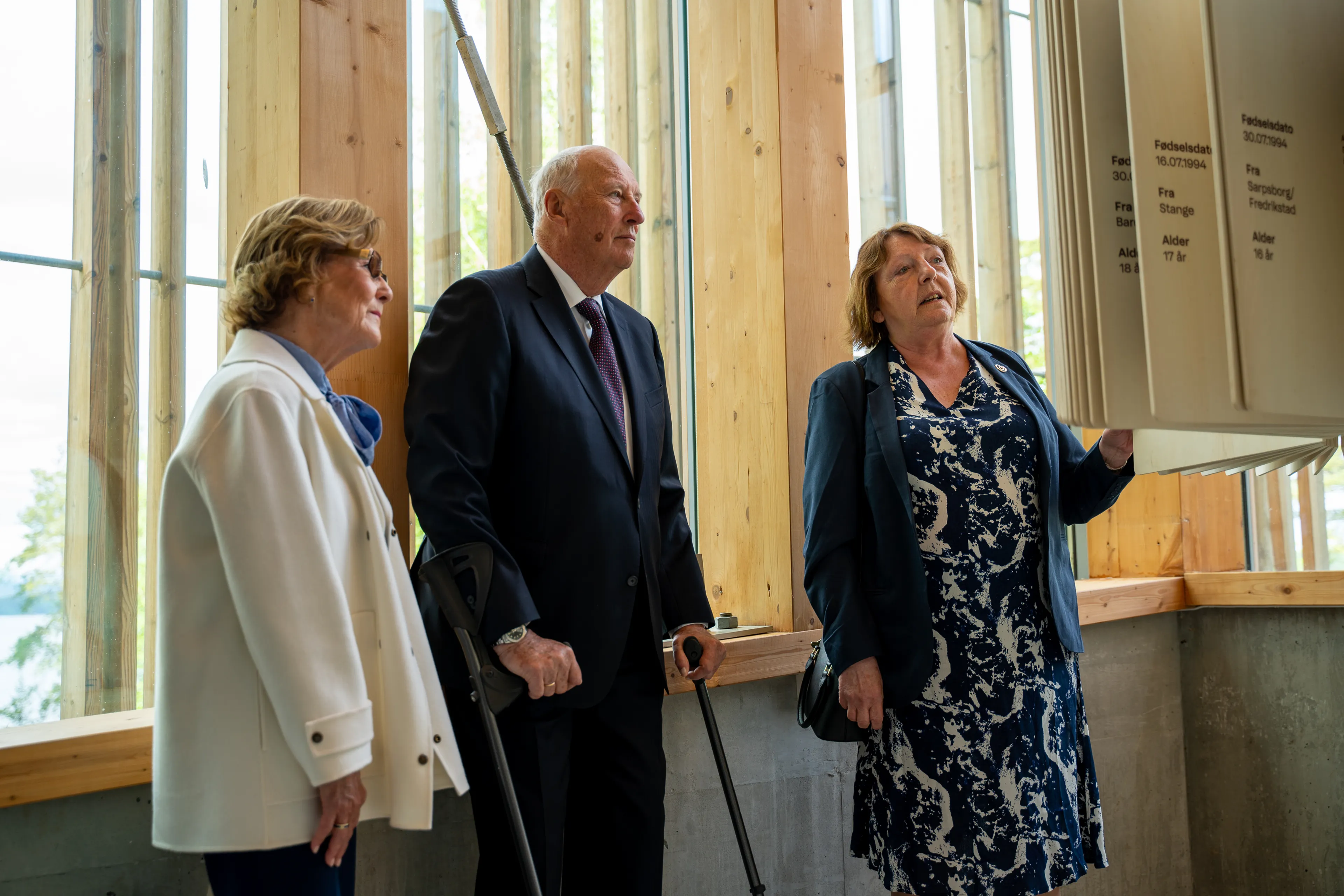 Harald (85) en Sonja (84) brachten een bezoek aan de nieuwbouw op Utøya. Het gebouw is deels gemaakt van resten van de oude aula die na de aanslag is afgebroken. Het gebouw wordt ondersteund door 69 pilaren. Die symboliseren de 69 slachtoffers die op het eiland vielen bij de aanslag.