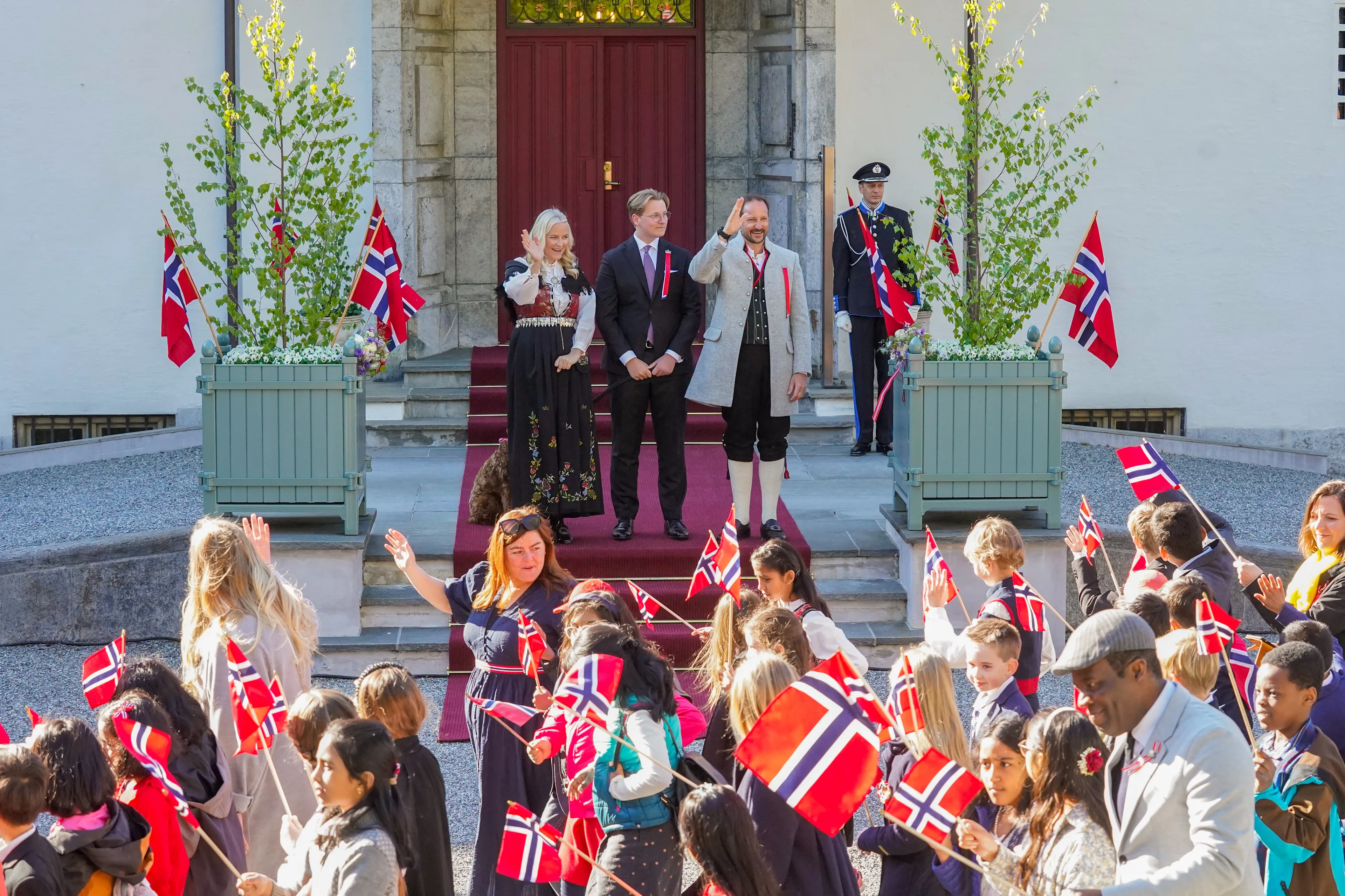 De familie reed daarna naar Oslo, waar ze – samen met koning Harald en koningin Sonja – opnieuw een stoet kinderen voorbij zagen komen. De koninklijke familie begroette de kinderen vanaf het balkon van het koninklijk paleis.