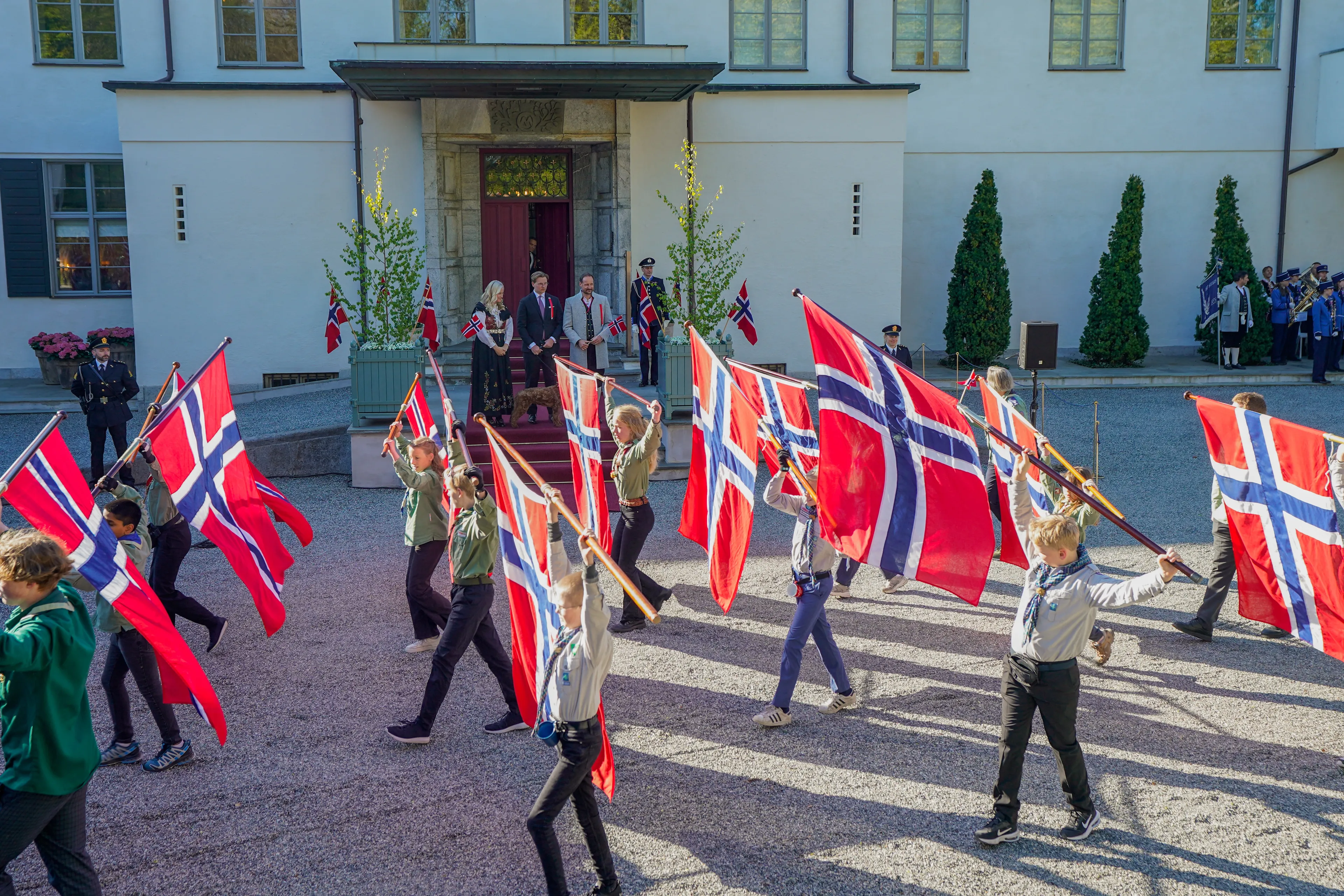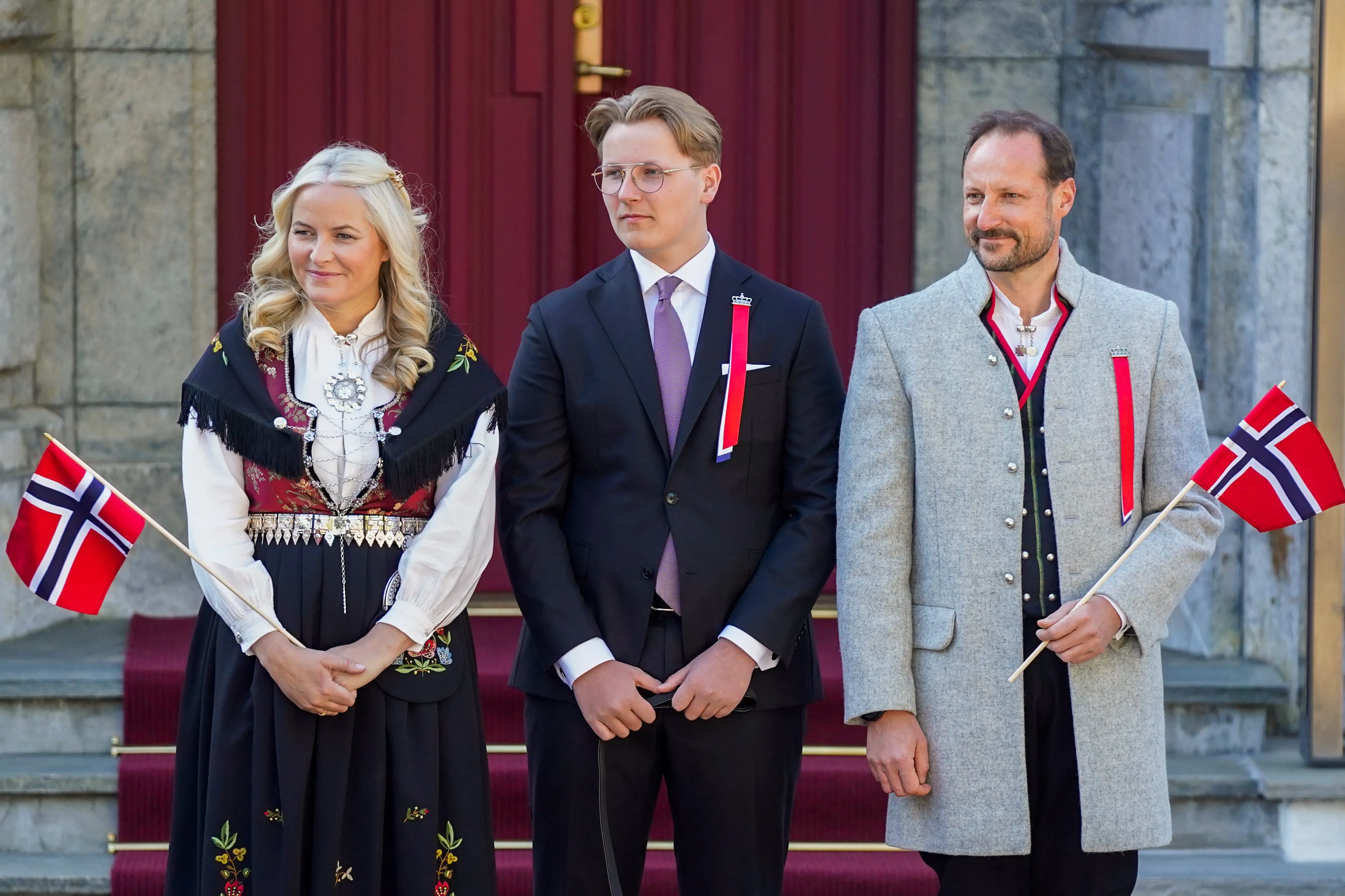 Het hele land staat op 17 mei stil bij het tekenen van de grondwet in 1814. Een feest voor iedereen, waarbij vooral kinderen een hoofdrol spelen. Veel inwoners van het land dragen vrolijk gekleurde klederdracht. Bij de optocht in Skaugum verschenen ook Haakon en Mette-Marit voor traditionele Noorse kledij. Sverre Magnus had een donker pak aangetrokken.