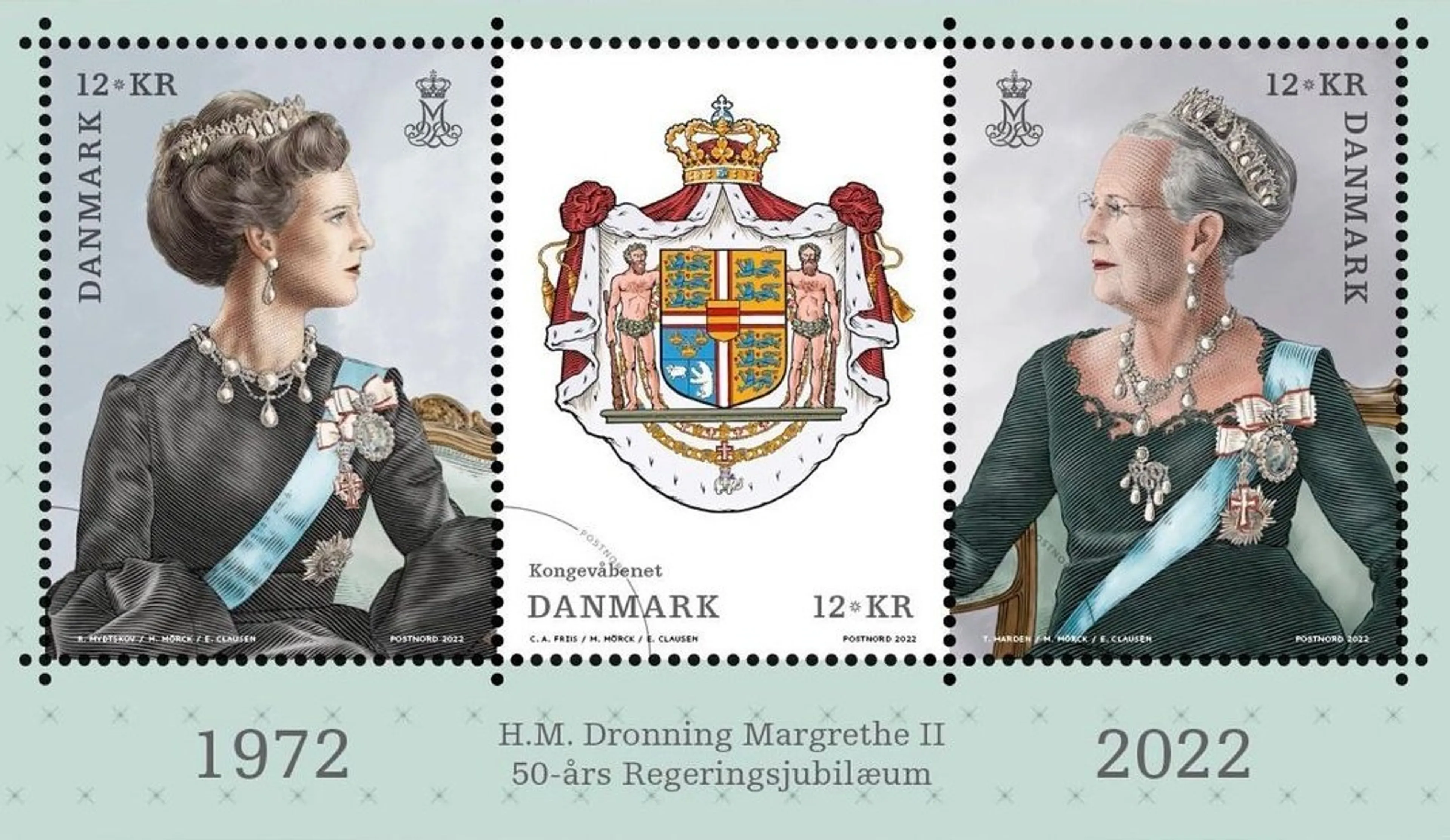 Ter gelegenheid van haar regeringsjubileum worden er komende maandag alvast drie speciale postzegels uitgebracht door PostNord. Op het postzegelvel wordt Margrethe twee keer afgebeeld: aan de ene kant als jonge en pas benoemde regent en aan de andere kant als huidig staatshoofd. Tussen de twee afbeeldingen staat het koninklijke wapen.
