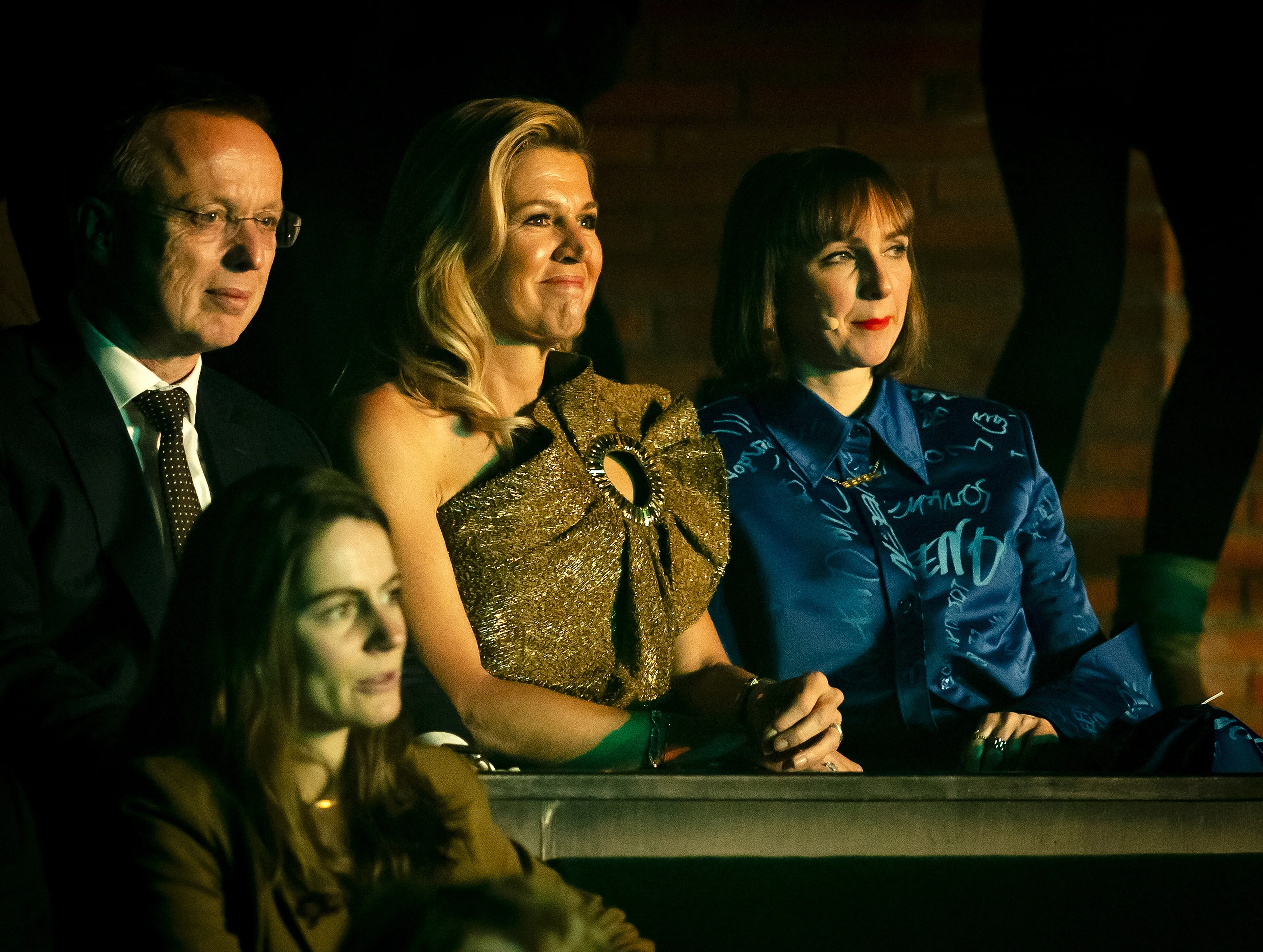 Ook zagen we de ringen-top van Claes Iversen terug bij de koningin. Máxima droeg 'm voor het eerst in 2019 en sindsdien wordt ze er vaker in gezien. De top is goud, heeft glitters, een opvallende schouder en dus een doorkijkje waardoor hij extra spannend wordt. Vorig jaar spraken we de couturier over dit ontwerp. Hij vertelde toen dat de collectie met de ringen gebaseerd is op onder andere de Afrikaanse stam Ndebele.