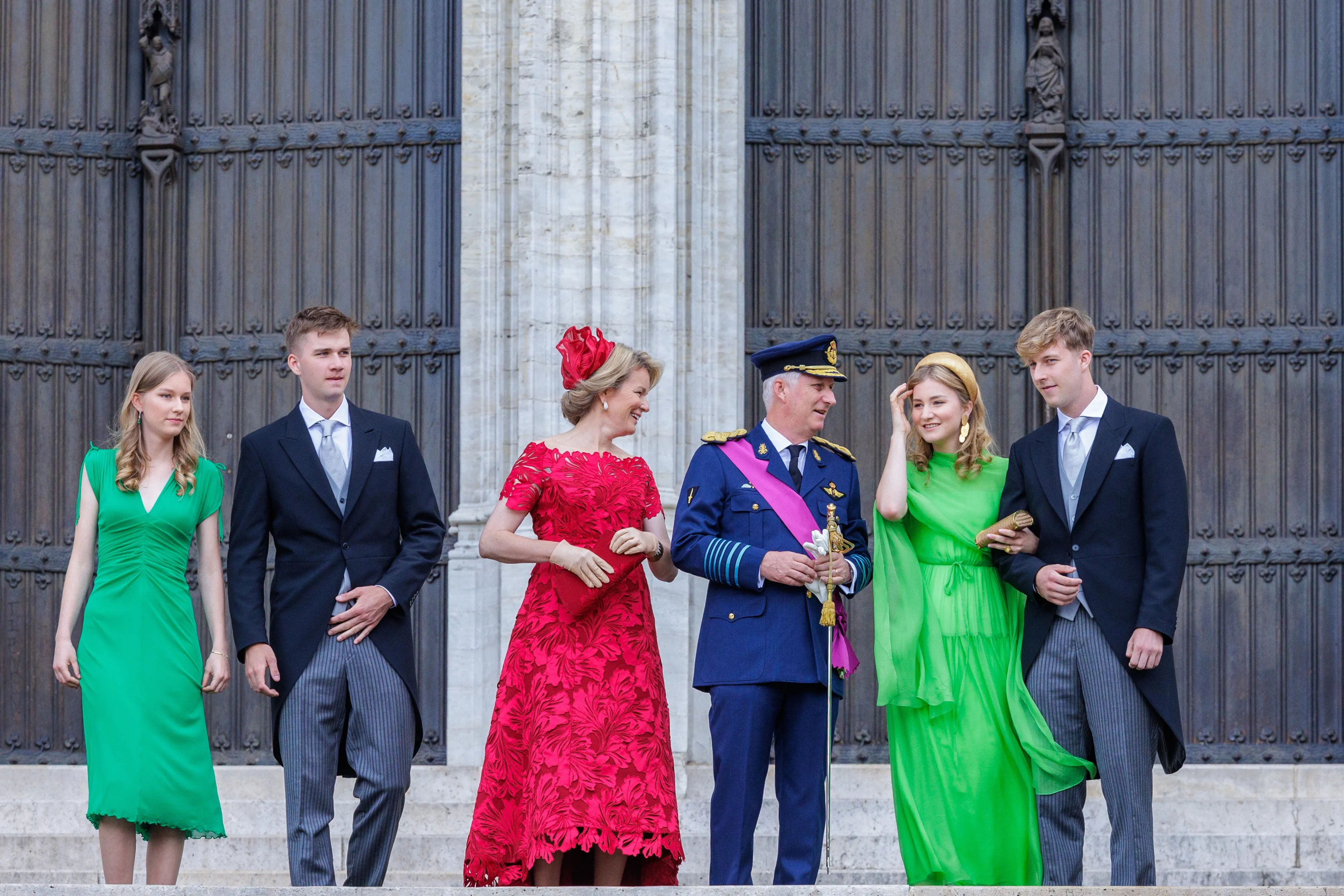 De jongste dochter van het Belgische koningspaar draagt vanochtend ook een groene japon. De jurk is appeltjesgroen en is naar verluidt van Diane von Furstenberg. Ook zij mocht snuffelen in de kast van koningin Mathilde, want ze draagt hierbij diamanten met smaragden van haar moeder.