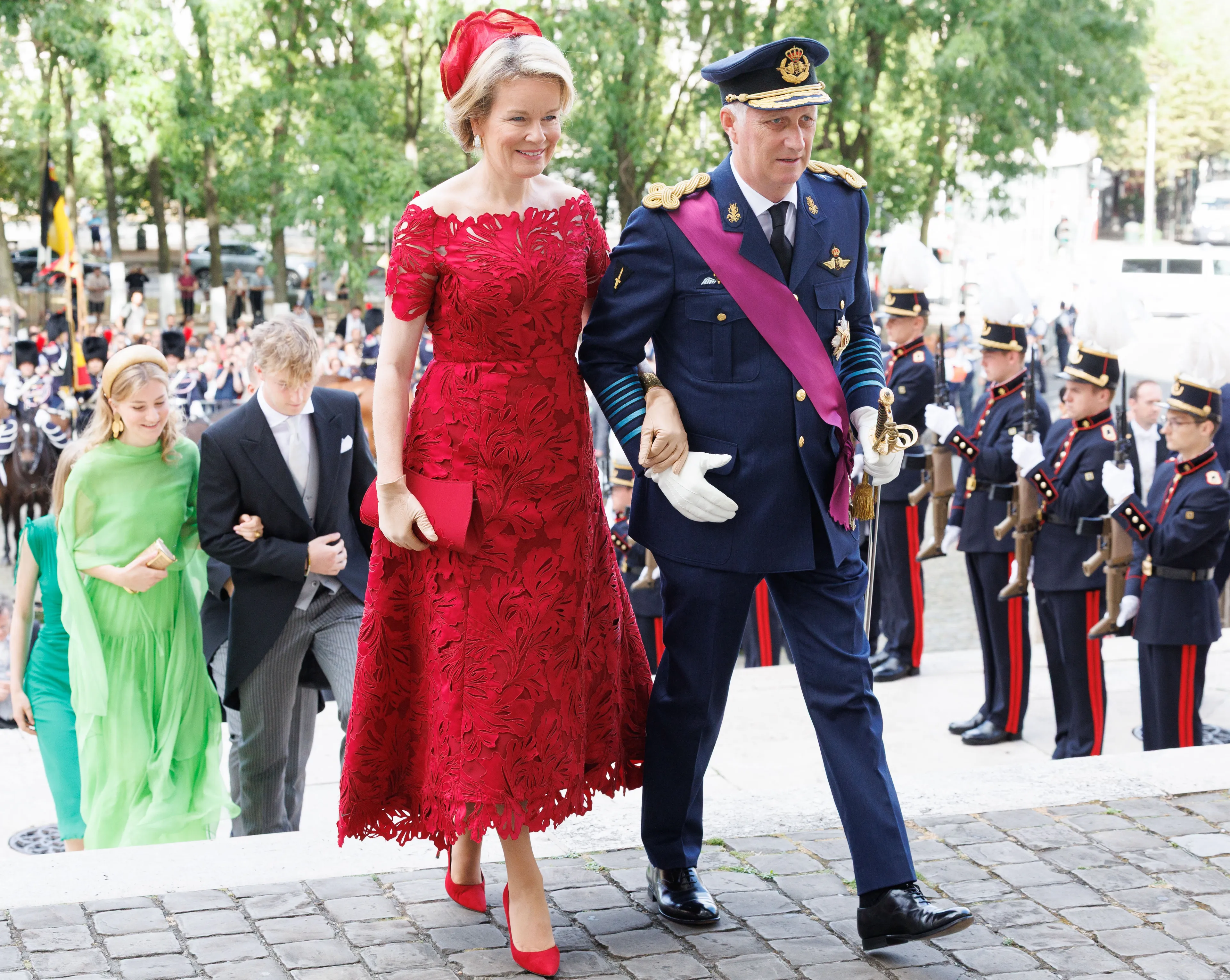 Koningin Mathilde begint de dag in een krachtige outfit. Ze heeft haar oog laten vallen op een kanten rode japon van haar favoriete modehuis Natan. Deze combineert ze met een rood hoofddeksel van Fabienne Delvigne. Deze 'Floria' hoed is gemaakt van bananenvezels en in precies dezelfde kleur geverfd als de jurk van de koningin, zo laat het atelier van Fabienne Delvigne weten op social media. In haar hand heeft Mathilde een bijpassende clutch van dezelfde ontwerpster. Deze 'Virginia' tas is op maat gemaakt, want als je goed kijkt zie je het patroon van de jurk terugkomen op de tas.