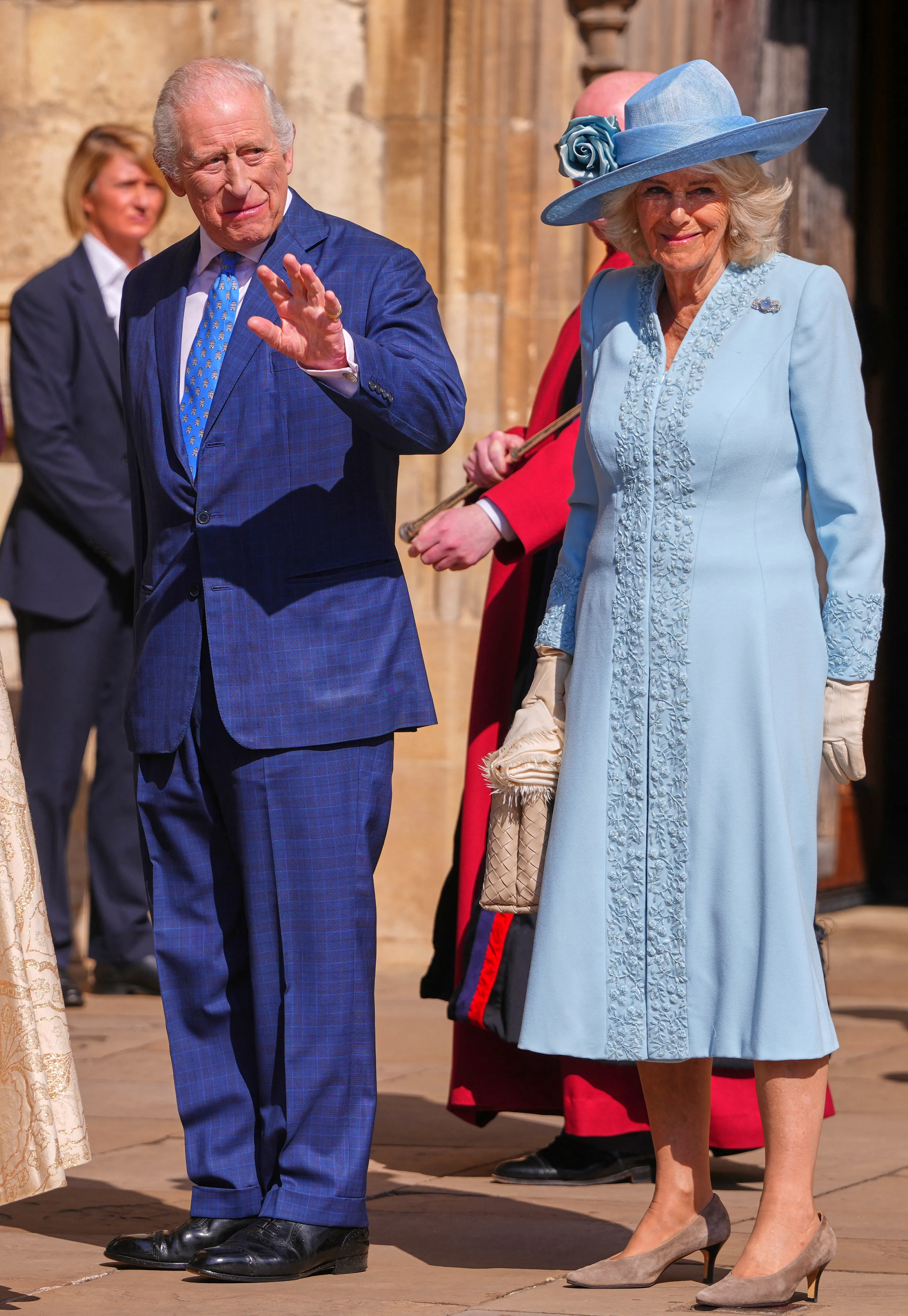 Koning Charles en koningin Camilla waren wél in Windsor voor de paasviering. Koningin Camilla draagt vandaag een lichtblauwe japon met een bijpassende hoed van Phillip Treacy.