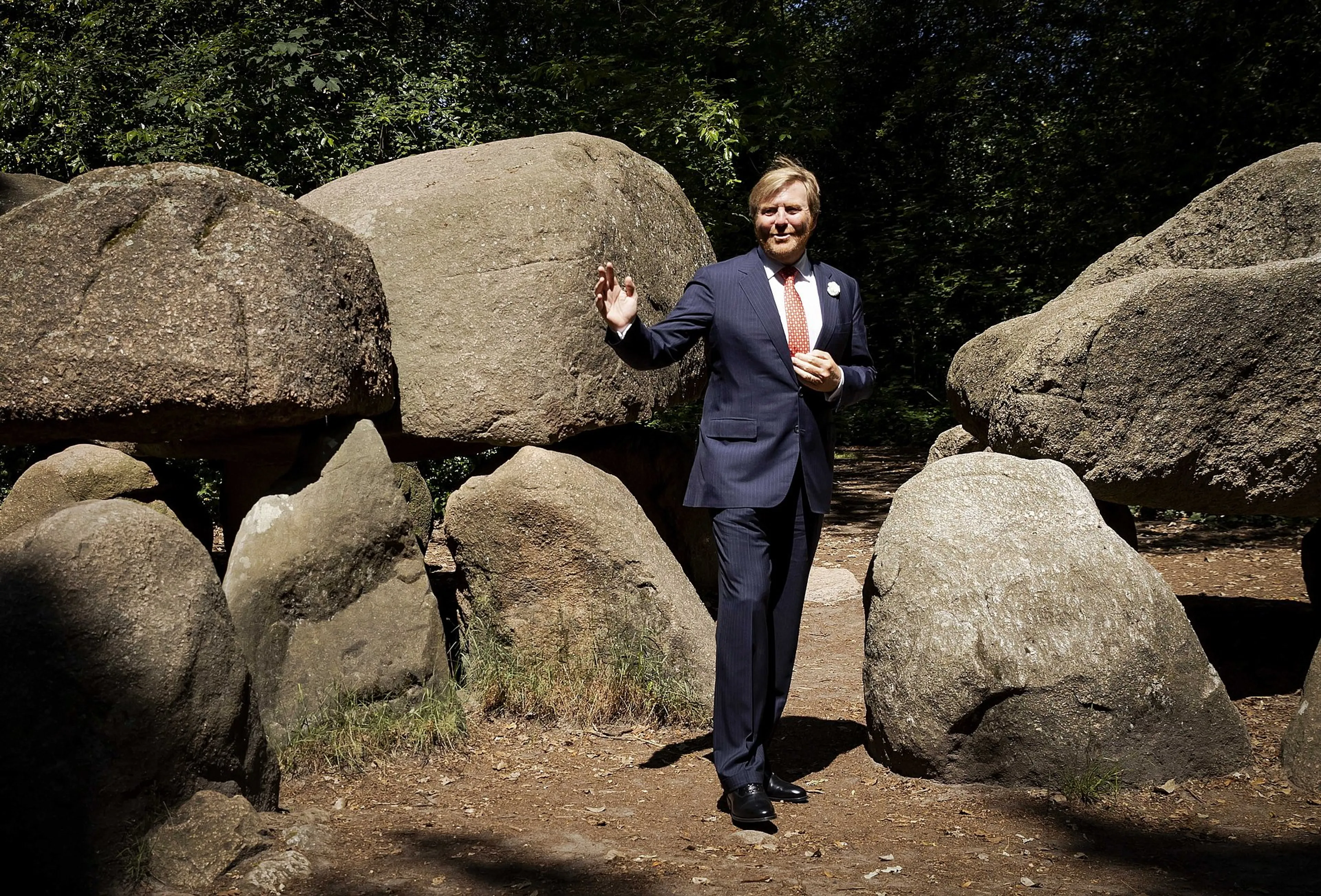 Paul staat bij het hunebed in Borger, Drenthe. Hier bracht de koning in juni 2020 een bezoek. Hij liet zich informeren over de gevolgen van de coronacrisis op de cultuursector. Hunebedden werden jaarlijks door ongeveer 200.000 mensen bezocht.