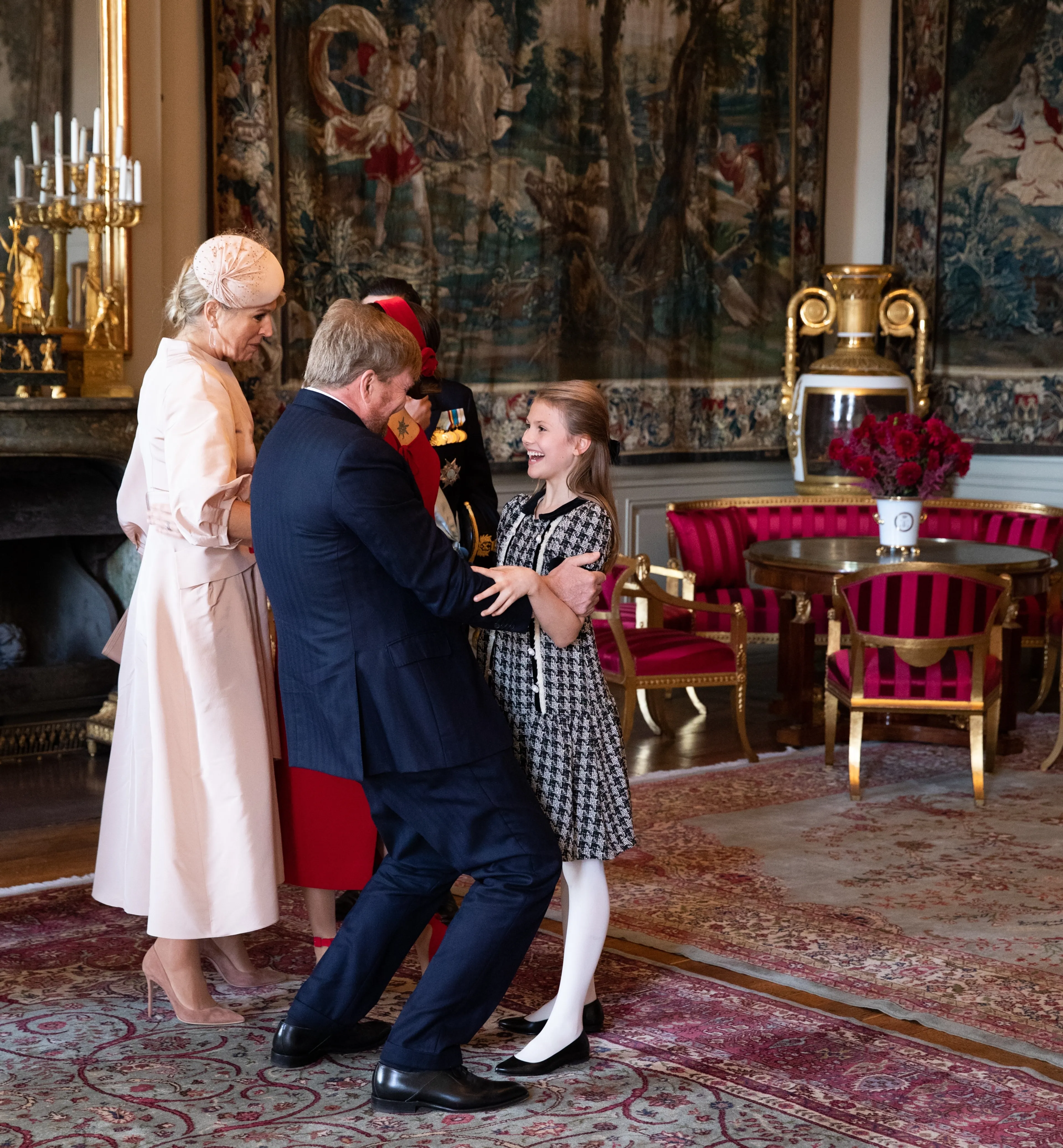 Koning Willem-Alexander, die peetvader van Estelle is, zei dat hij "zijn peetkind" naast hem op de foto wilde. "Wij koesteren de vriendschap die al zo lang tussen onze families wordt gevoeld en die van generatie op generatie wordt doorgegeven", sloot hij af.