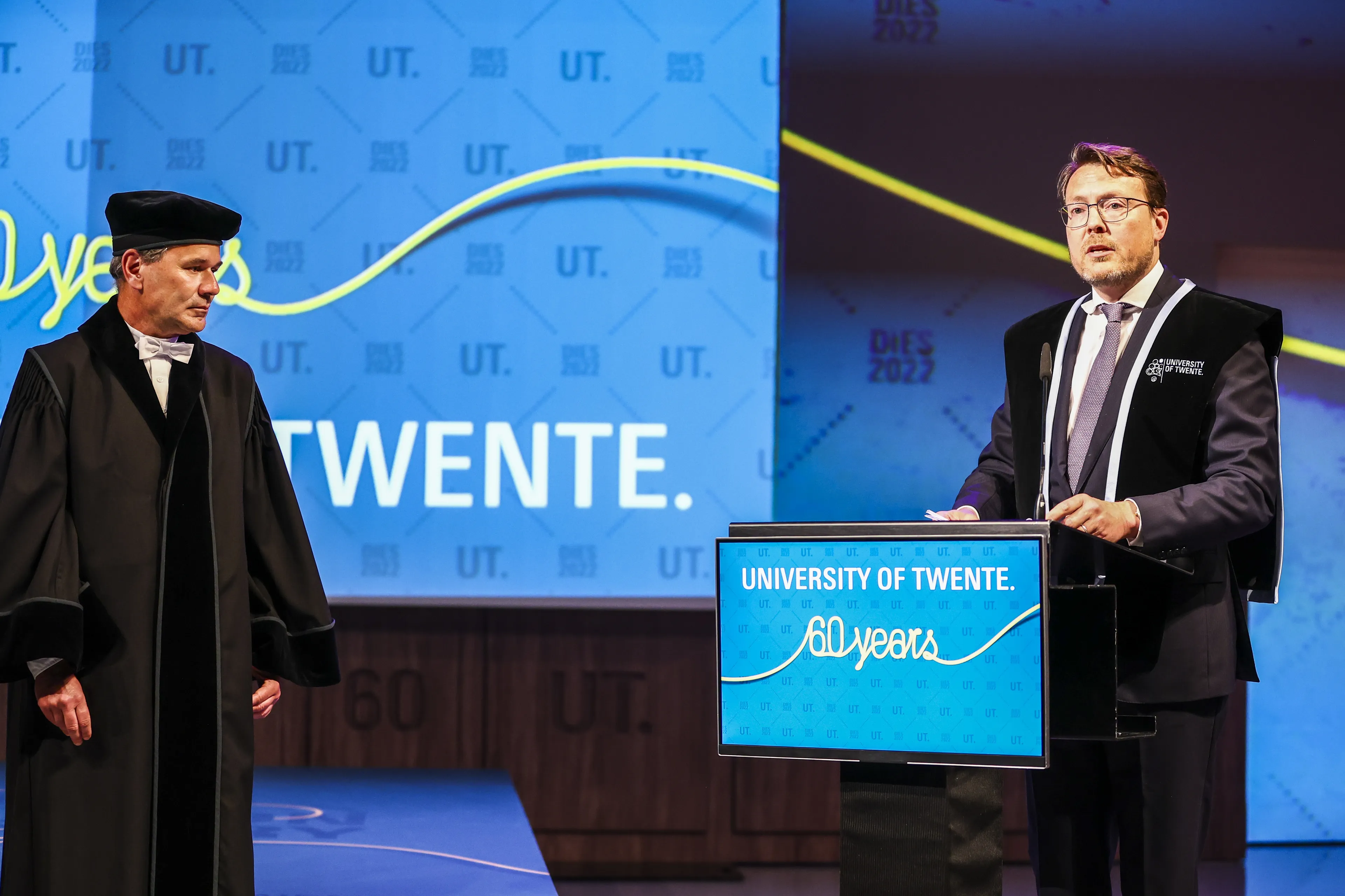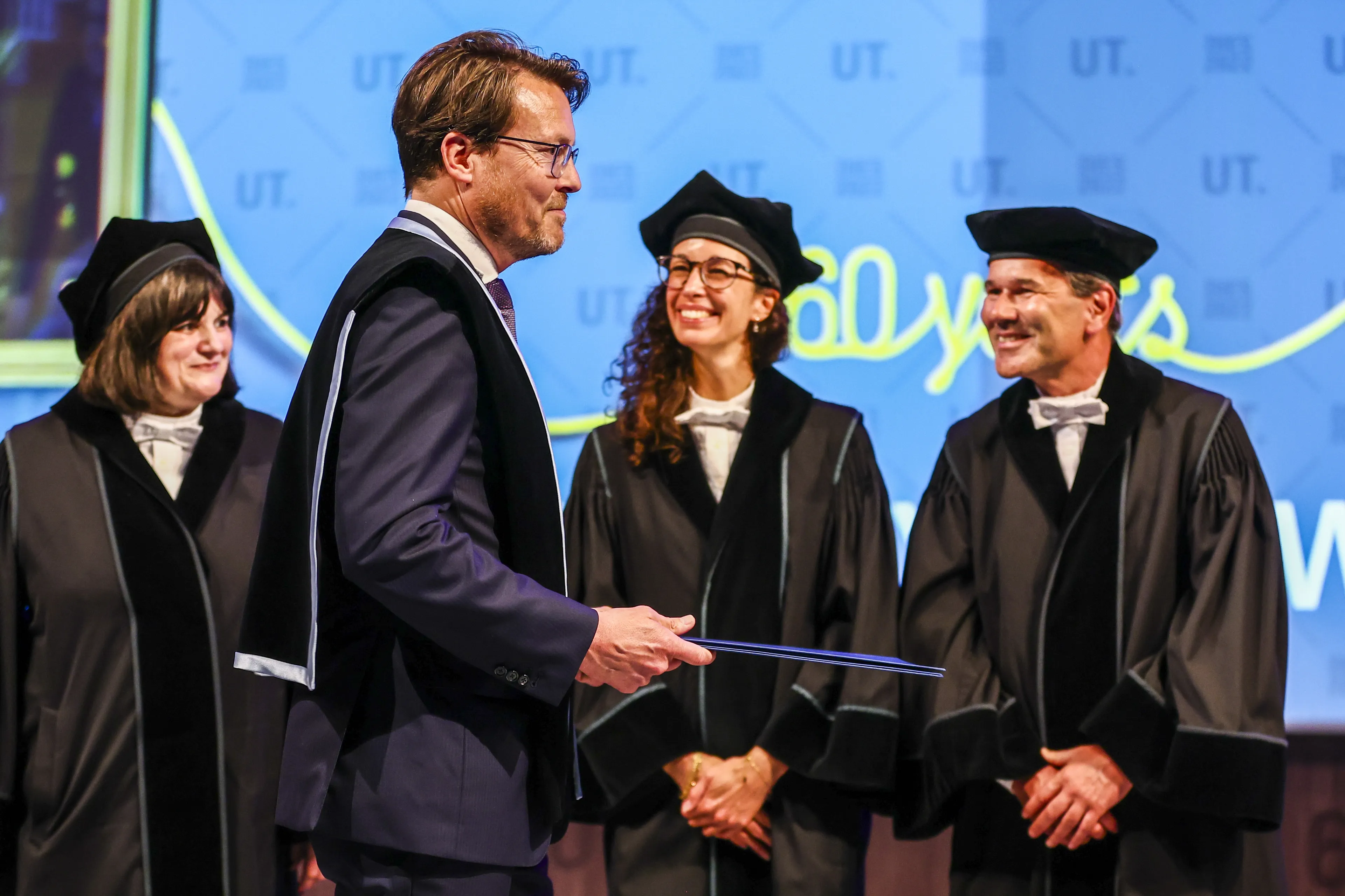 De universiteit reikt elke vijf jaar eredoctoraten uit "aan mensen die zich bijzonder verdienstelijk hebben gemaakt voor wetenschap en samenleving", meldt de Universiteit Twente. Het jubileum zou eigenlijk afgelopen najaar worden gevierd, maar vanwege de coronapandemie was dit verplaatst naar vrijdag.