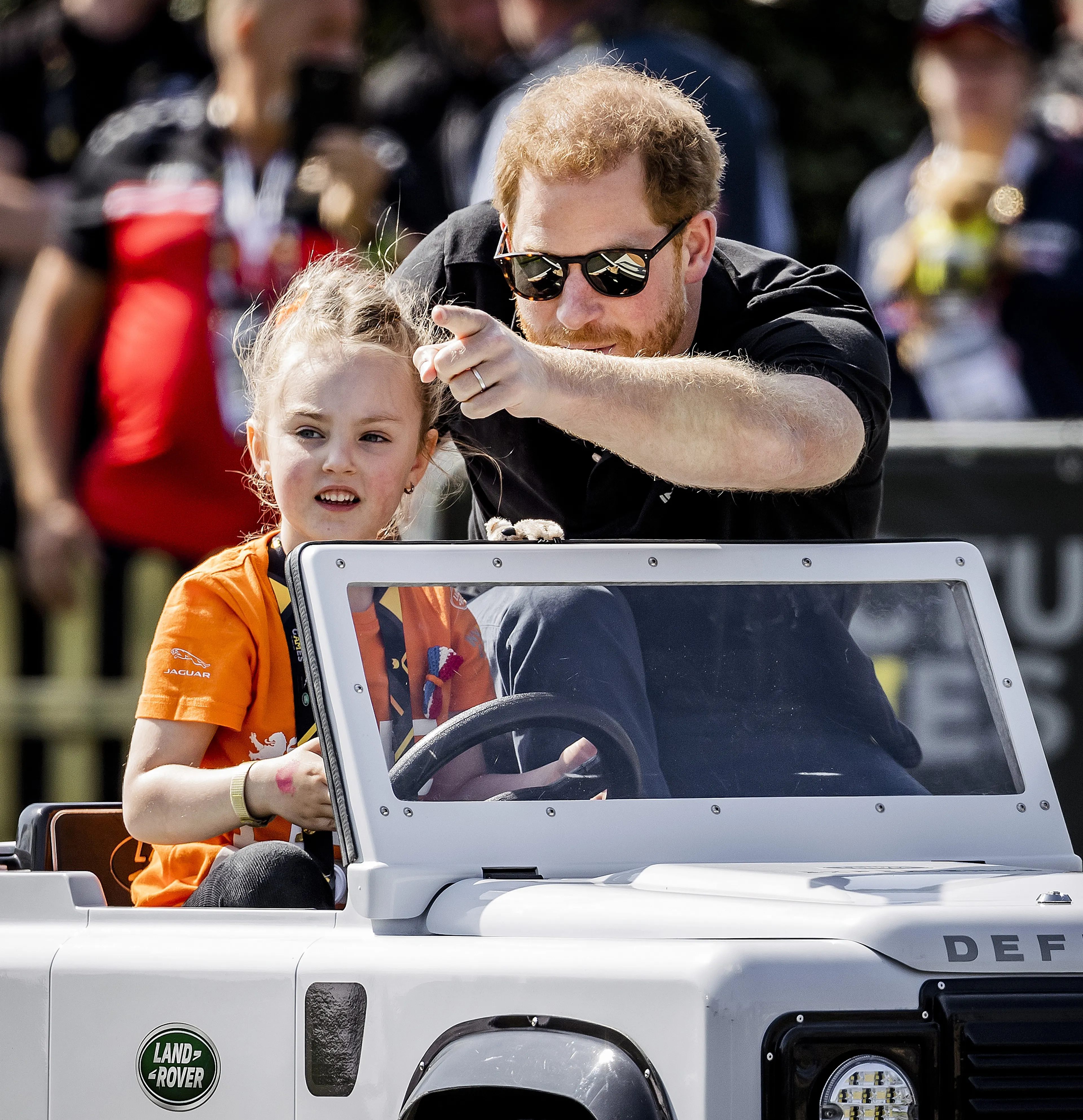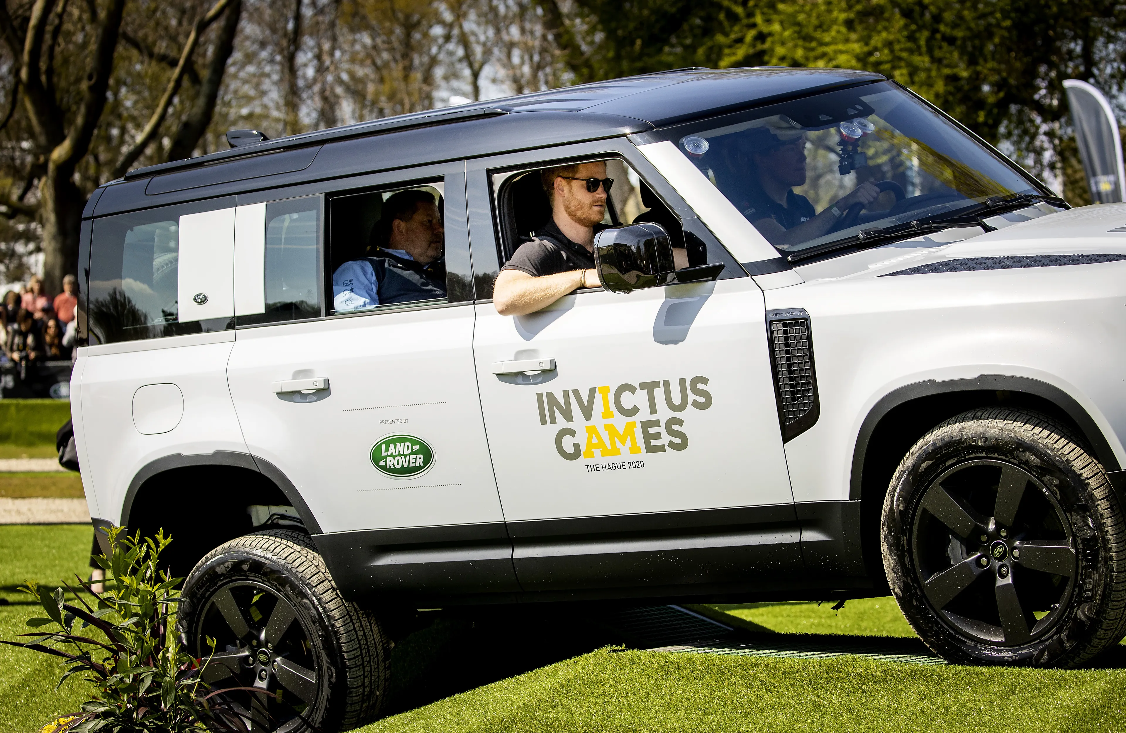 Bij de Land Rover Driving Challenge rijden verscheidene landen in een auto over een uitdagend parcours met heuvels en obstakels. Vlak voor het momentje met de kinderen ging Harry ook voor het echte werk. De prins stapte als passagier in een Jeep waarmee over het terrein werd gereden. Harry had er duidelijk lol in een zwaaide uitgebreid naar de omstanders. Ook het publiek genoot van de 'show': omstanders riepen luidt de namen van Harry en Meghan.