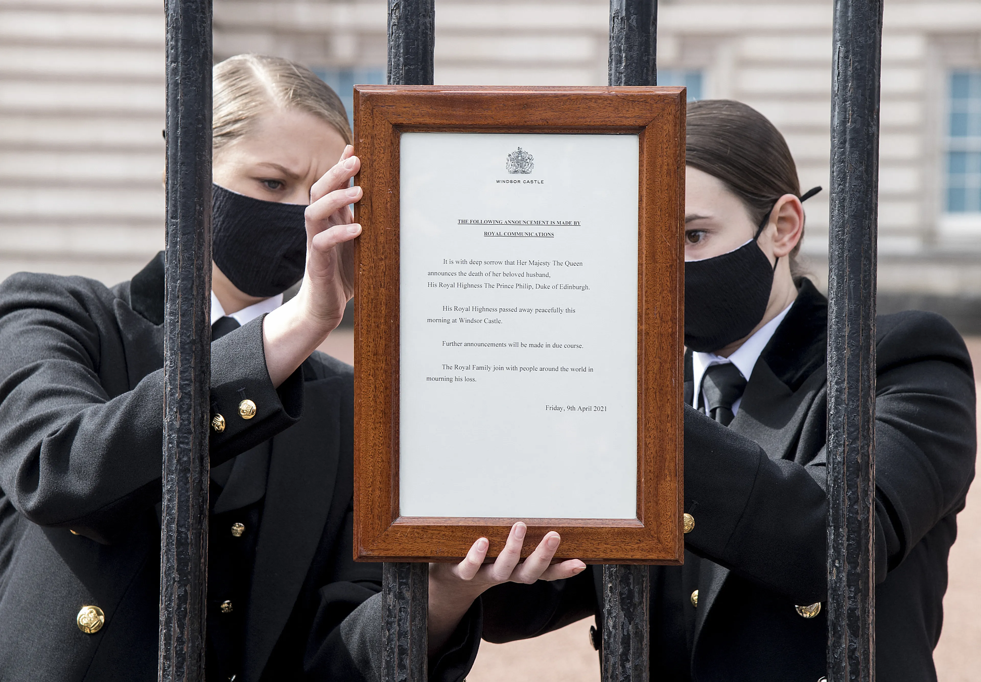 Het overlijden van Philip is ook op traditionele wijze bekendgemaakt bij Buckingham Palace. De verklaring waarin koningin Elizabeth "met groot verdriet" het overlijden van haar man bekendmaakt werd korte tijd aan het hek gehangen. Het lijstje werd na een uur weggehaald om te voorkomen dat het er te druk zou worden. De eerste bloemen liggen al bij Buckingham Palace.