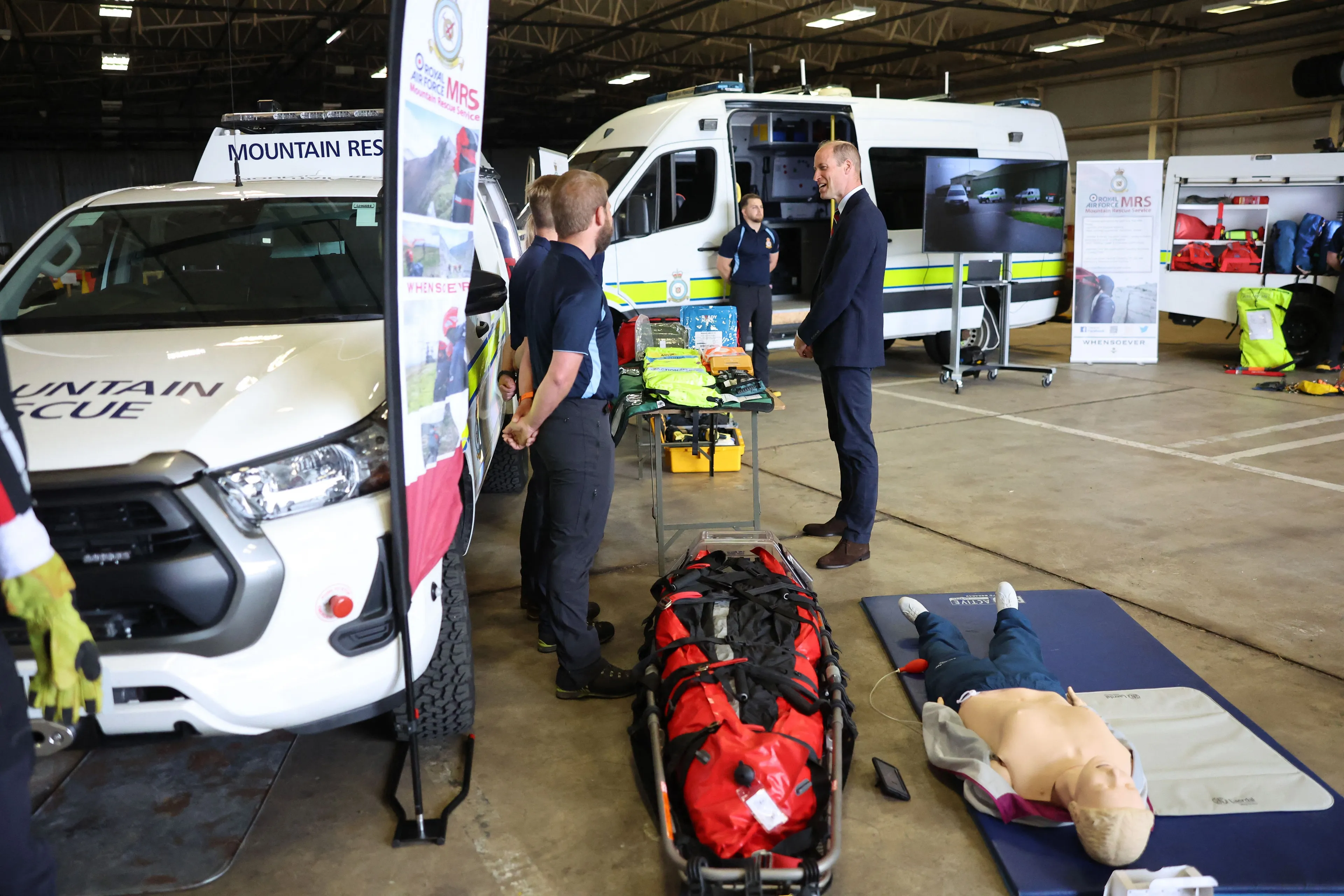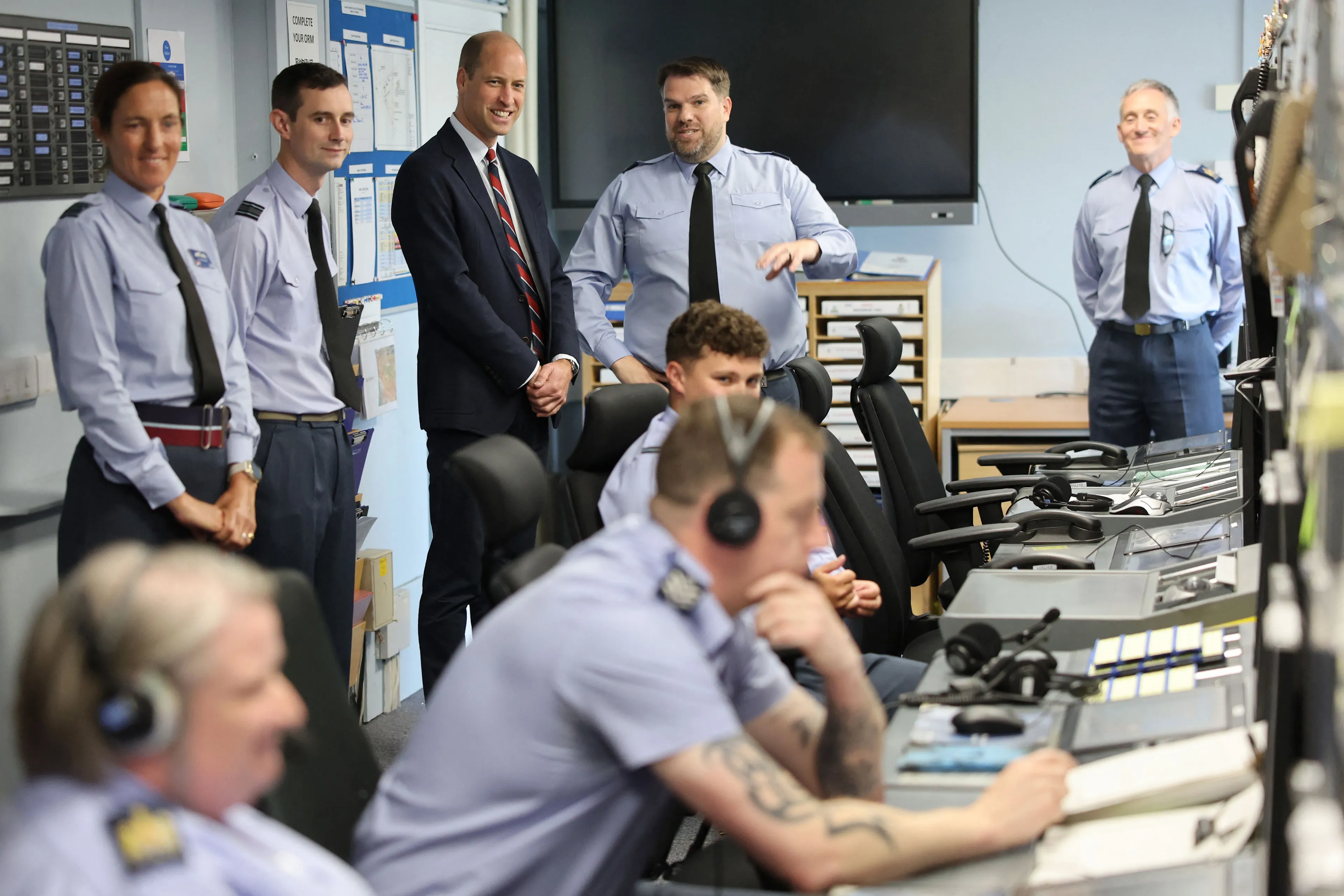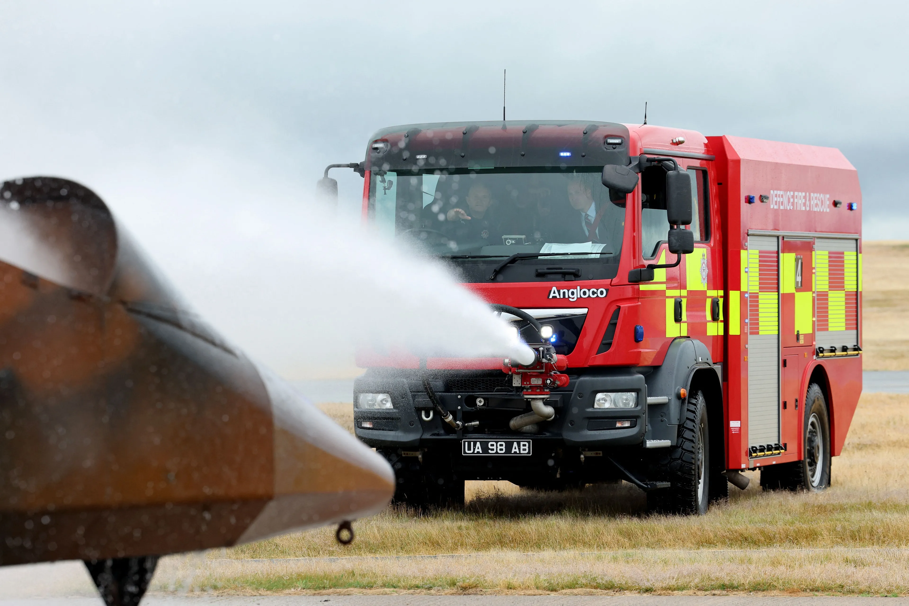 Bij de Fire en Rescue-sectie van de basis sloot prins William zich aan bij brandweermannen in een simulatie-oefening, waarbij hij vanuit een brandweerwagen een slang bediende om de vlammen in een vliegtuig te doven. De 42-jarige prins grapte dat hij probeerde "de media te grazen te nemen met de brandweerslang", maar dat de bemanning die met hem was hem daar "braaf van weerhield".