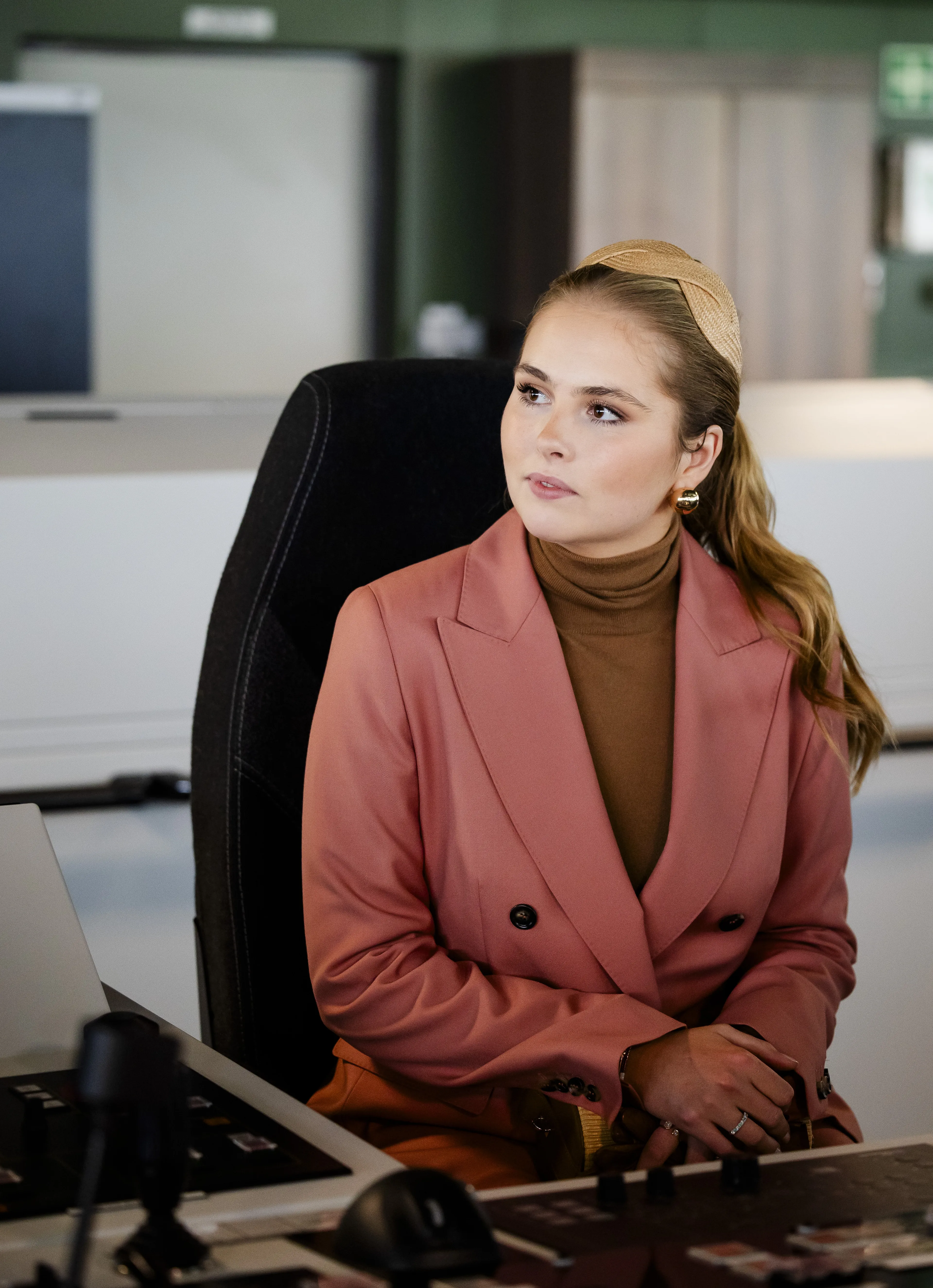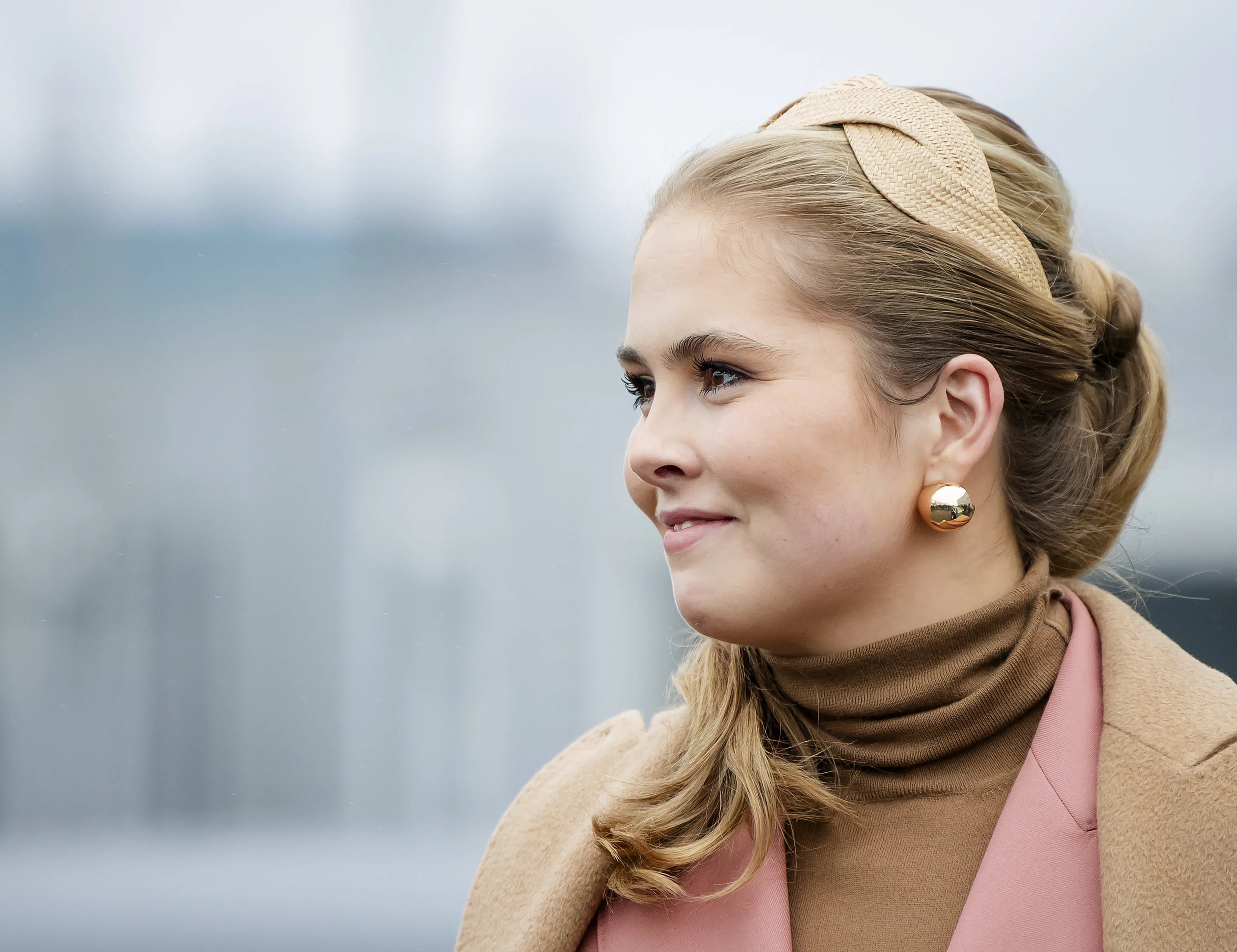 Prinses Amalia droeg vandaag een roze broekpak van Max Mara, die ze ook aan had tijdens een herdenkingsconcert in Griekenland vorig jaar. Amalia combineerde het pak zaterdag met een lichtbruine coltrui en een bijpassende haarband.