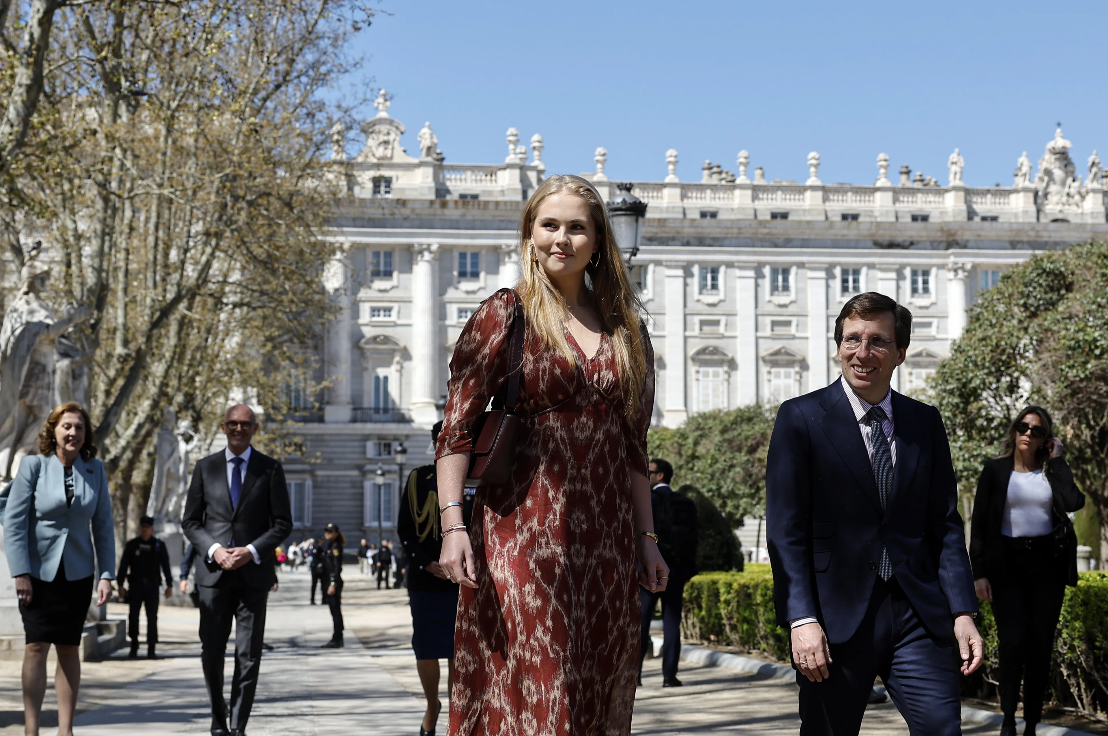 De prinses wordt ontvangen door José Luis MartÃnez-Almeida, de burgemeester van Madrid. Samen maken ze een korte wandeling door het park waarna ze bij de tulpentuin uitkomen waar de oranje bloemen mooi in bloei staan. Het is haar eerste 'officiële' solo-optreden in het buitenland, in februari had ze in Vlissingen haar eerste solo-optreden in Nederland.