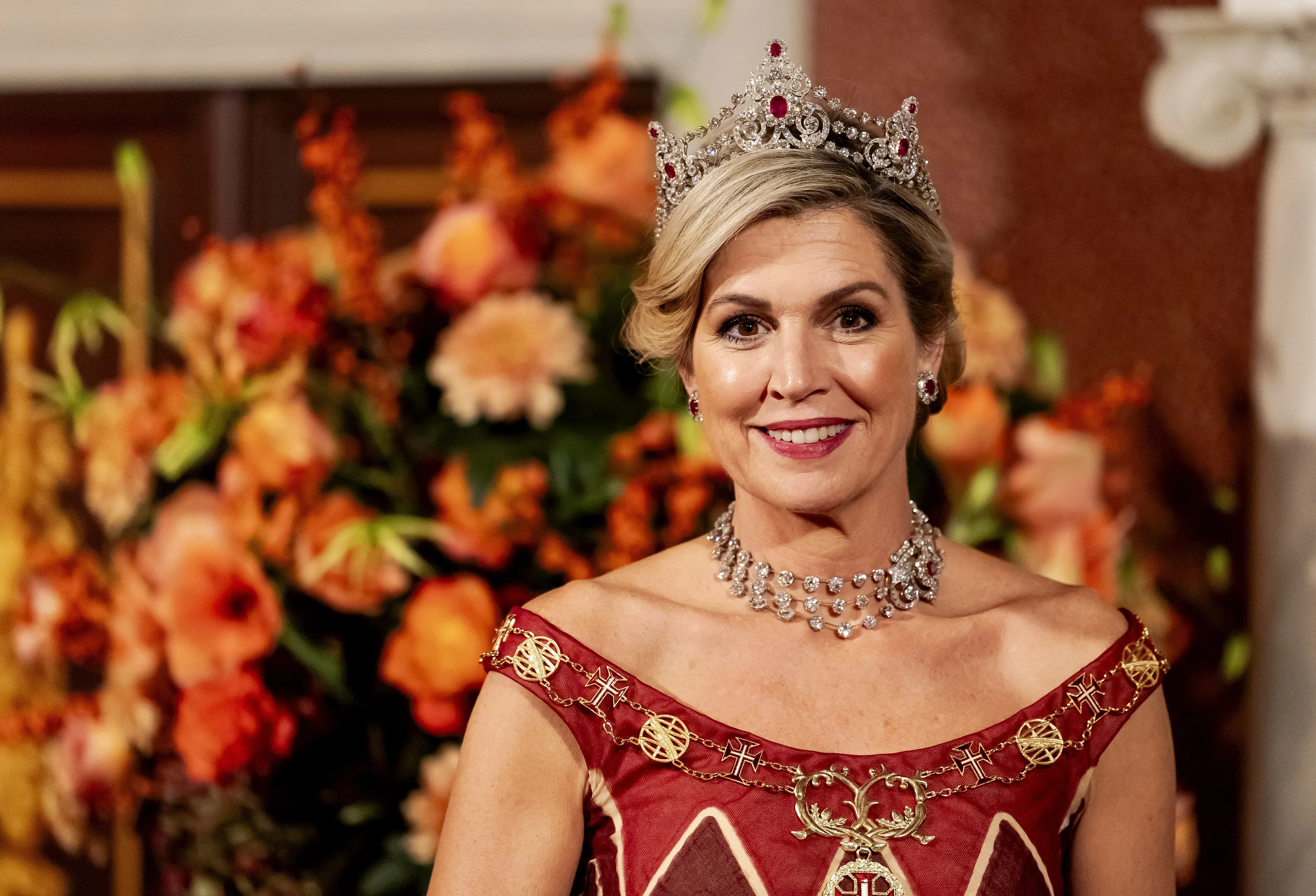 Koningin Máxima draagt een rode japon van Jan Taminiau. We hebben het ontwerp voor het eerst gezien tijdens de plechtigheden rondom de inauguratie van de Japanse keizer Naruhito in 2019. Drie jaar later droeg Máxima de jurk naar de achttiende verjaardag van de Noorse prinses Ingrid Alexandra. Qua juwelen heeft de koningin vanavond gekozen voor de Mellerio parure.