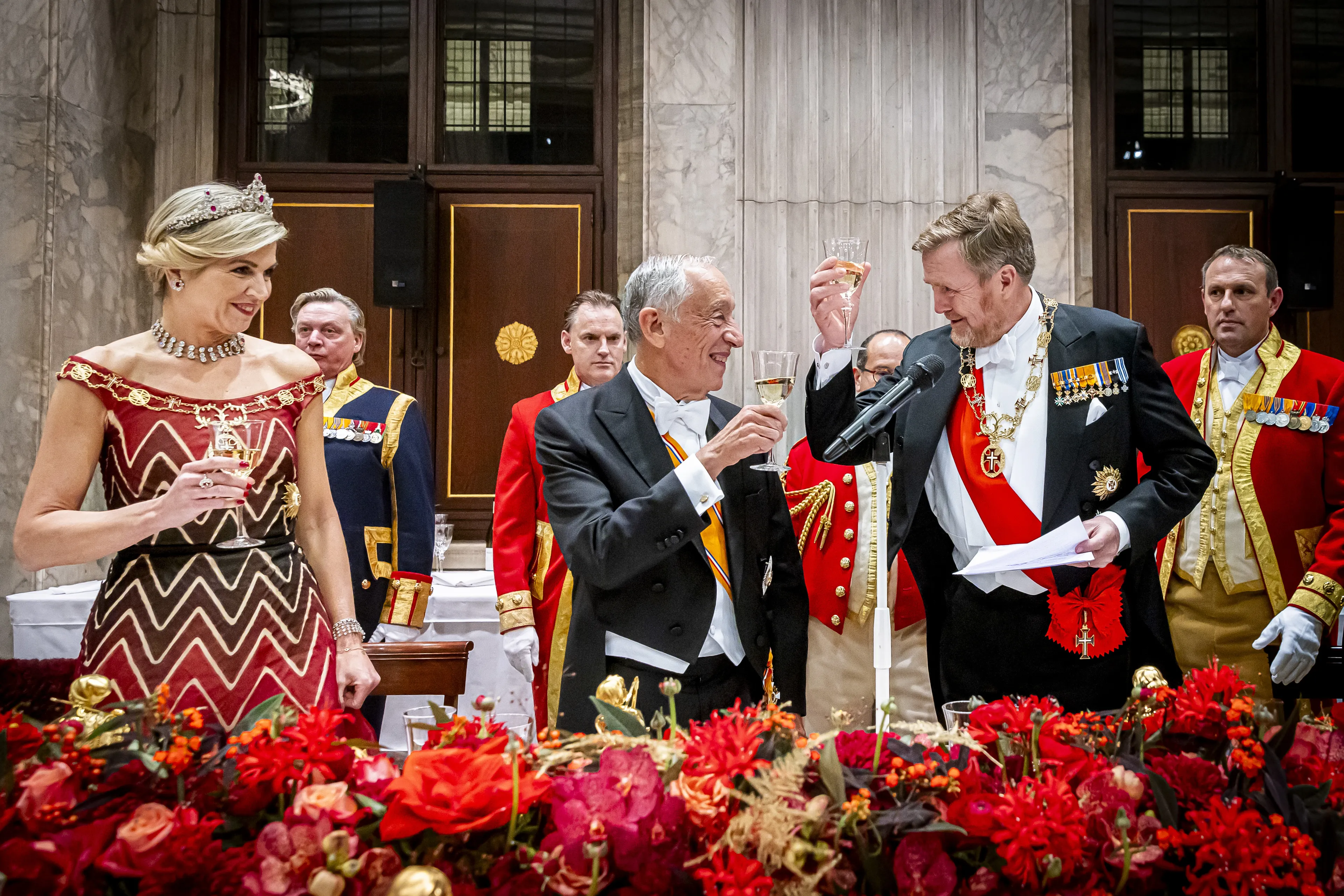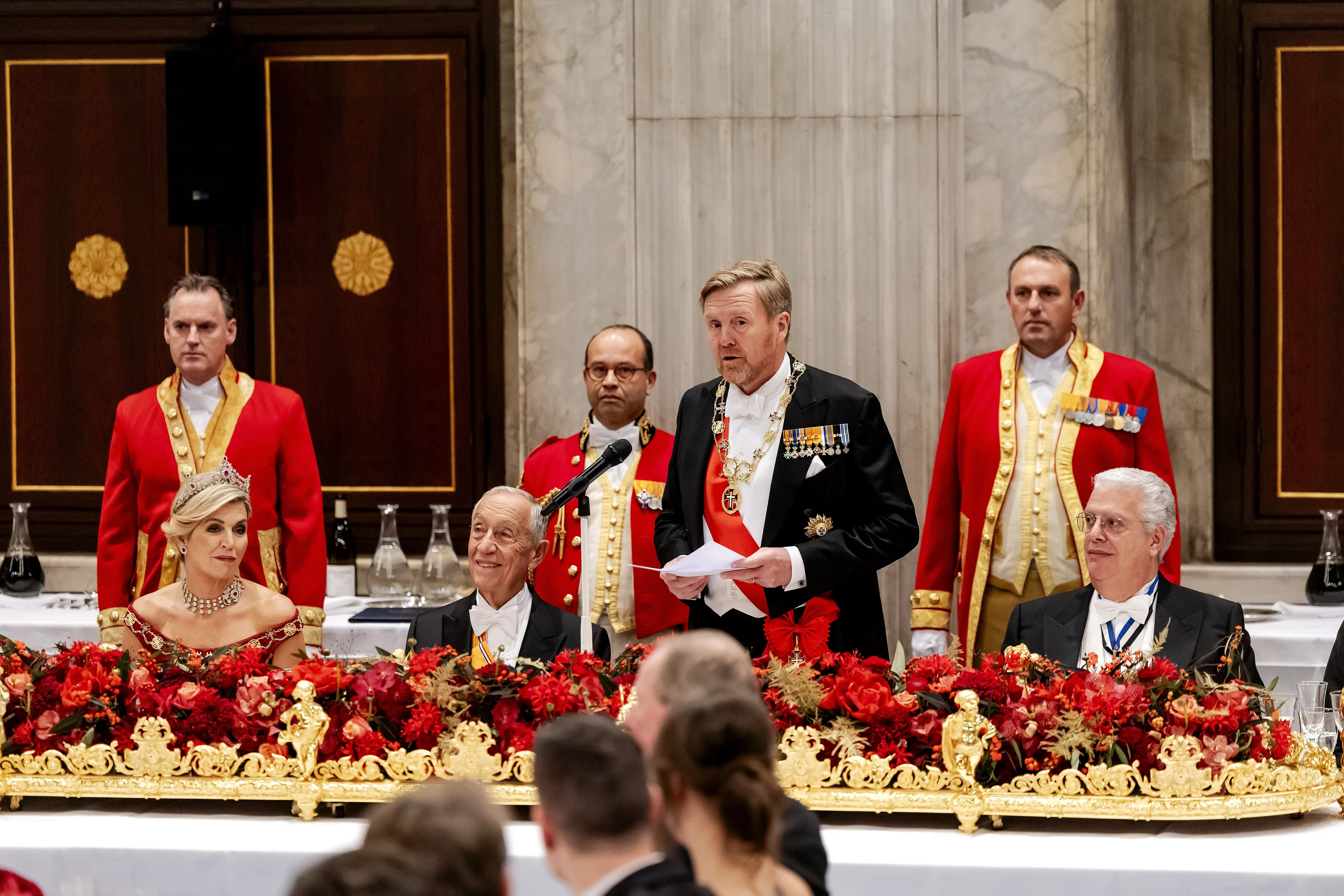 Na een officiële foto en passade (moment waarop het koningspaar en de president hun tafelgasten ontmoeten red.) is het tijd voor de toespraken. Zowel koning Willem-Alexander als president de Sousa spreken elkaar en de genodigden toe. De koning blikt onder meer terug op het staatsbezoek dat Nederland in 2017 aan Portugal bracht. Na een proostmoment en het spelen van de volksliederen kan het staatsbanket, dat in de Burgerzaal van het paleis gehouden wordt, beginnen.