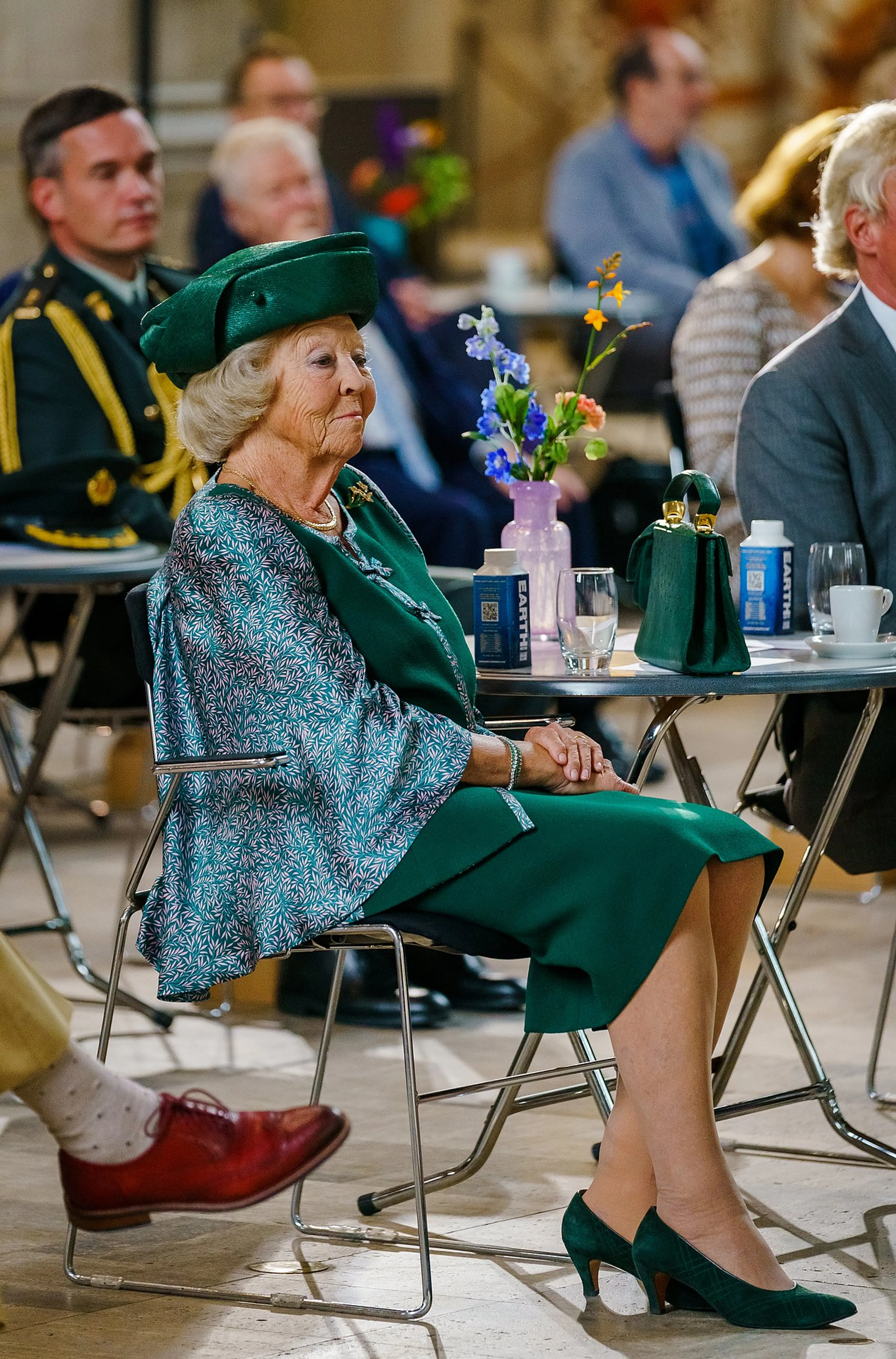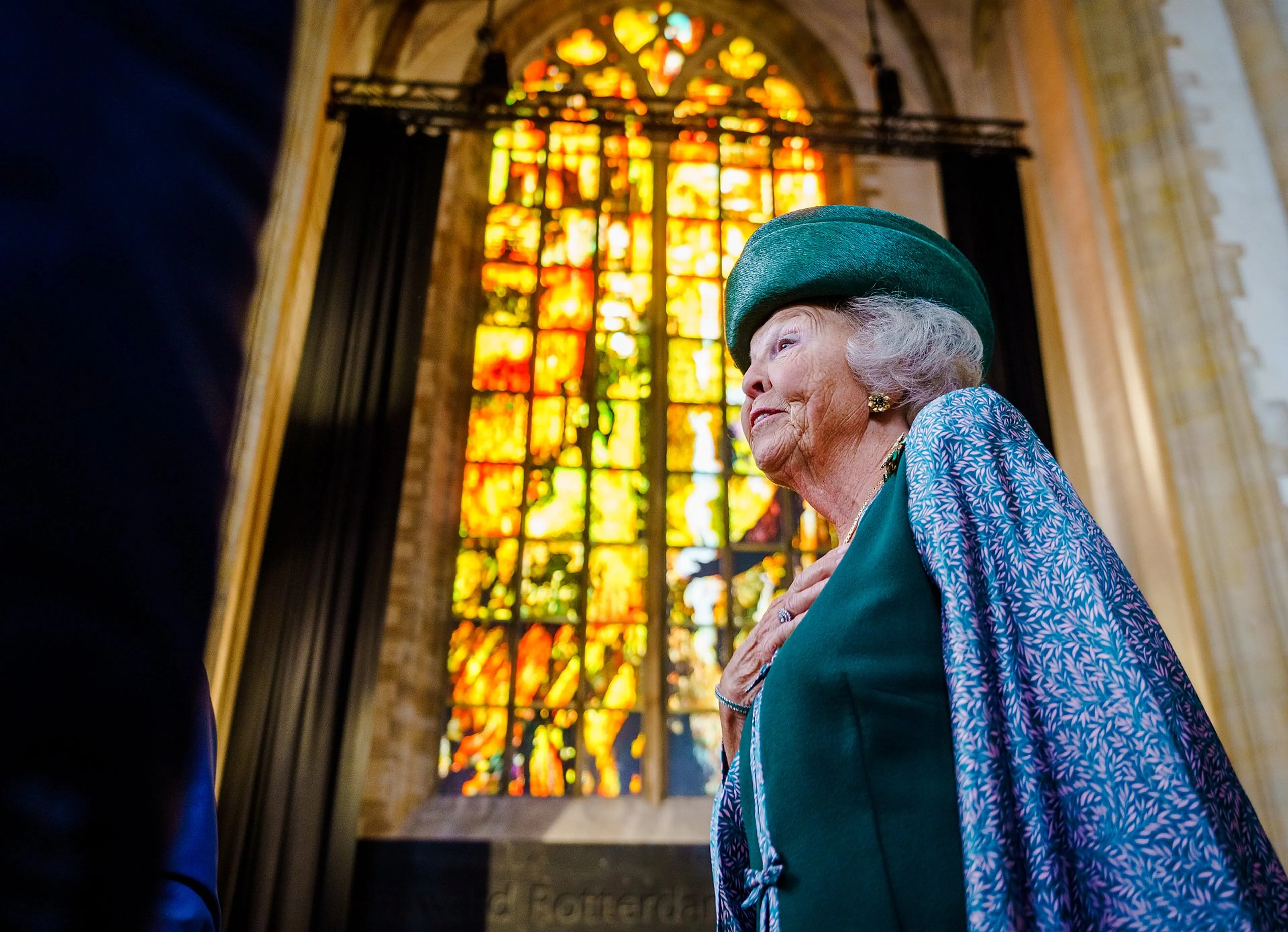Prinses Beatrix bij onthulling oorlogsraam Laurenskerk