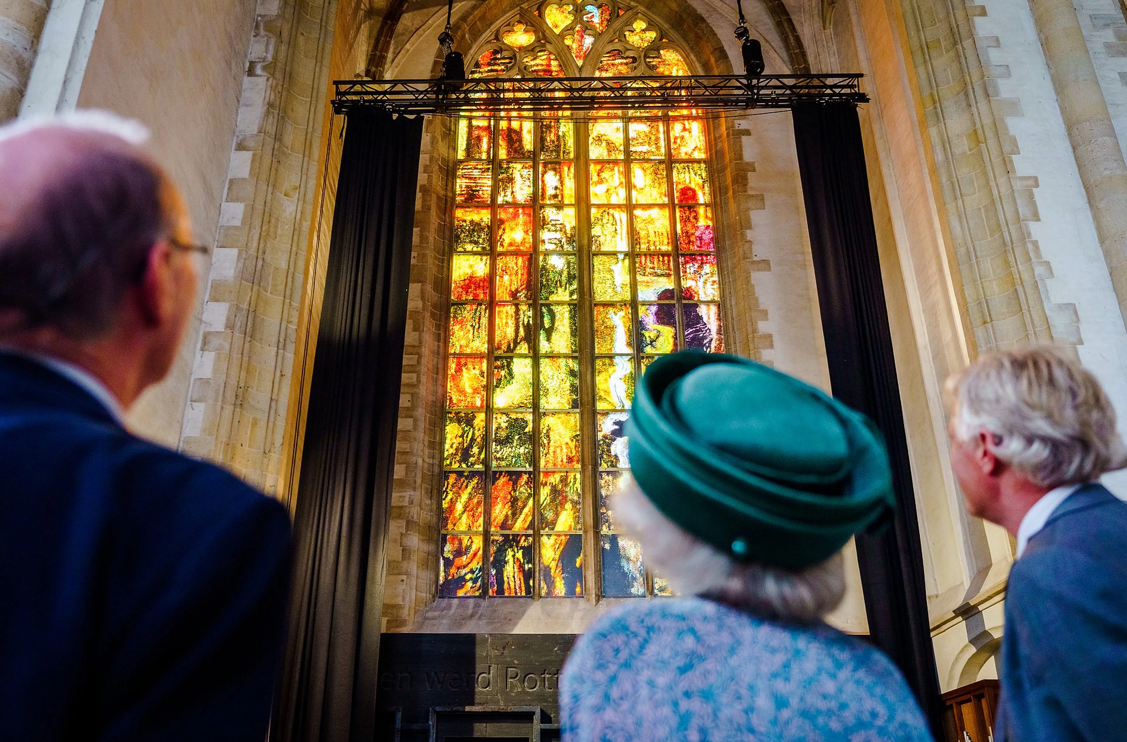 Het onthulde raam herdenkt de bombardementen tijdens de Tweede Wereldoorlog op de steden Rotterdam, Coventry en Dresden. De oud-vorstin sprak met voorzitter Wubbo Tempel van de Laurenskerk en kunstenaar Janneke Viegers over het maakproces van het gebrandschilderde raam.