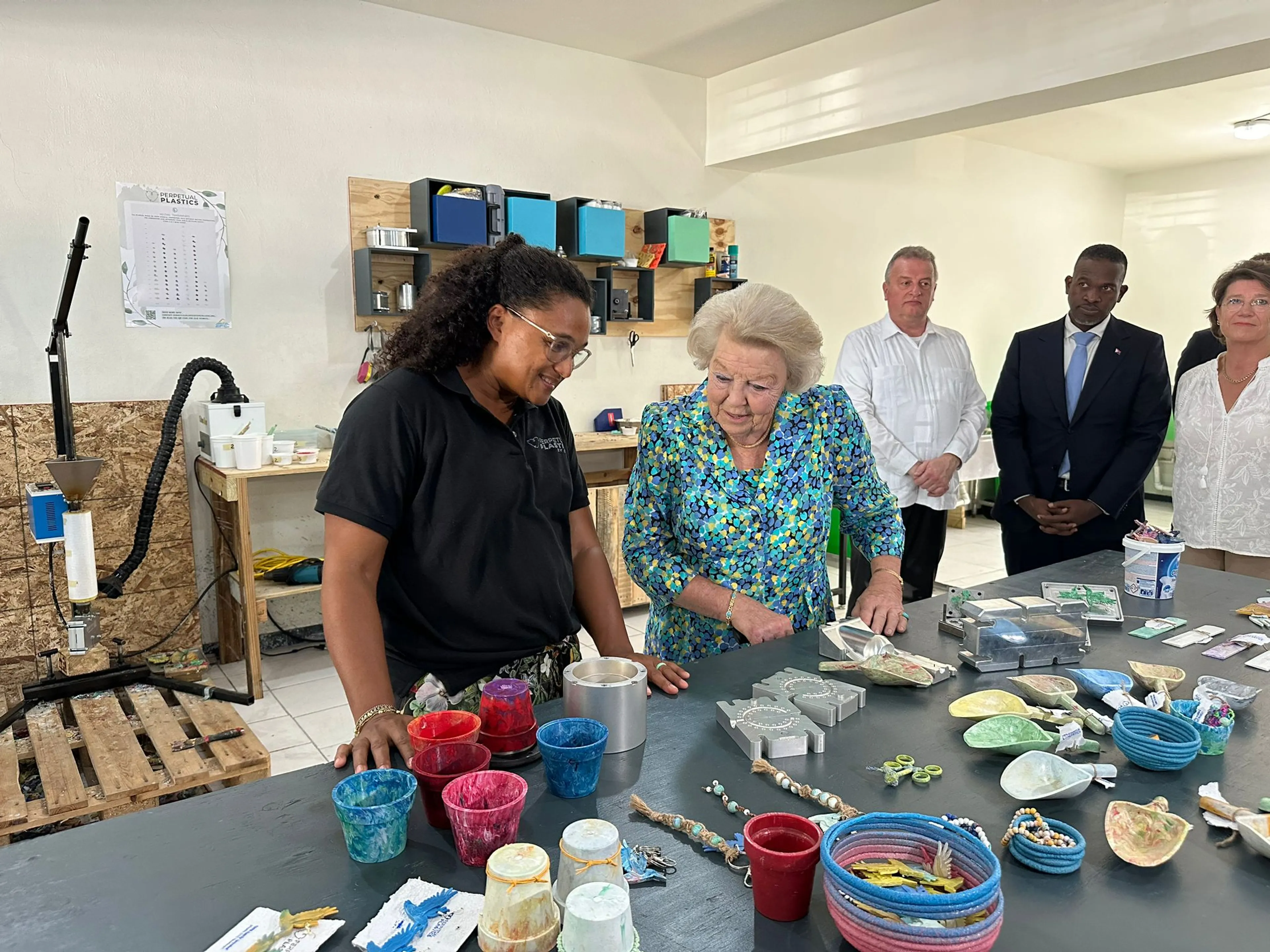 In de middag bezocht prinses Beatrix het Perpetual Plastics project van EPIC Sint Maarten, een NGO die werkt aan natuurbehoud en milieueducatie. Op deze sociale werkplaats wordt lokaal plastic gerecycled tot bruikbare items. De prinses kleedde zich voor de gelegenheid om in een andere outfit. Het betrof wederom een blauwe blouse met een vrolijke print. Tropenmode, alom.