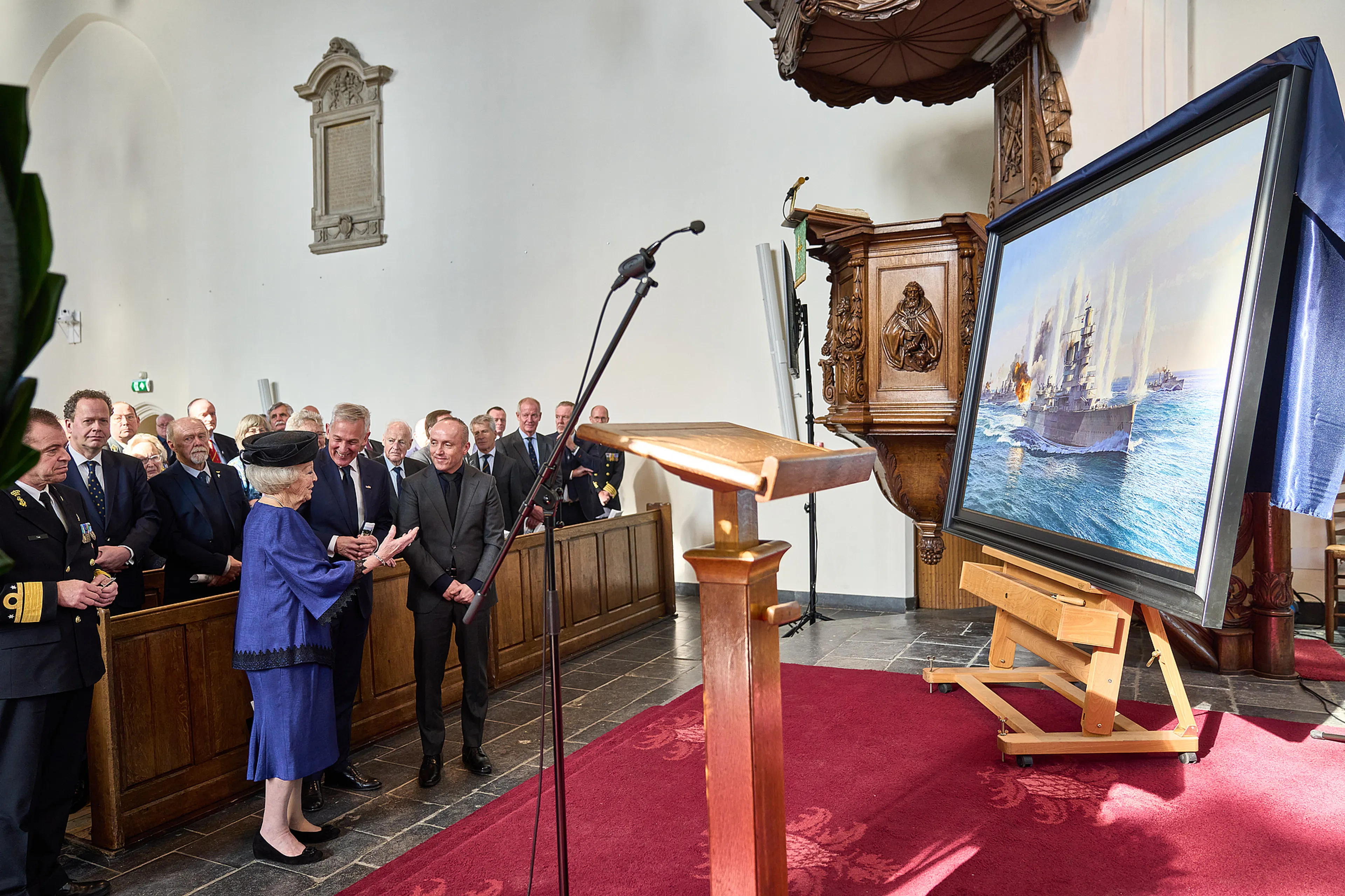 Daarna kreeg de prinses een toelichting op een schilderij waarop een beslissend moment tijdens de slag is afgebeeld. Dat doek zal onderdeel worden van een permanente expositie in het Marinemuseum over de marine vanaf het begin van de Tweede Wereldoorlog tot nu. Afsluitend ging Beatrix in gesprek met enkele overlevenden en nabestaanden.