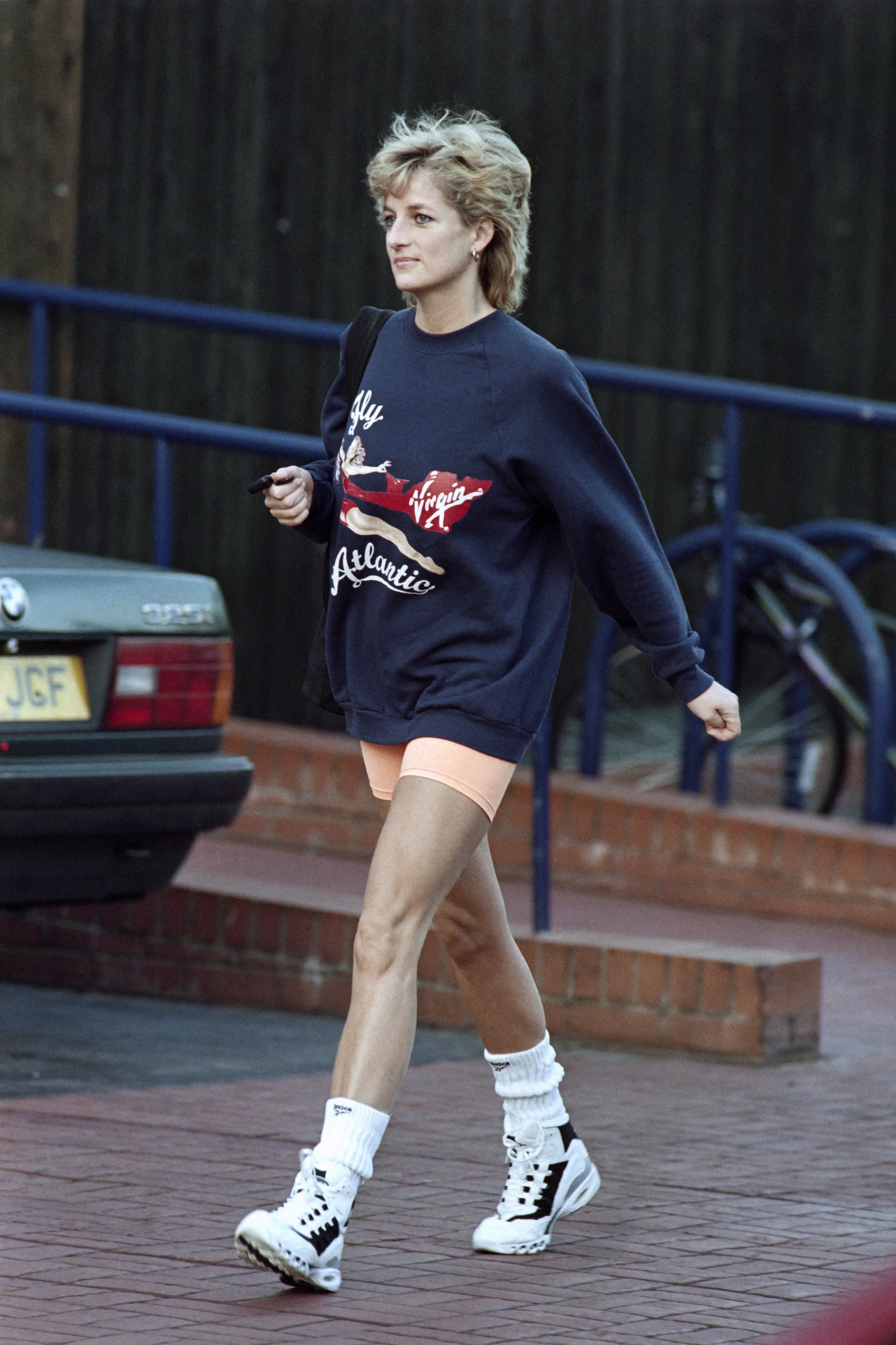 Alhoewel ze haar praktische blokhakken na haar scheiding met Charles met liefde inruilde voor een hoger exemplaar, droeg prinses Diana nog steeds vaak haar geliefde sneakers. Onder haar iconische sportoutfit bijvoorbeeld die bestond uit een fietsbroekje en een oversized trui.