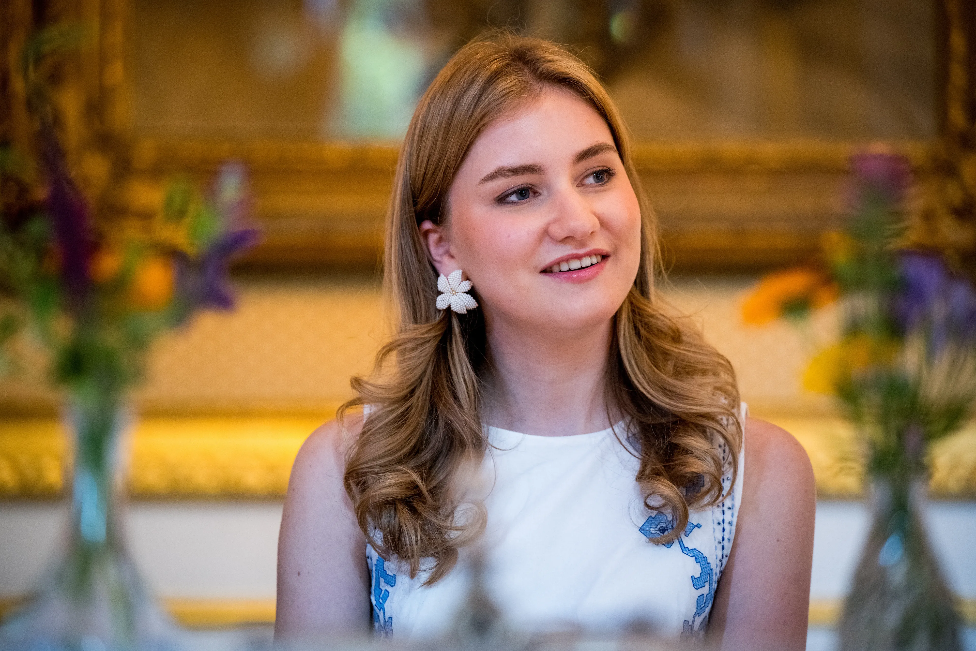 Elisabeth koos voor deze avond voor een zomerse look. Haar luchtige witte jurk is van kledingketen Zara. Op de stof zijn blauwe patronen geborduurd. Ook de open hakken van Elisabeth zijn in de kleur blauw. Die heeft ze overigens uit de garderobe van haar moeder, koningin Mathilde, gehaald. Net als haar oorbellen en handtas van Christian Dior.