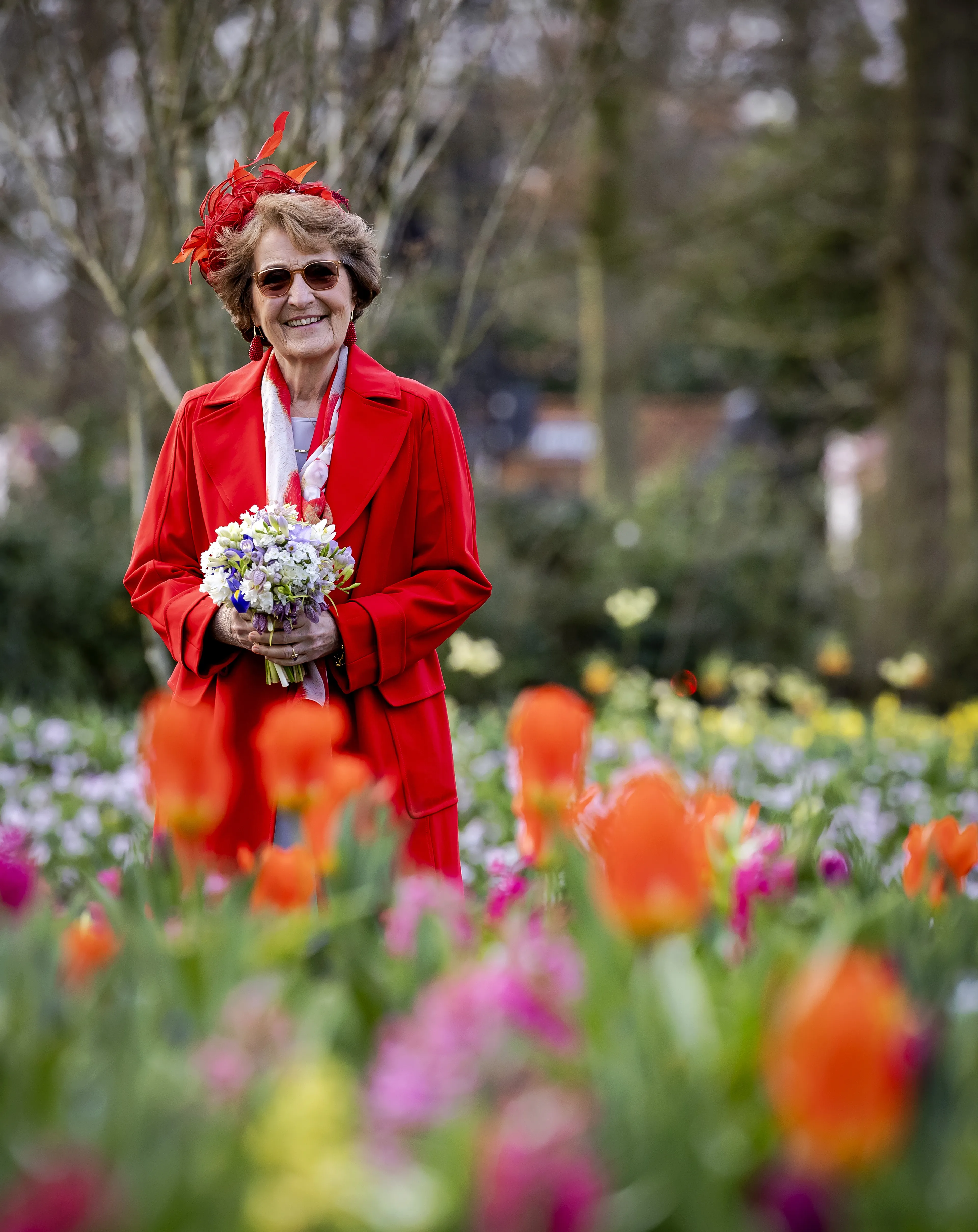 Prinses Margriet opent de tentoonstelling vandaag in een vrolijke voorjaarsoutfit. In haar rode trenchcoat en bijpassende haardecoratie doet ze niet onder aan de felgekleurde bloemen op de tentoonstelling.