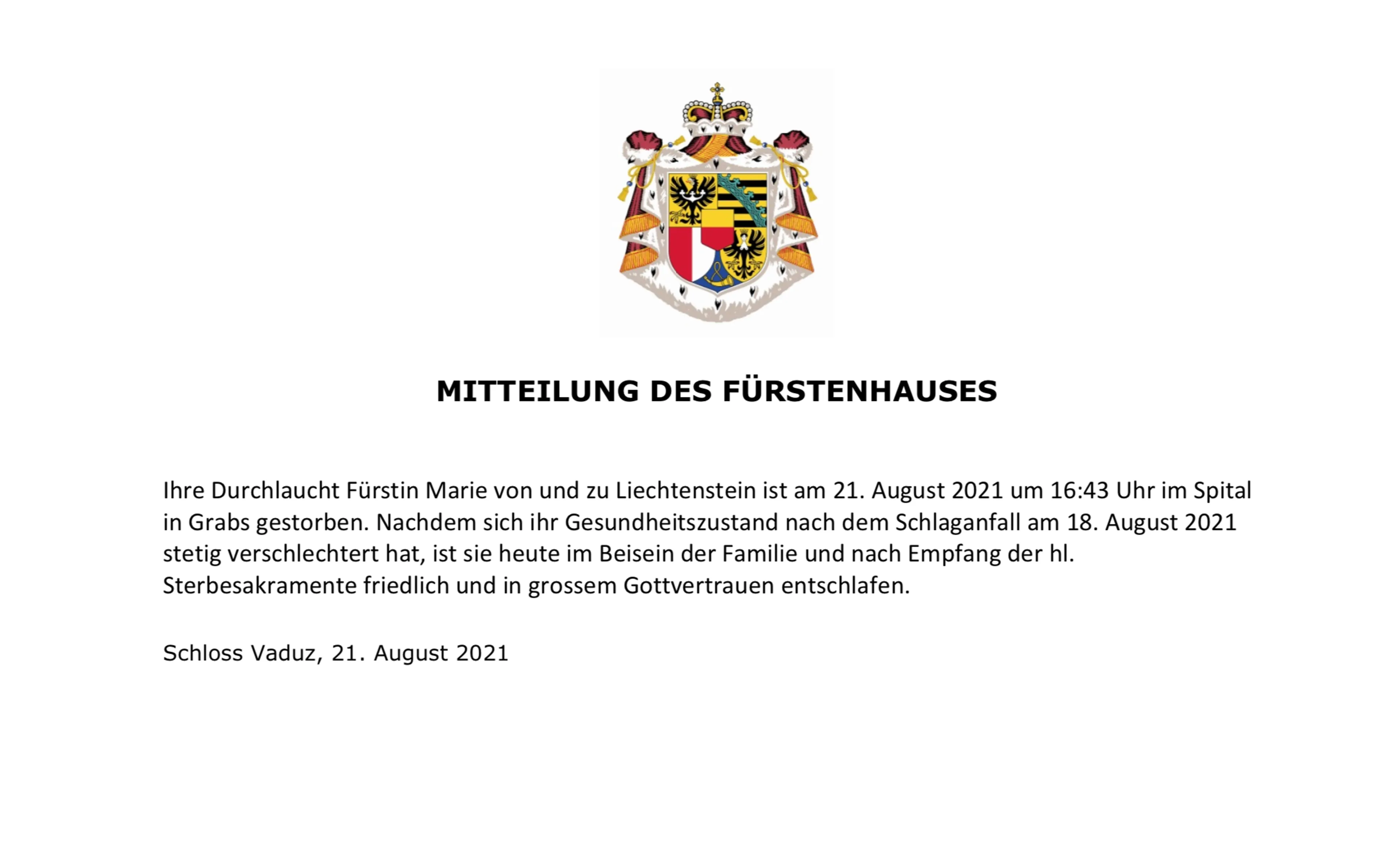 De prinses overleed zaterdagmiddag om 16:43 uur in een ziekenhuis in het Zwitserse Grabs. Dat gebeurde vredig en in het bijzijn van haar familie, aldus het hof.