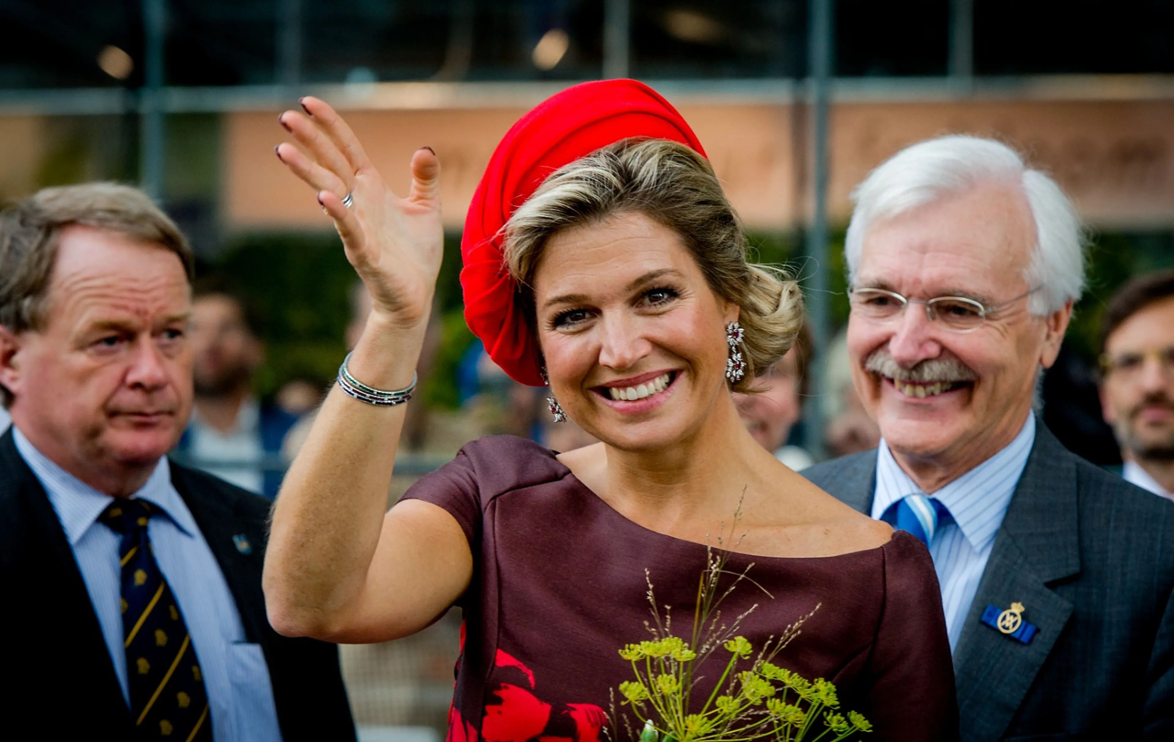 Prinses Laurentien droeg vandaag donker grijze japon, gemaakt door Hardies Couture Den Haag. Op de japon was een goud/zwart bloemenpatroon te zien. De hoge turban die ze draagt is gemaakt door Evelien Gentis.