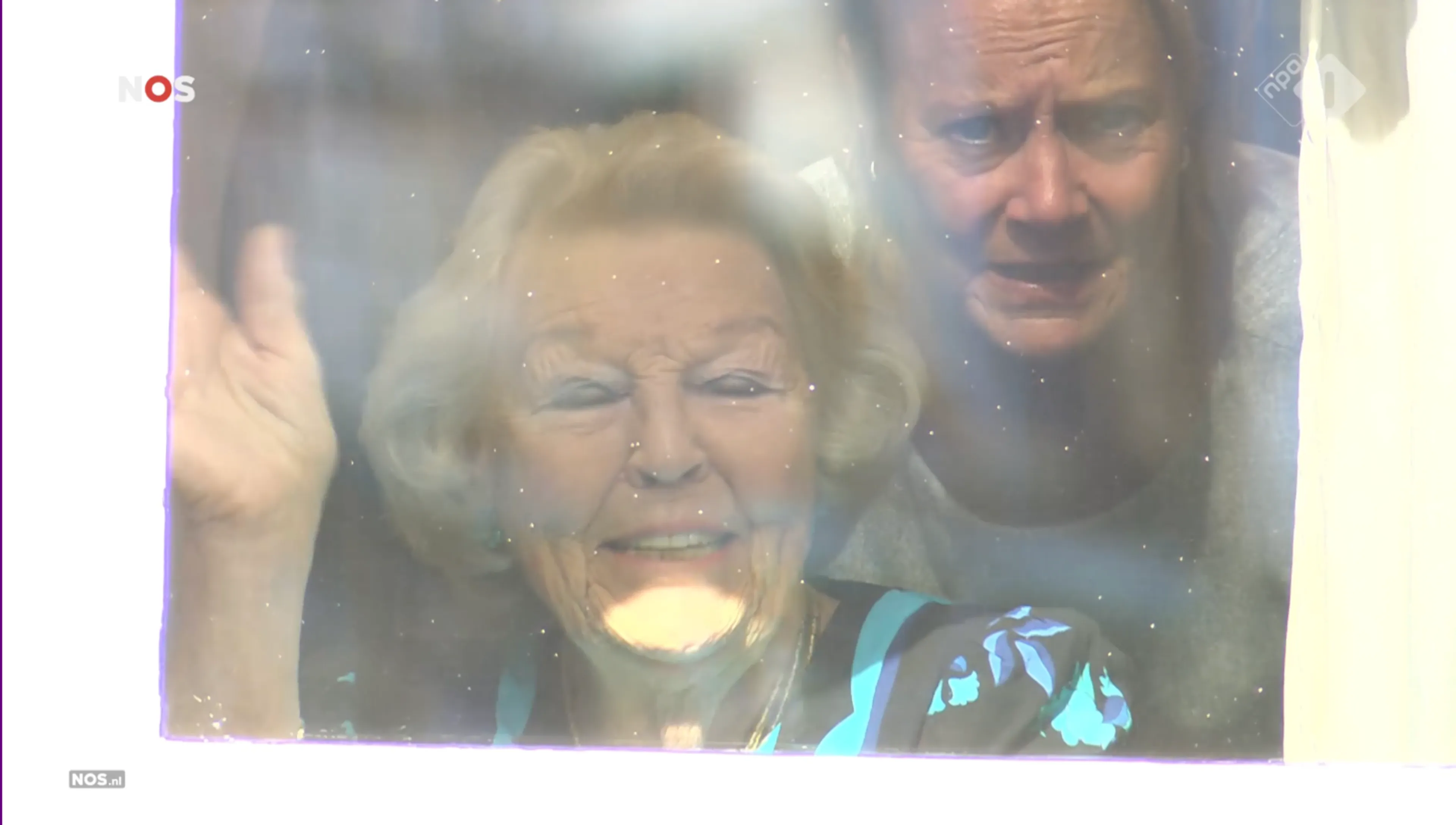 Prinses Beatrix kijkt vanuit een omliggend gebouw naar de voorbijtrekkende stoet en zwaait naar het publiek.